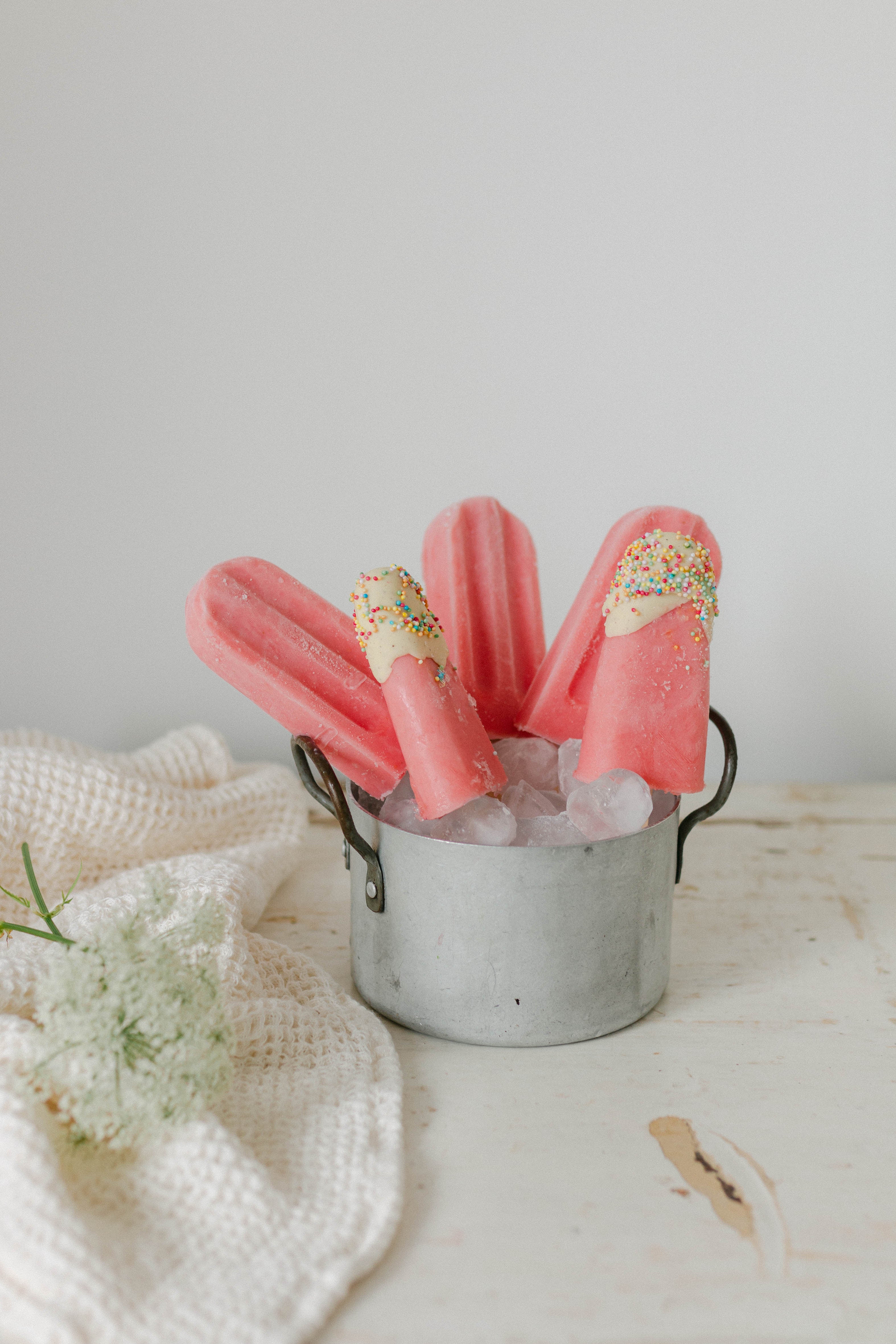 Once frozen, enjoy as they are or you may choose to do the next step and decorate your ice lollies. Melt the chocolate over a bain-marie. Let cool slightly. Dip the tip of your ice lollies in melted chocolate and sprinkle with hundreds and thousands before returning back to the freezer placed on a baking sheet lined with greaseproof paper to set.