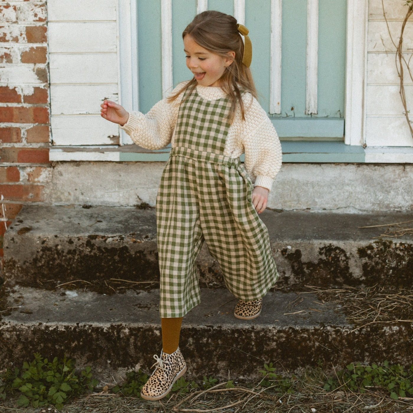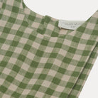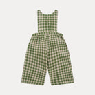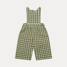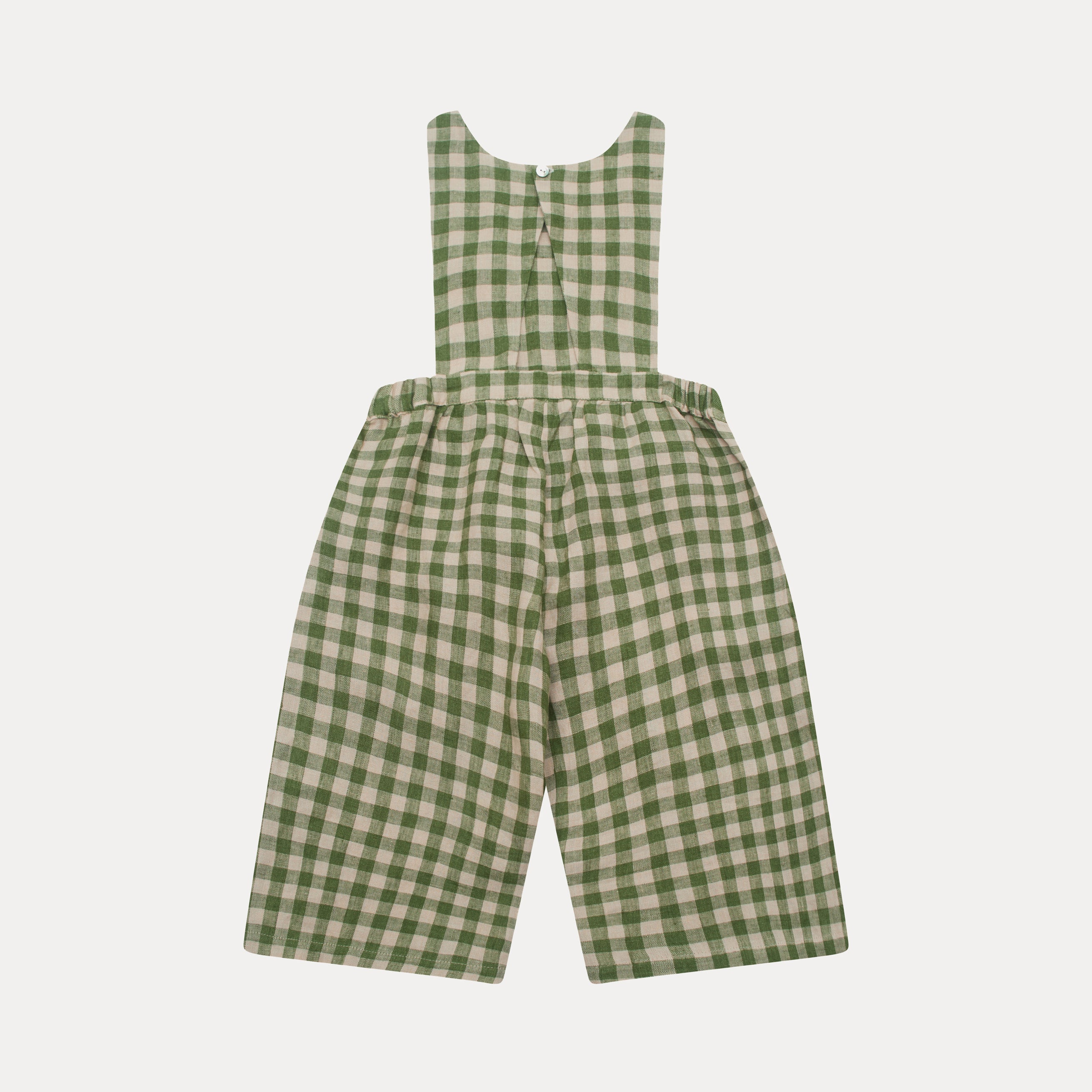 Tabard style bib overalls with gathered waist and wide leg culottes. Top does up through single mother of pearl button on the back of the neck and waist is elasticated at the edges for a loose, comfortable fit. Designed to sit just above the ankle and can be worn all seasons, perfect for layering in cooler weather or stripping back in the summer. Made from super soft pine & oat check OEKO-TEX certified linen – a mid green tone interwoven with a warm oat check.