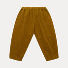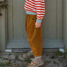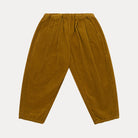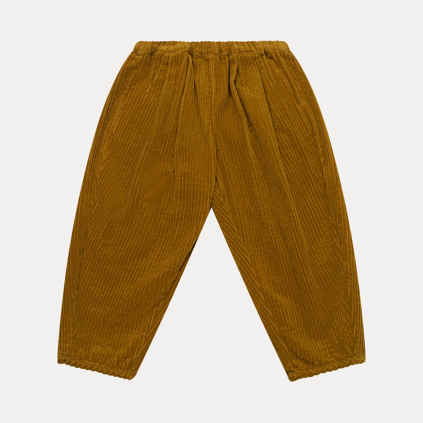 Easy wear, loose fit trousers with a pleated front, elasticated waist, and hidden side pockets. Tapered gently towards the hem with a bound edge for a neat finish. Made from super soft chunky Honeycomb cotton corduroy – a wide ridged cord in a rich, golden-toned yellow.