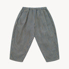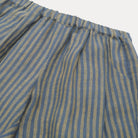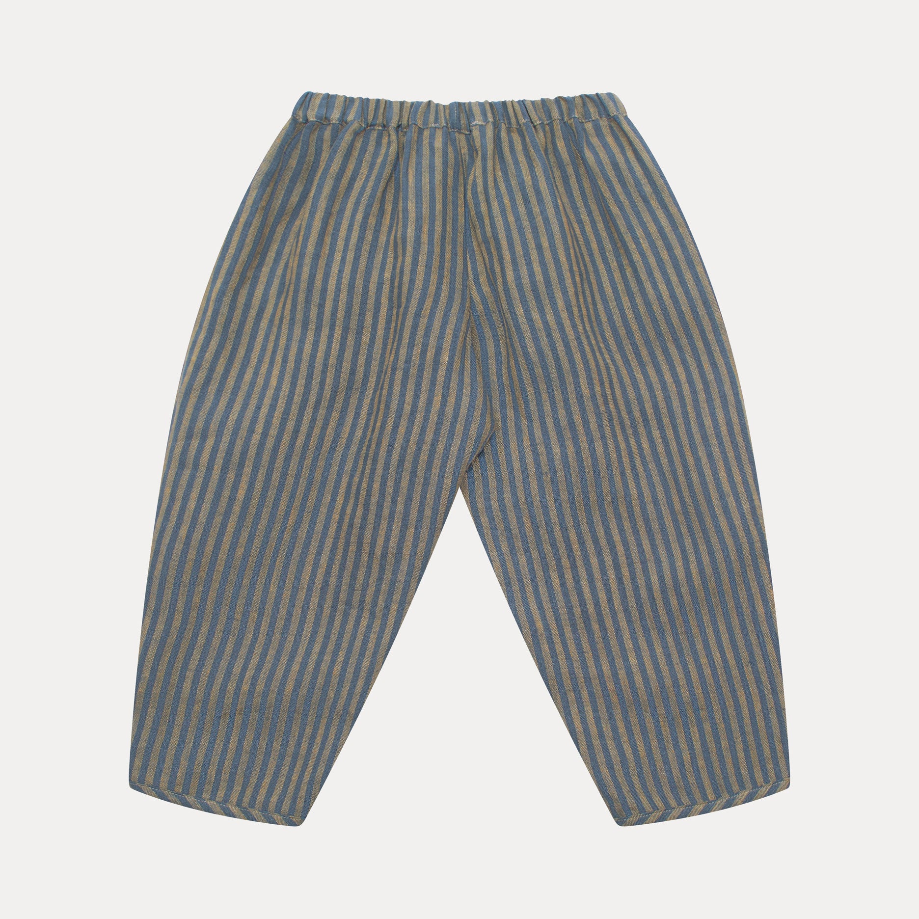 Easy wear, loose fit trousers with a pleated front, elasticated waist, and hidden side pockets. Tapered gently towards the hem with a bound edge for a neat finish. Made from beautifully soft, stonewashed blue & butter stripe OEKO TEX certified linen – a gently faded mid-tone blue paired with a soft, sun-washed yellow stripe.