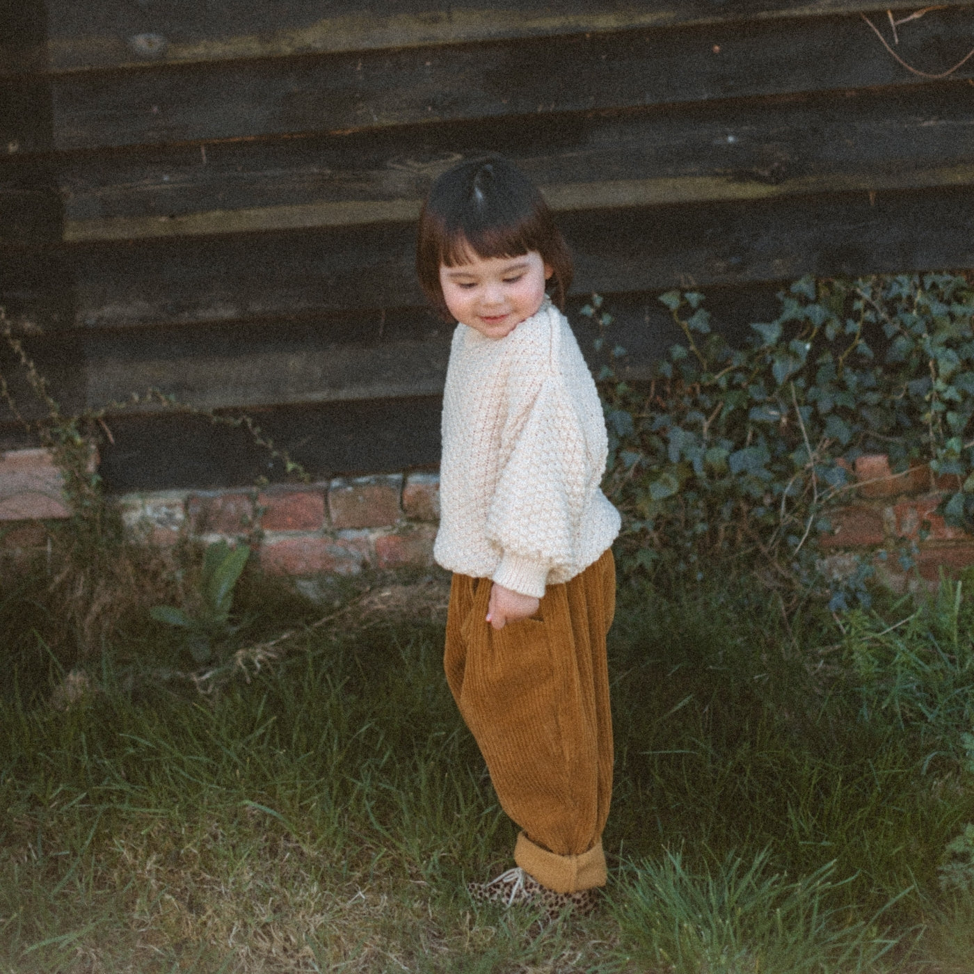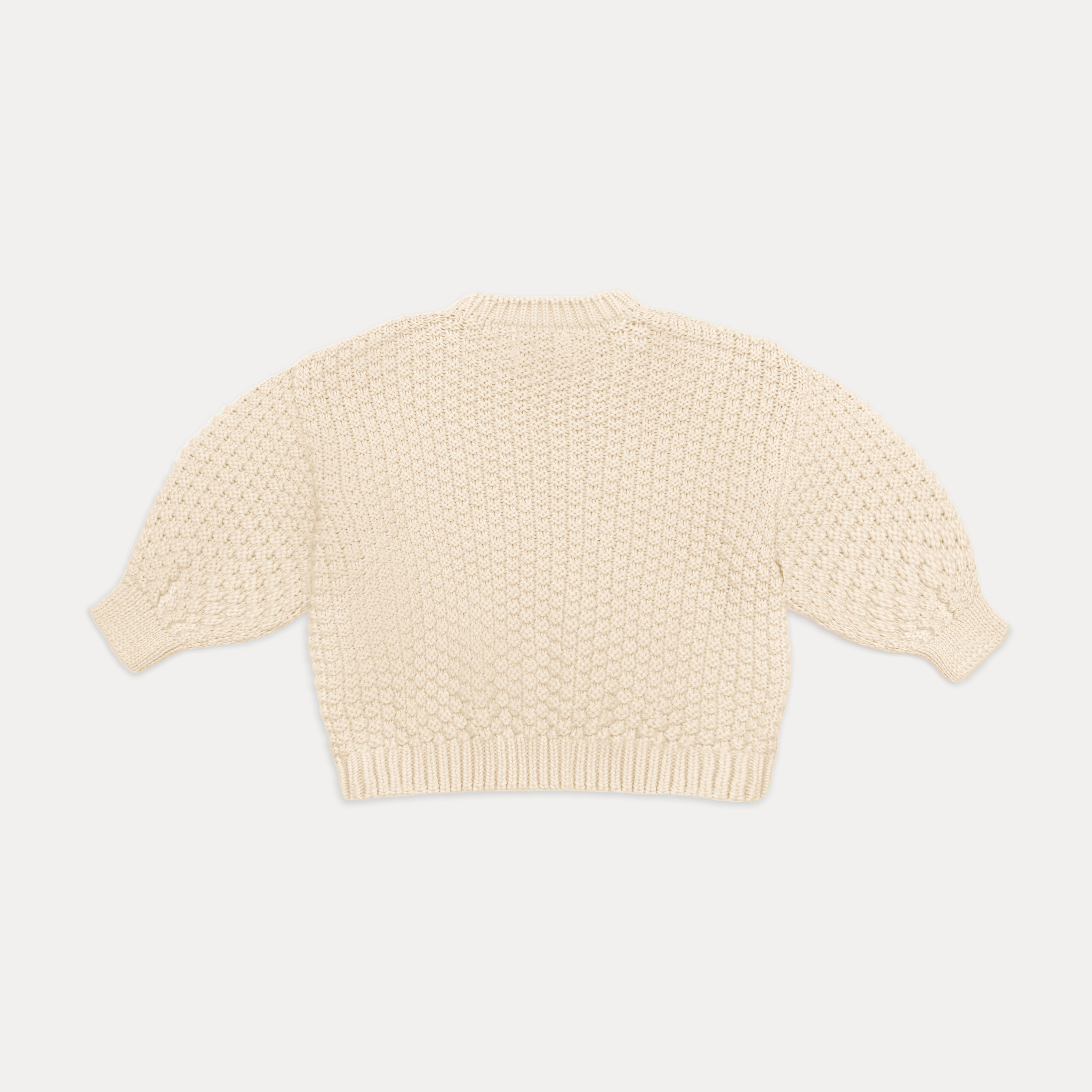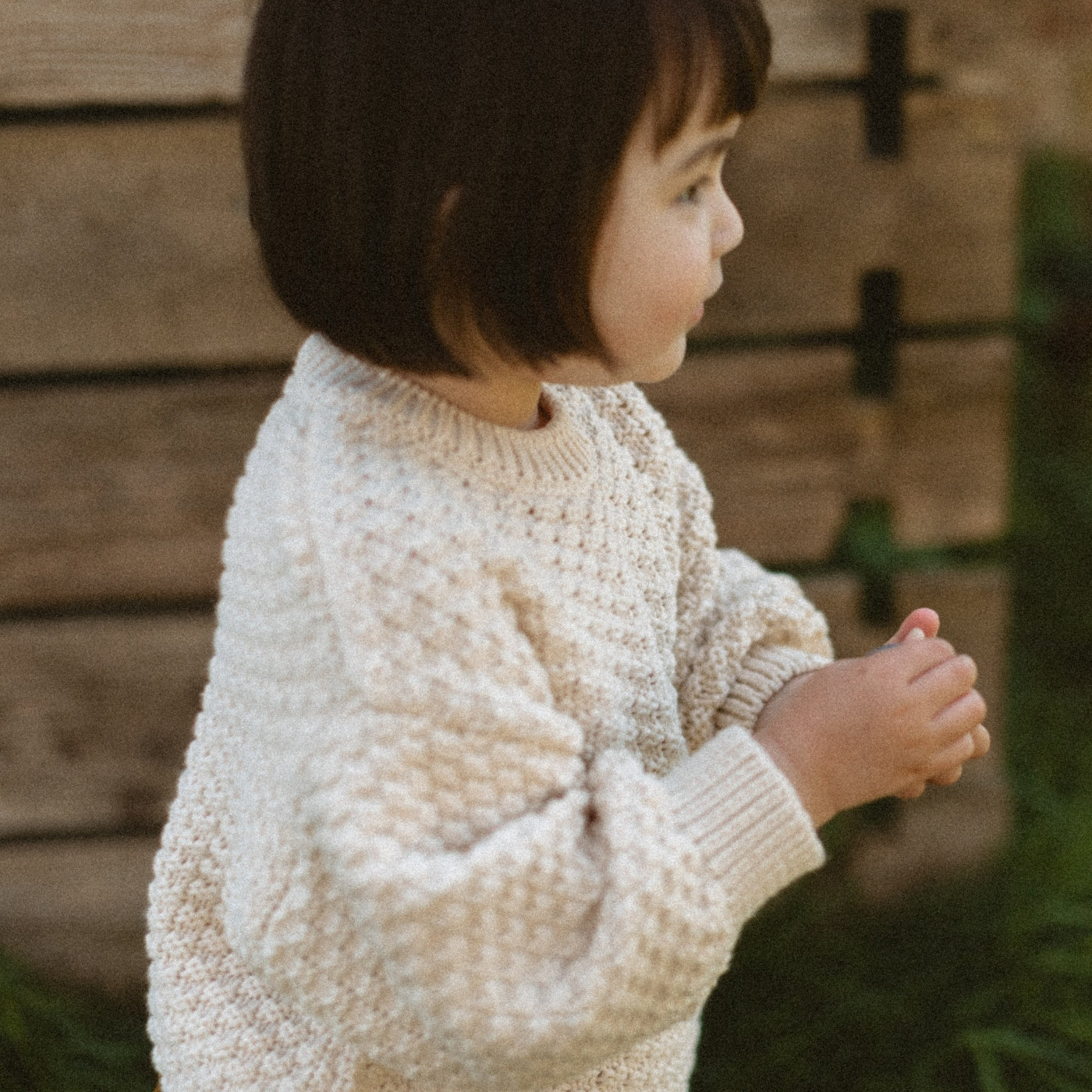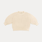 Simple, staple knitted jumper, with full sleeves and boxy shape. Beautiful chunky knitted stitch texture contrasts with the ribbed cuffs, neck and hem. Made from milk knitted organic cotton, a beautiful shade of warm white yarn.