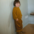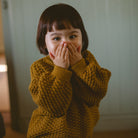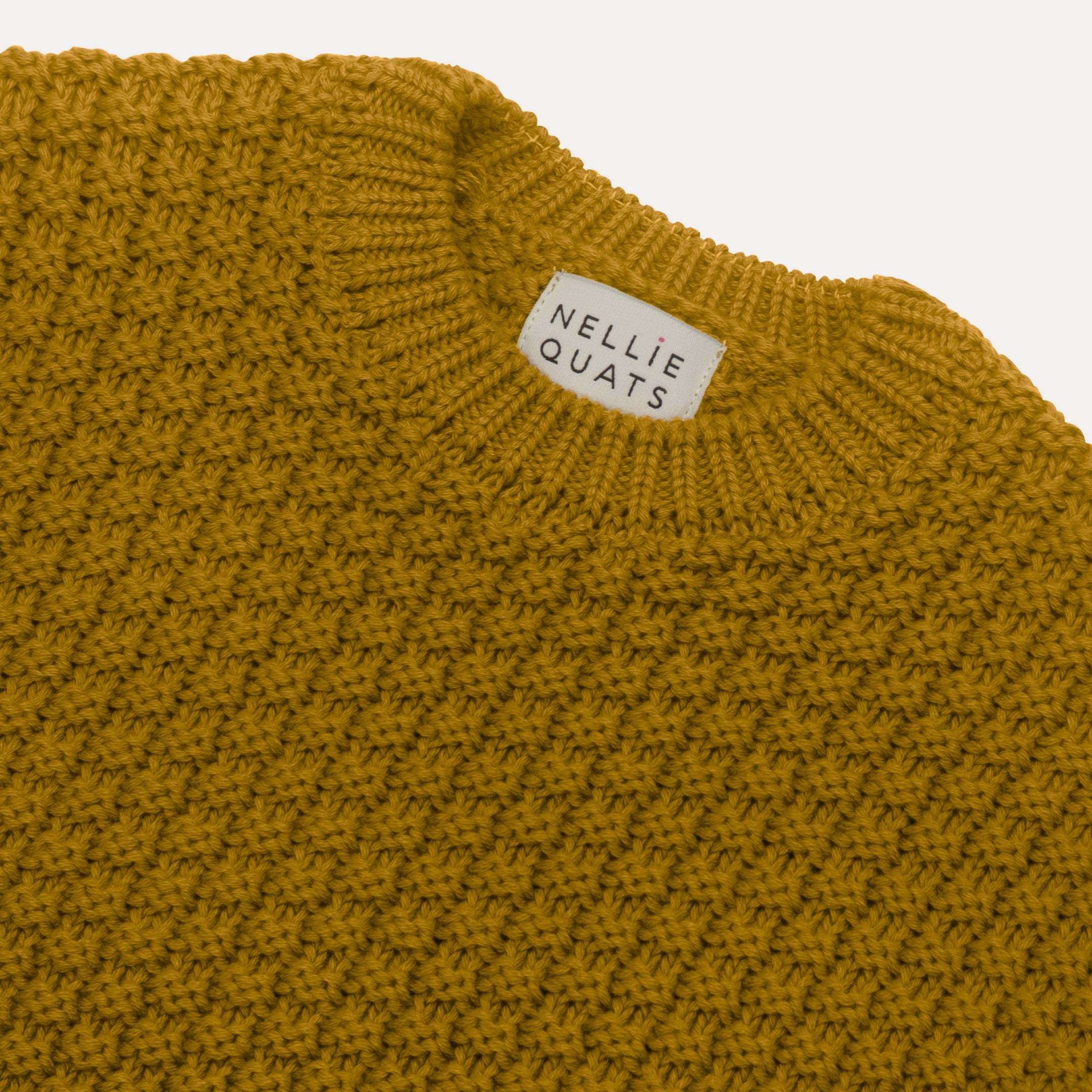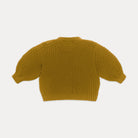 Simple, staple knitted jumper, with full sleeves and boxy shape. Beautiful chunky knitted stitch texture contrasts with the ribbed cuffs, neck and hem. Made from golden olive knitted organic cotton, a warm mustard yarn with green undertones.