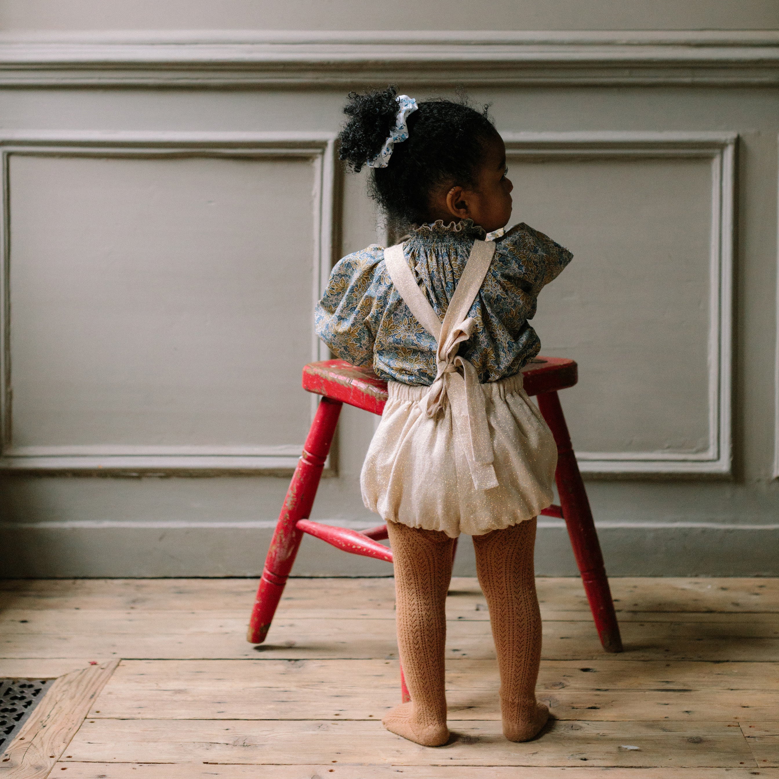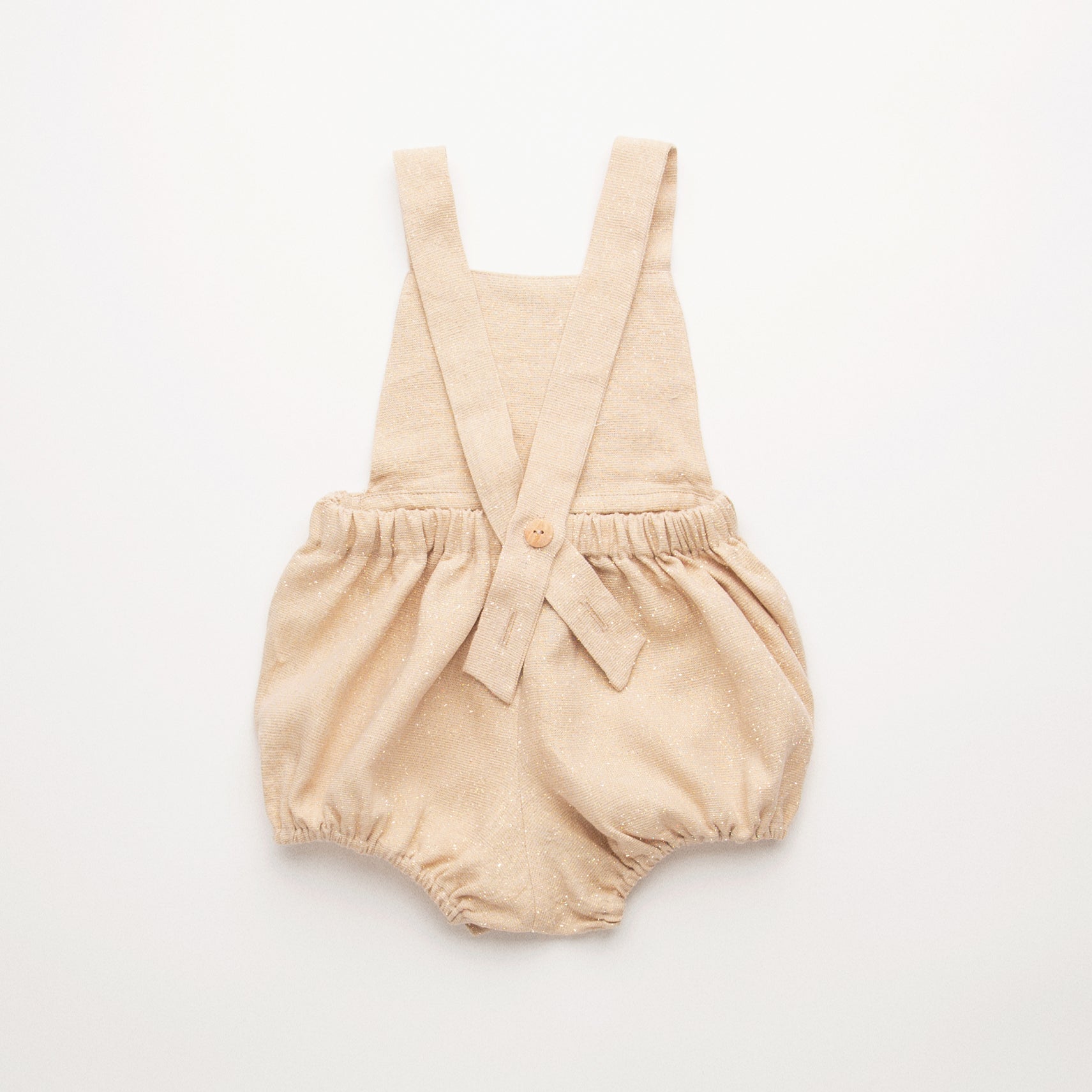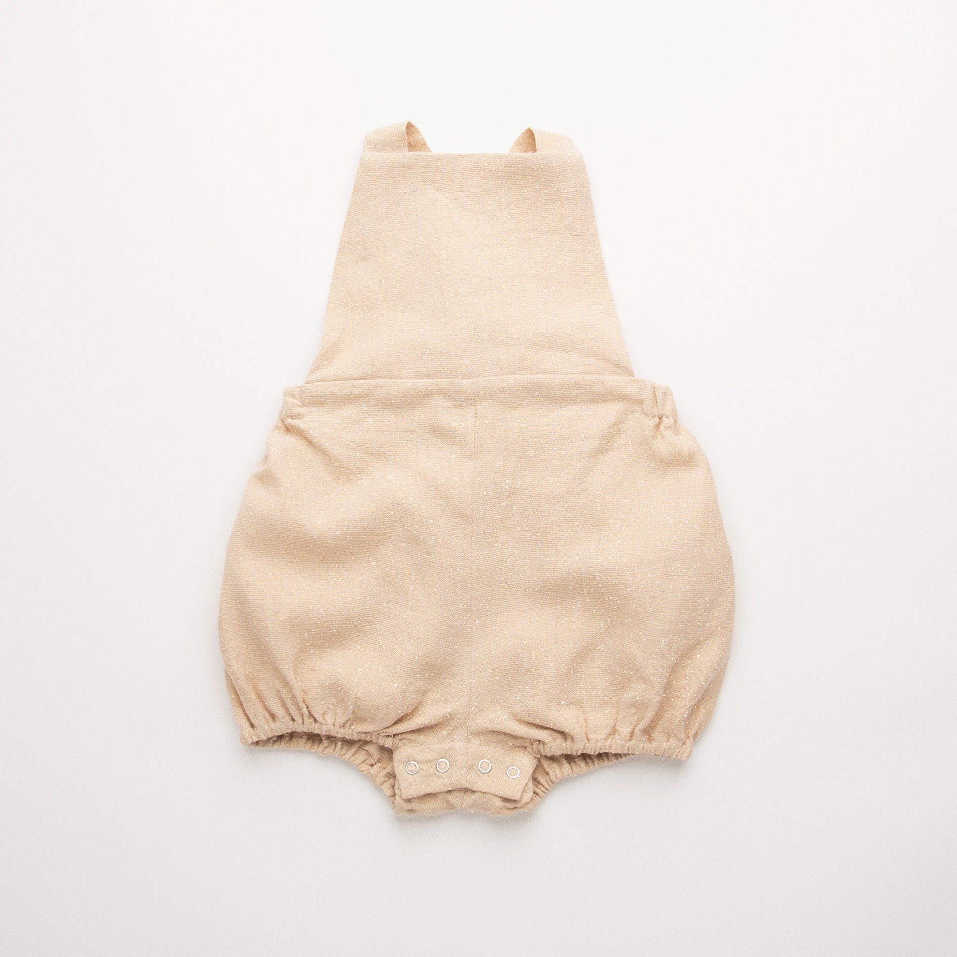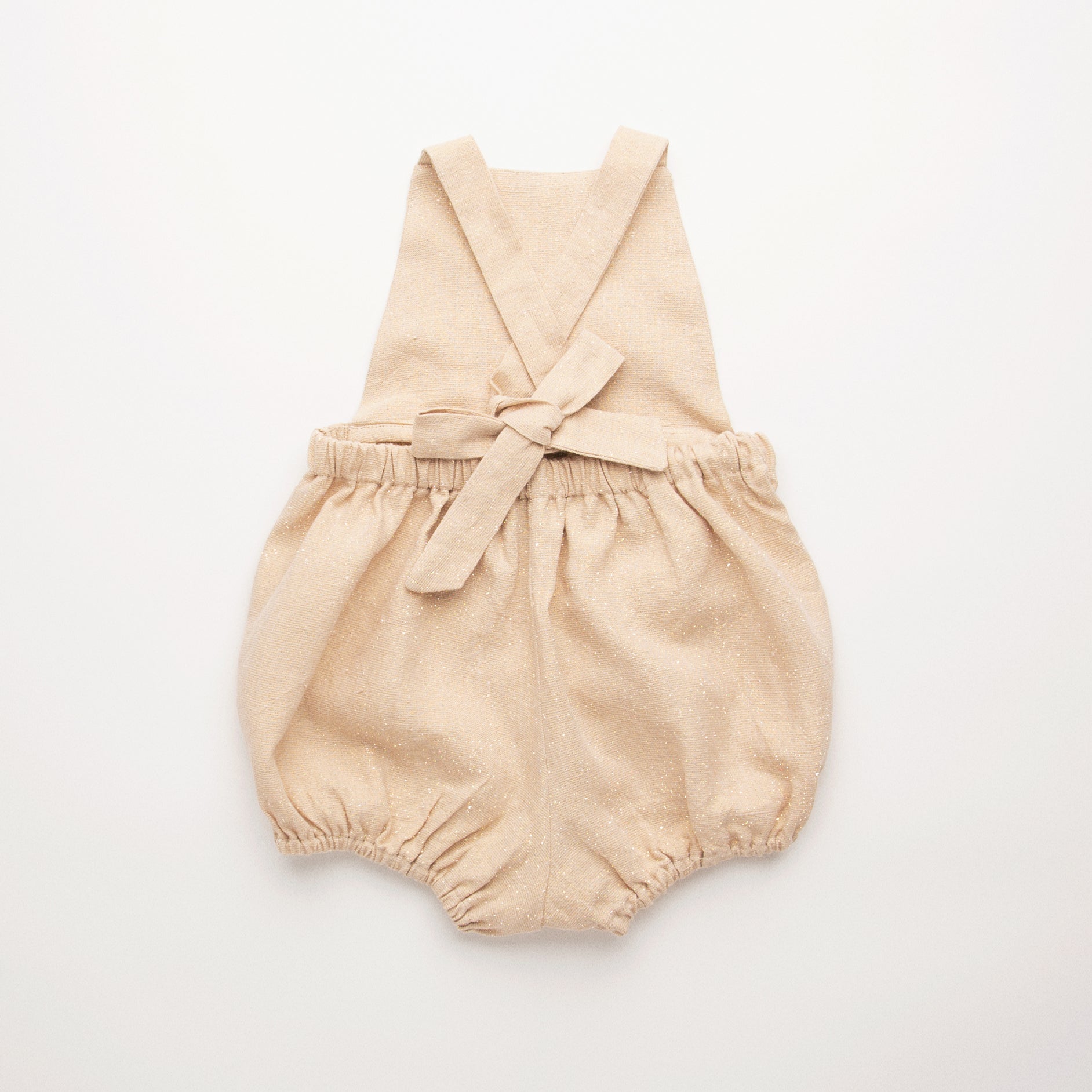 All in one romper, with bib front, elasticated waist and full bloomers with elasticated leg holes and poppers. Straps tie through loops at the back so fully adjustable (18-24M / 3-4Y). Smaller sizes fasten through a single button on the back, with buttonholes to adjust strap length (6-12M /12-18M). Designed to sit at the top of the thigh, perfect paired with tights in winter and without in the summer. Made from soft, sparkly gold linen - a cream coloured linen with gold thread running throughout.