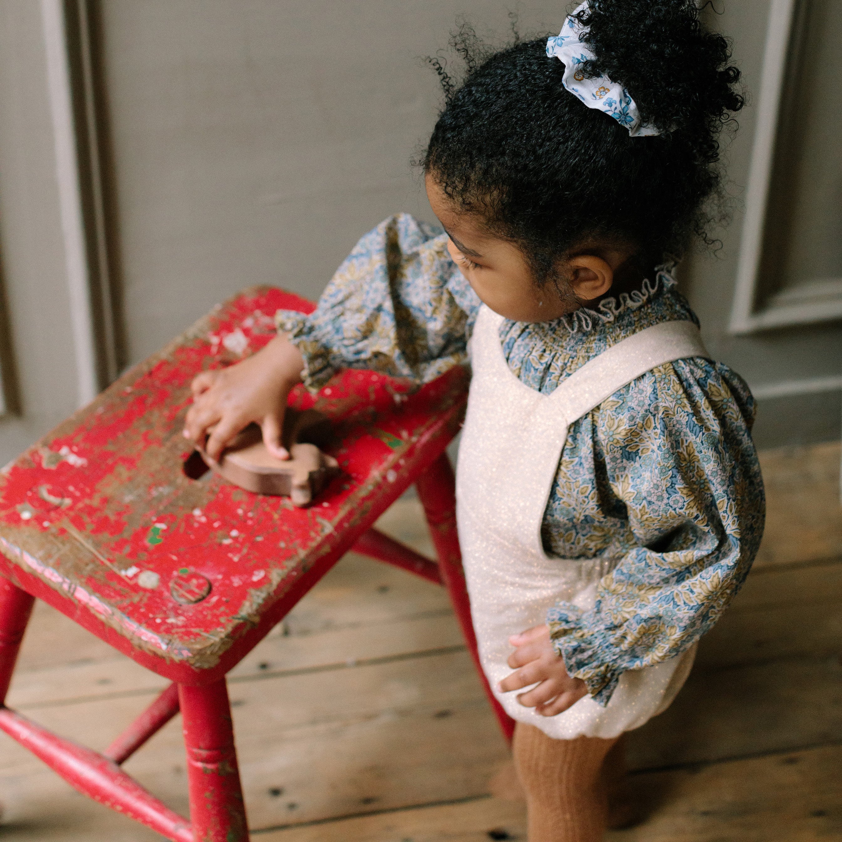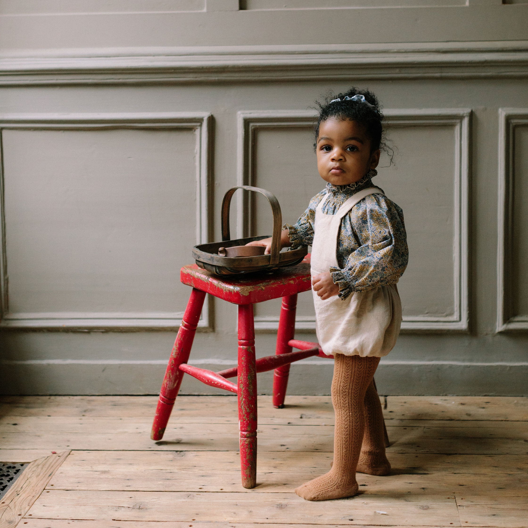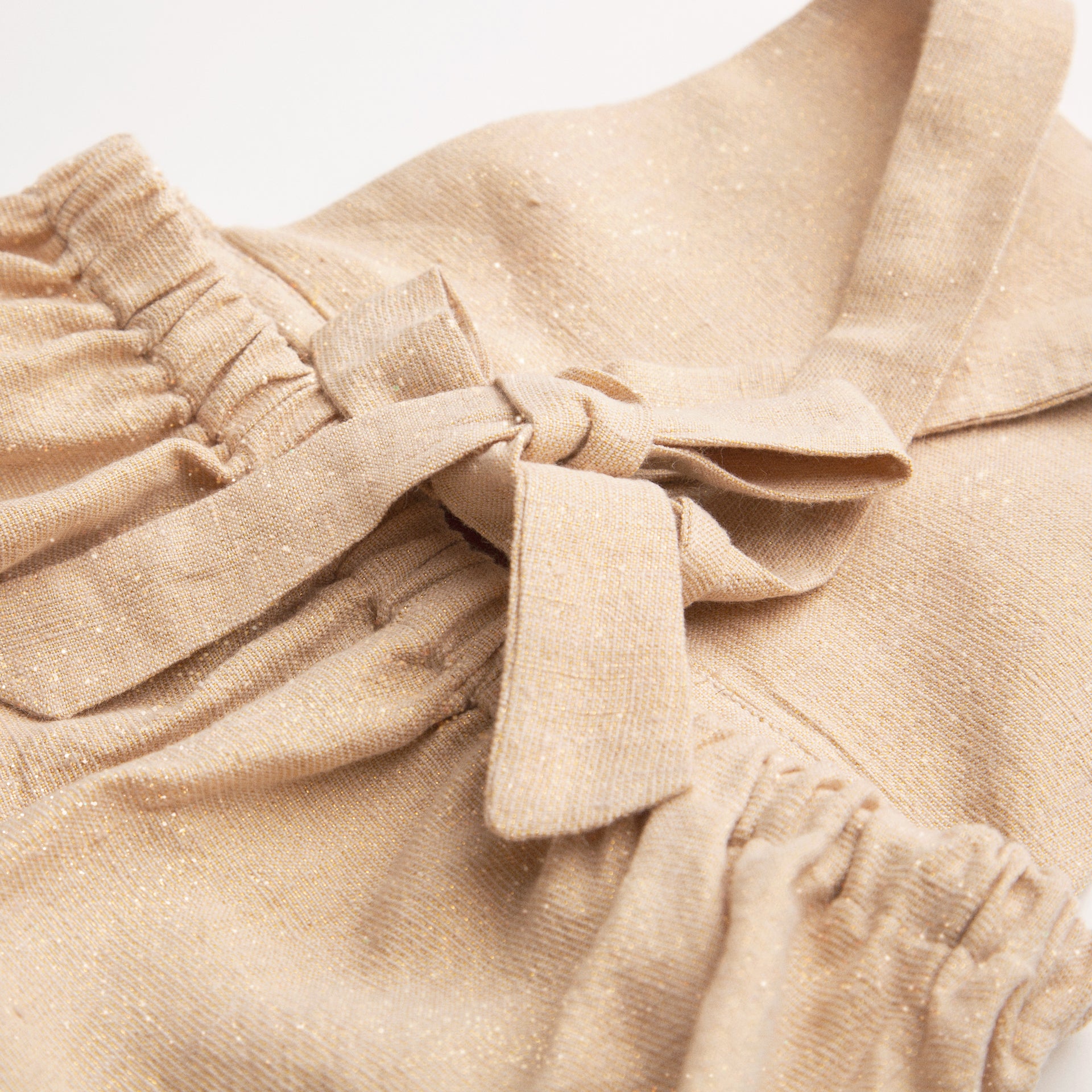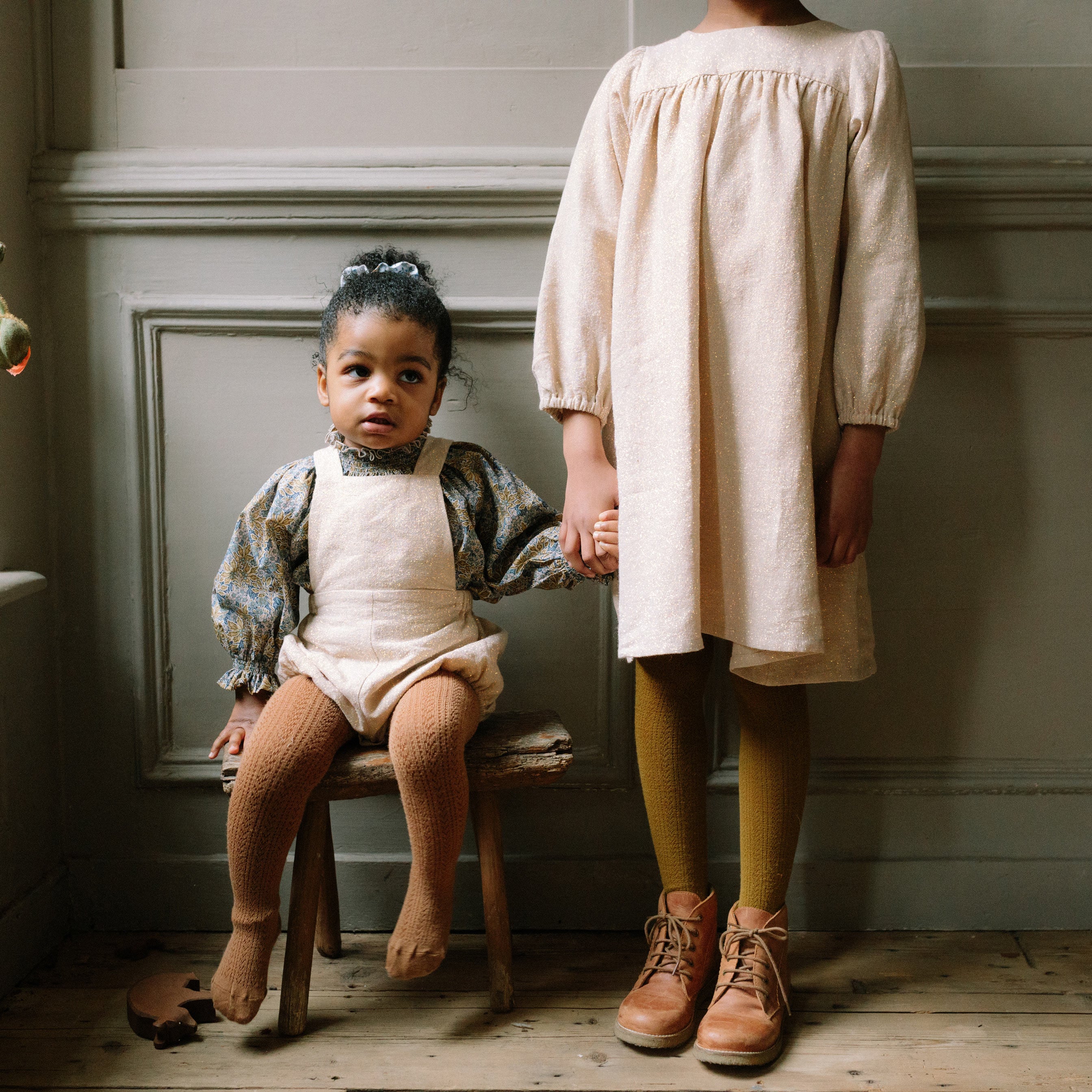 All in one romper, with bib front, elasticated waist and full bloomers with elasticated leg holes and poppers. Straps tie through loops at the back so fully adjustable (18-24M / 3-4Y). Smaller sizes fasten through a single button on the back, with buttonholes to adjust strap length (6-12M /12-18M). Designed to sit at the top of the thigh, perfect paired with tights in winter and without in the summer. Made from soft, sparkly gold linen - a cream coloured linen with gold thread running throughout.