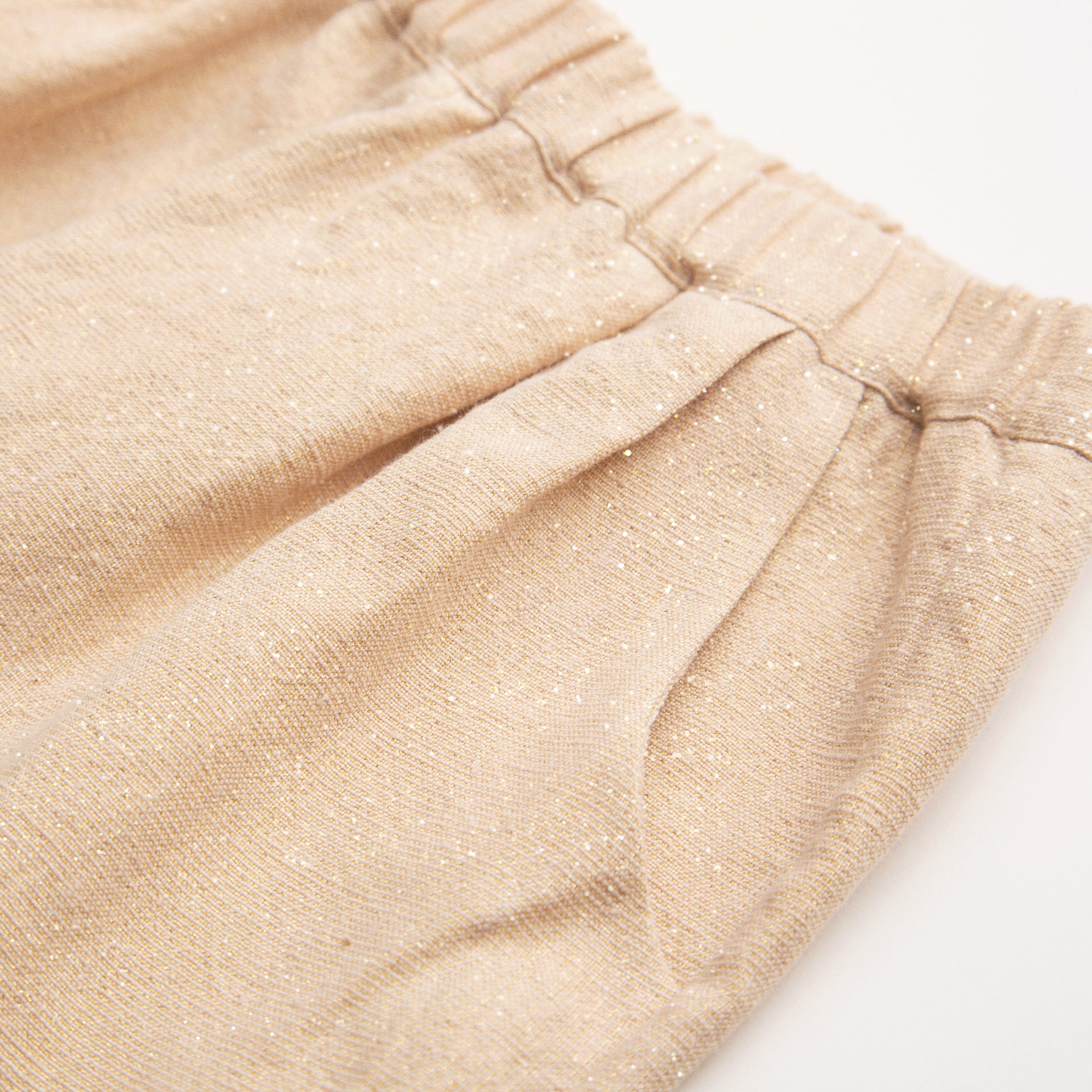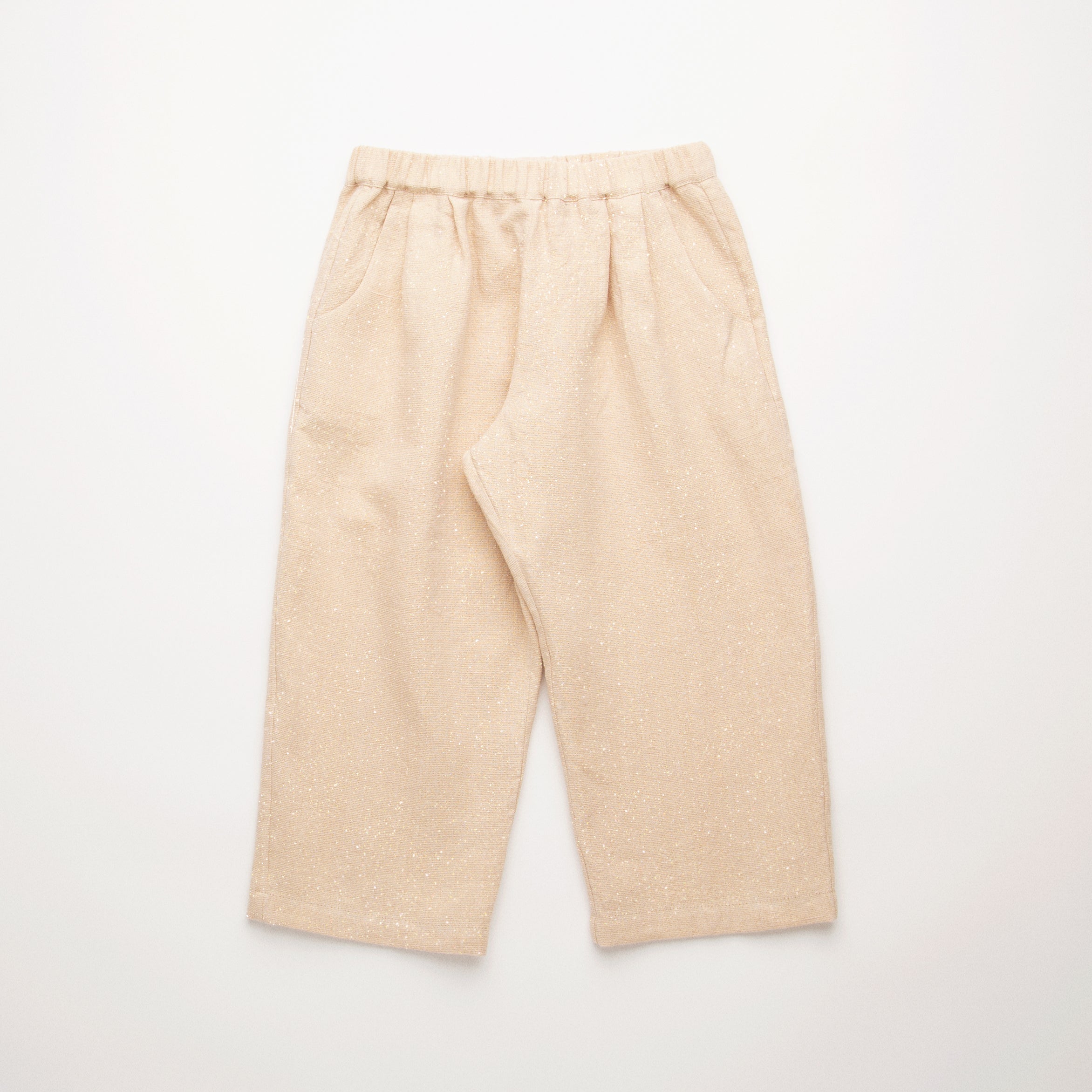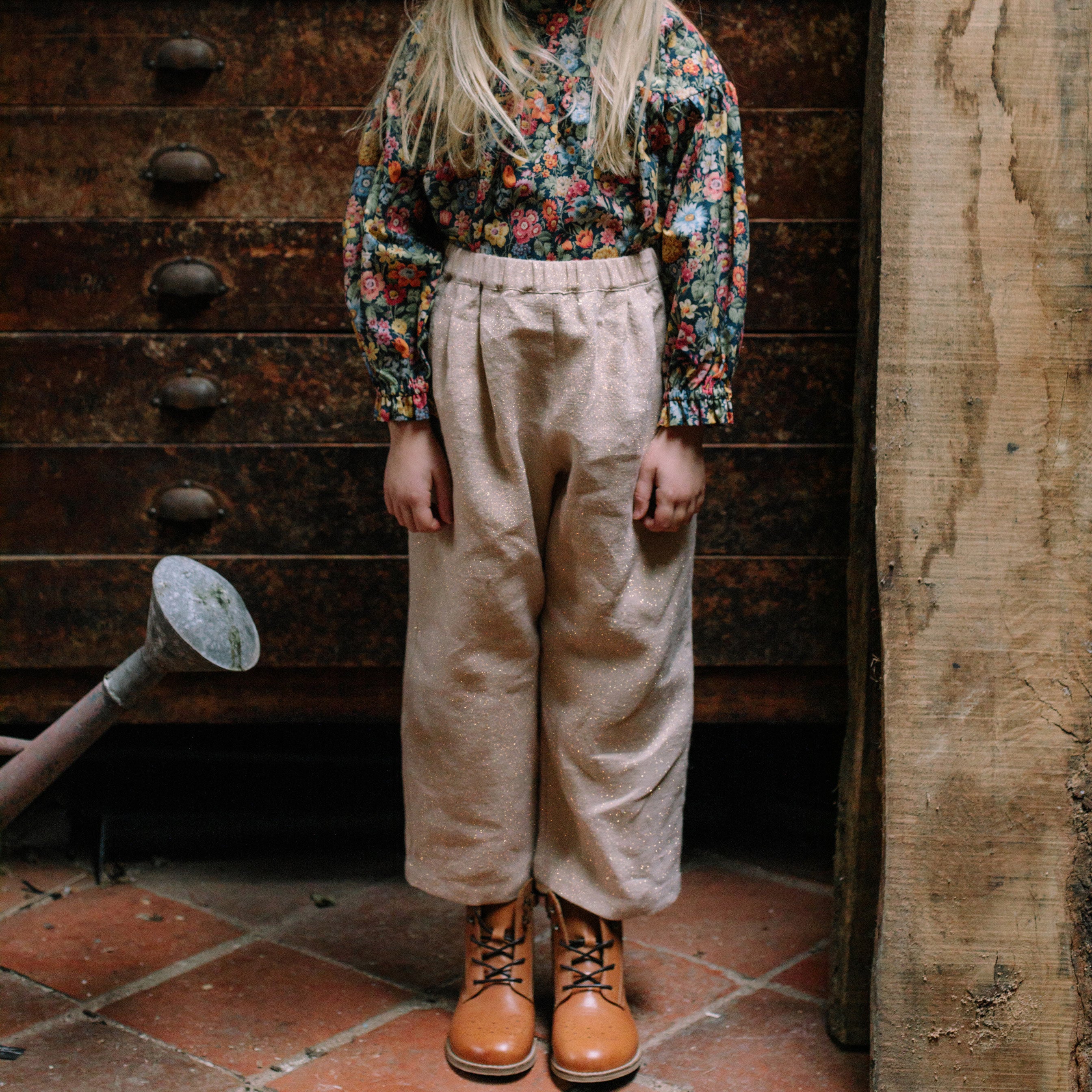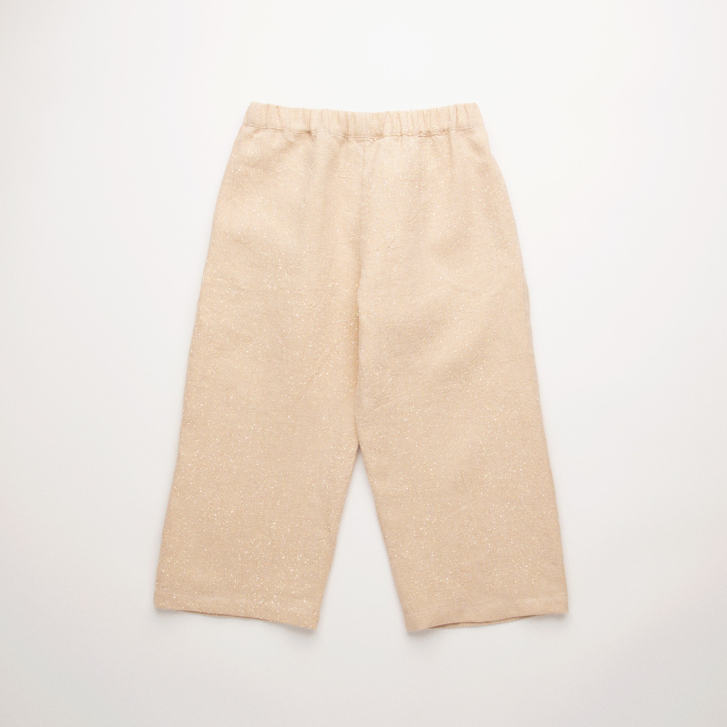 Easy wear wide leg trousers, with elasticated waist, hidden side pockets and front pleats. Designed to fit loosely and sit on or below the waist. Slightly cropped in length, designed to sit at or above the ankle. Made from soft, sparkly gold linen - a cream coloured linen with gold thread running throughout.