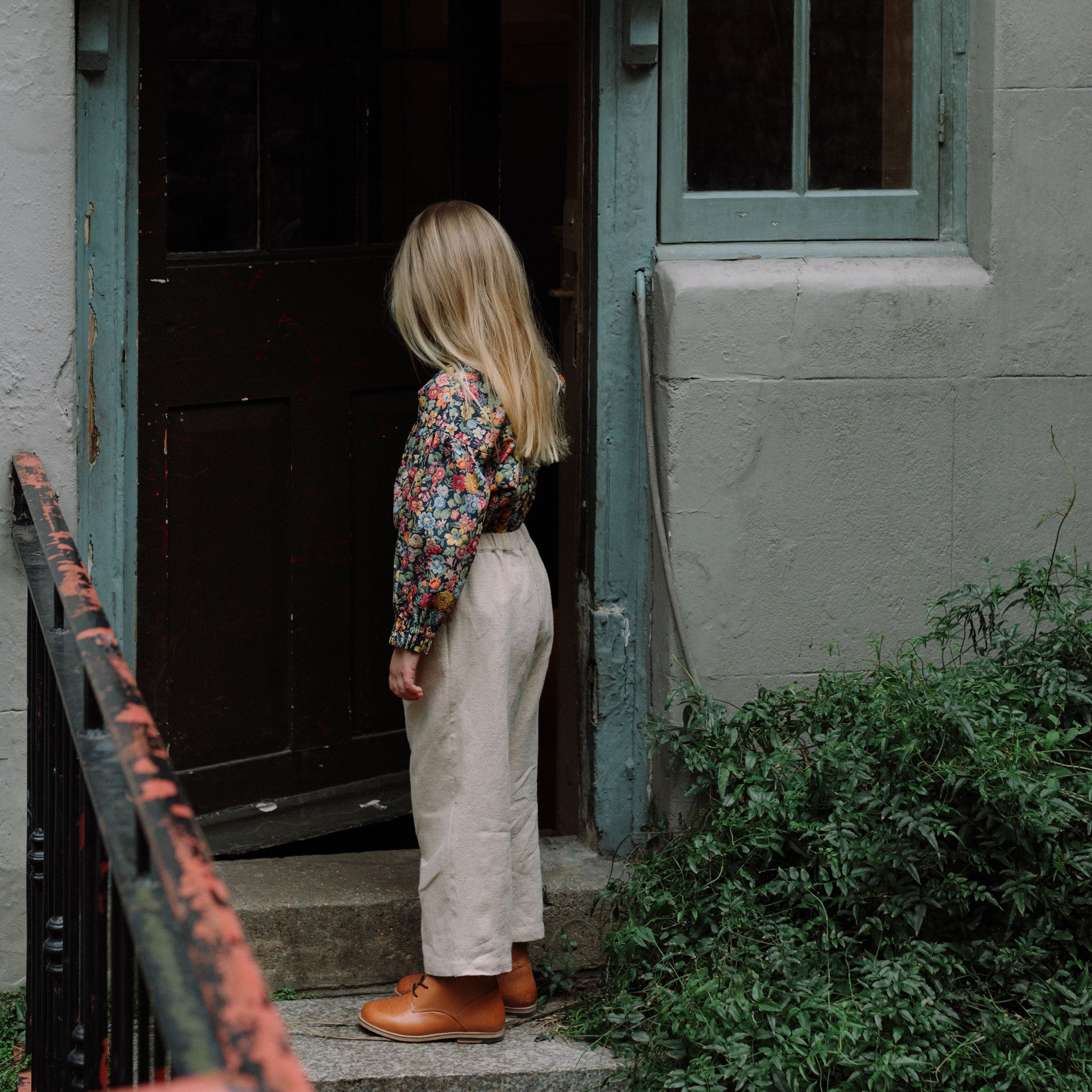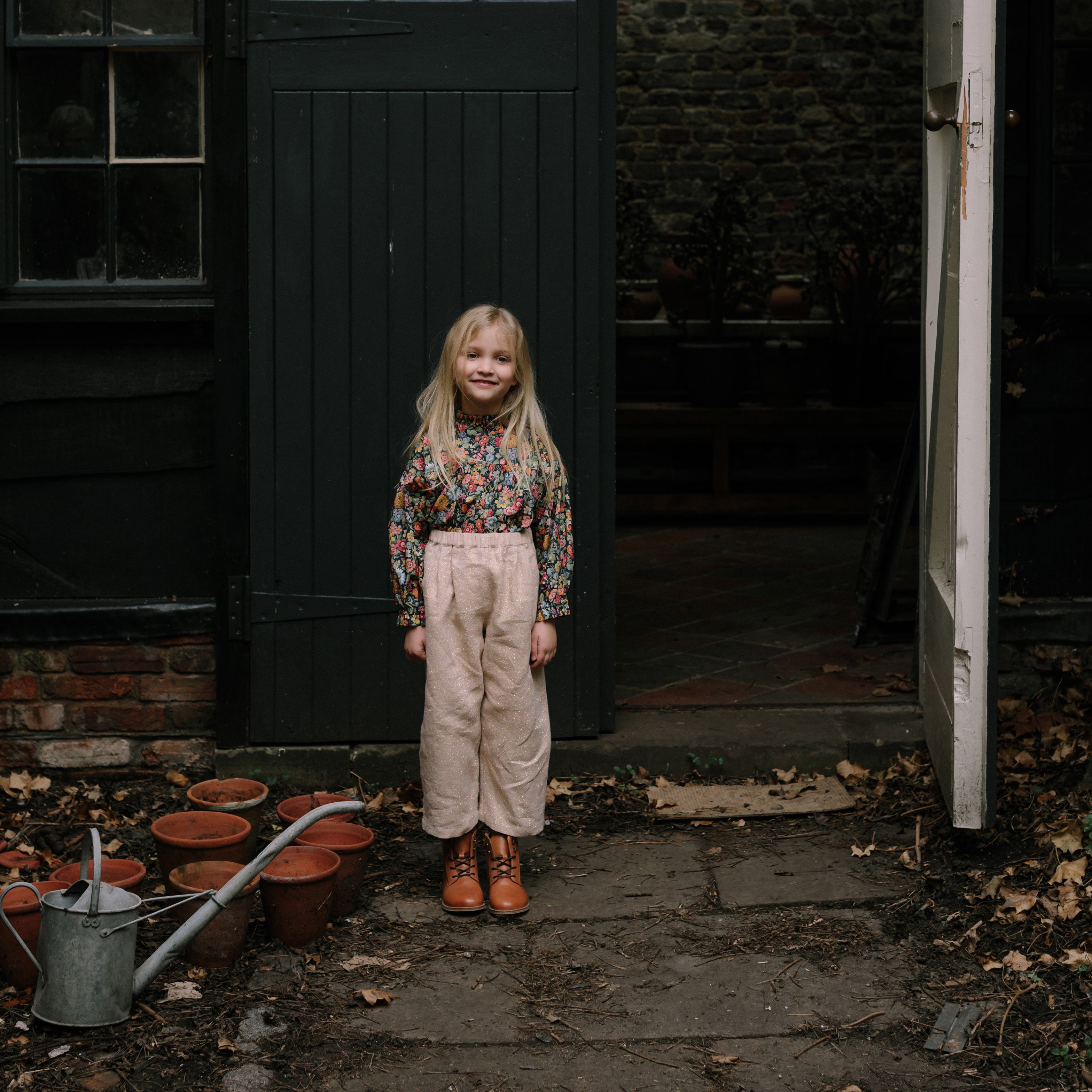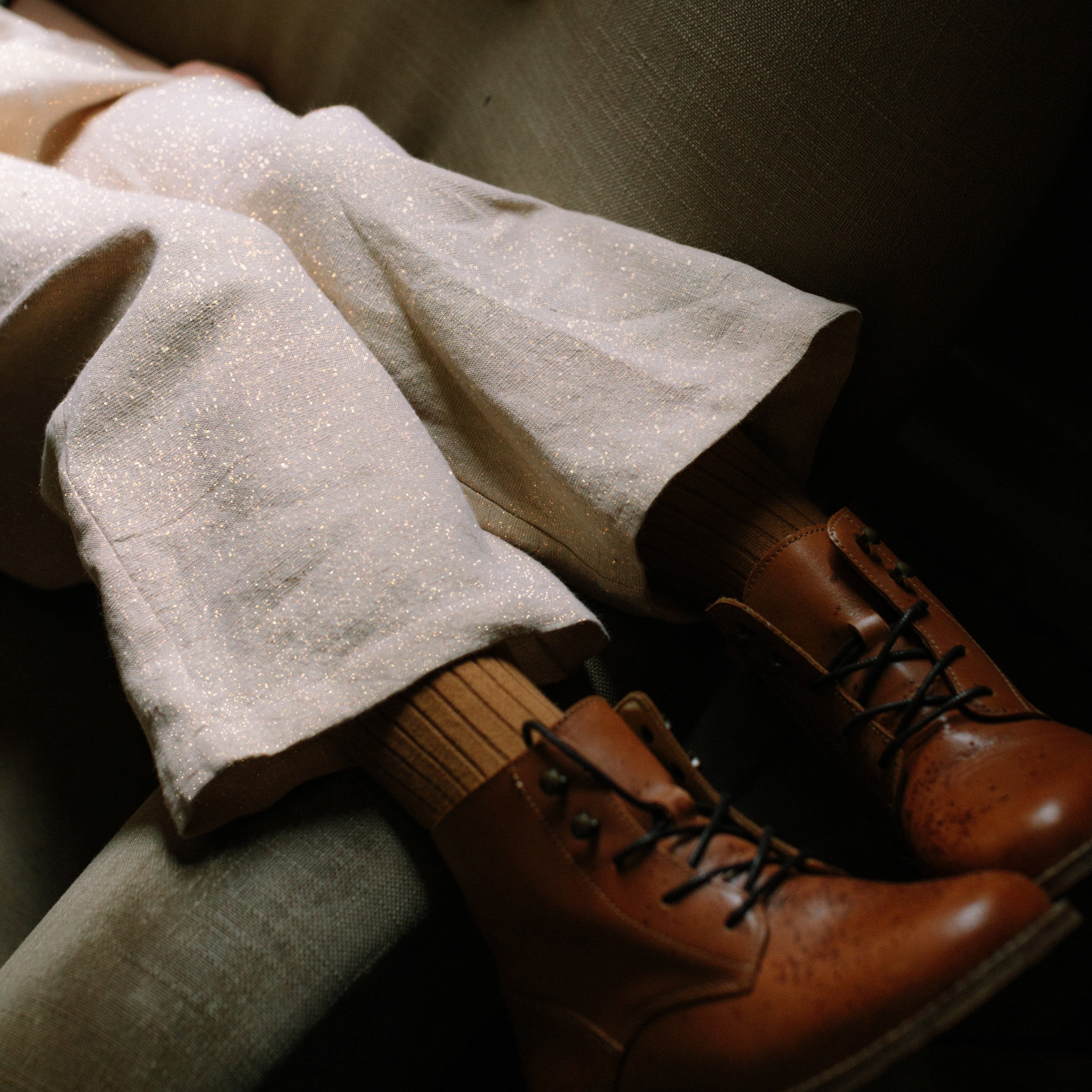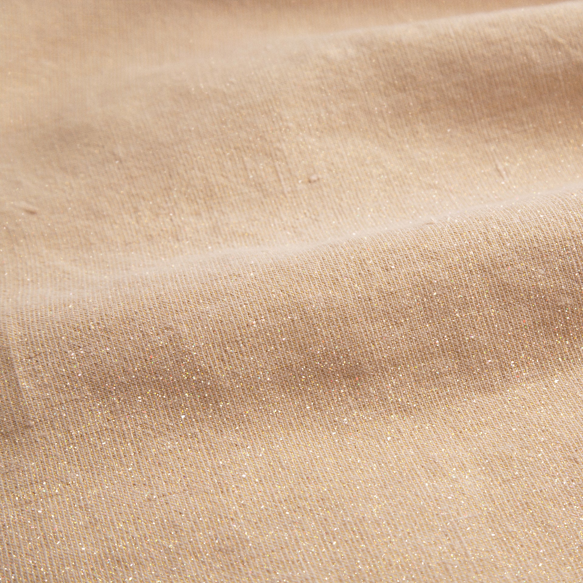 Easy wear wide leg trousers, with elasticated waist, hidden side pockets and front pleats. Designed to fit loosely and sit on or below the waist. Slightly cropped in length, designed to sit at or above the ankle. Made from soft, sparkly gold linen - a cream coloured linen with gold thread running throughout.