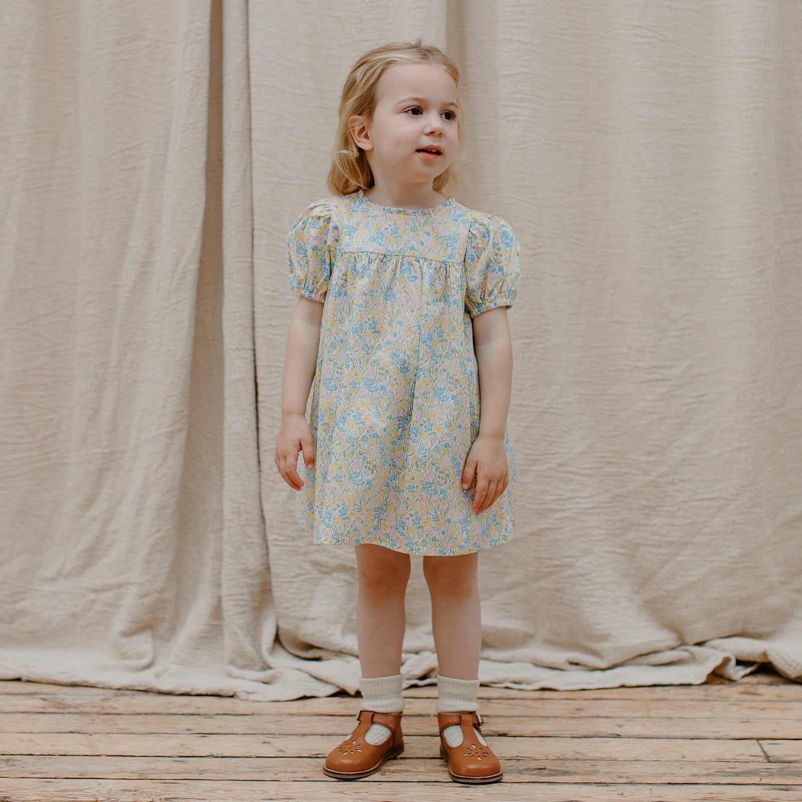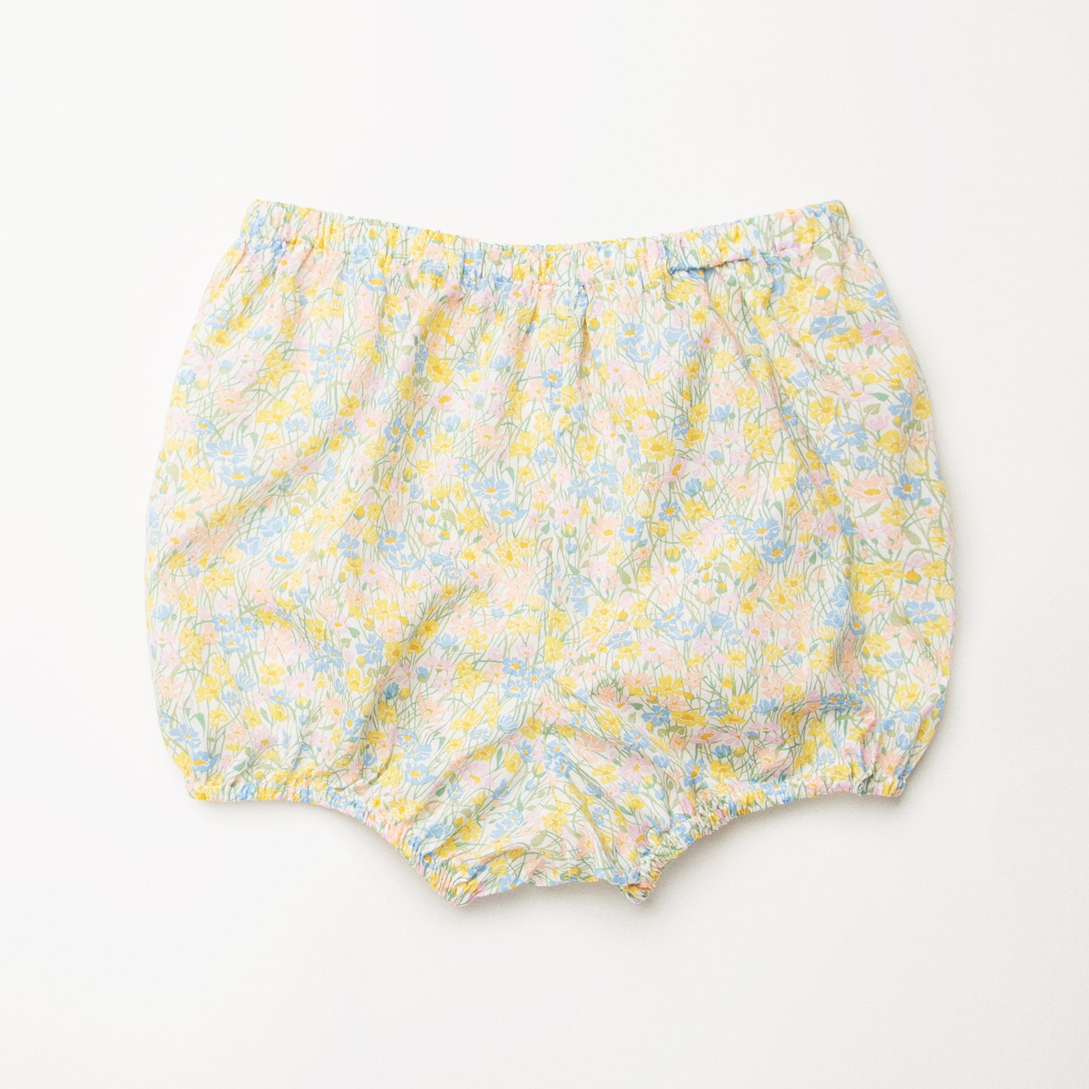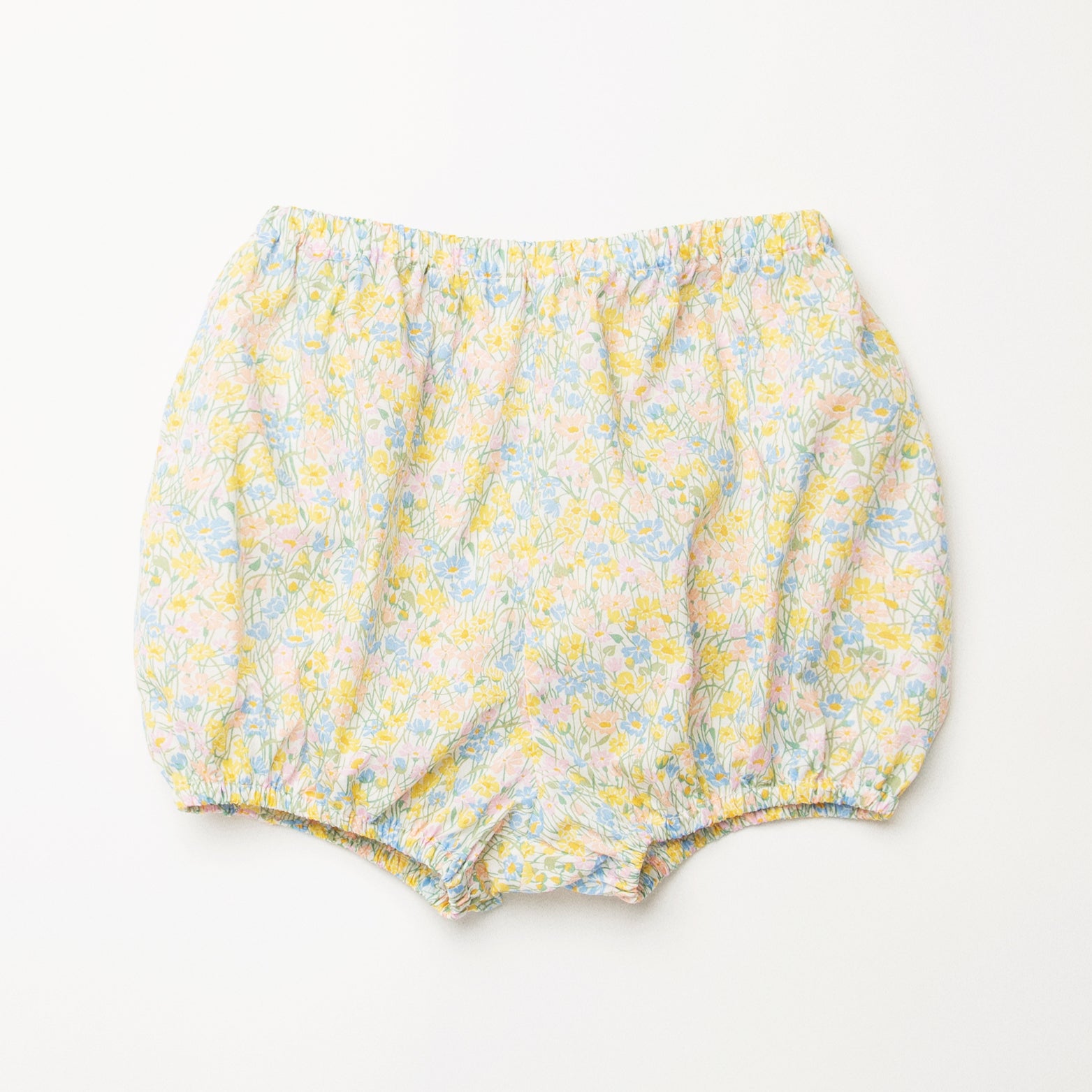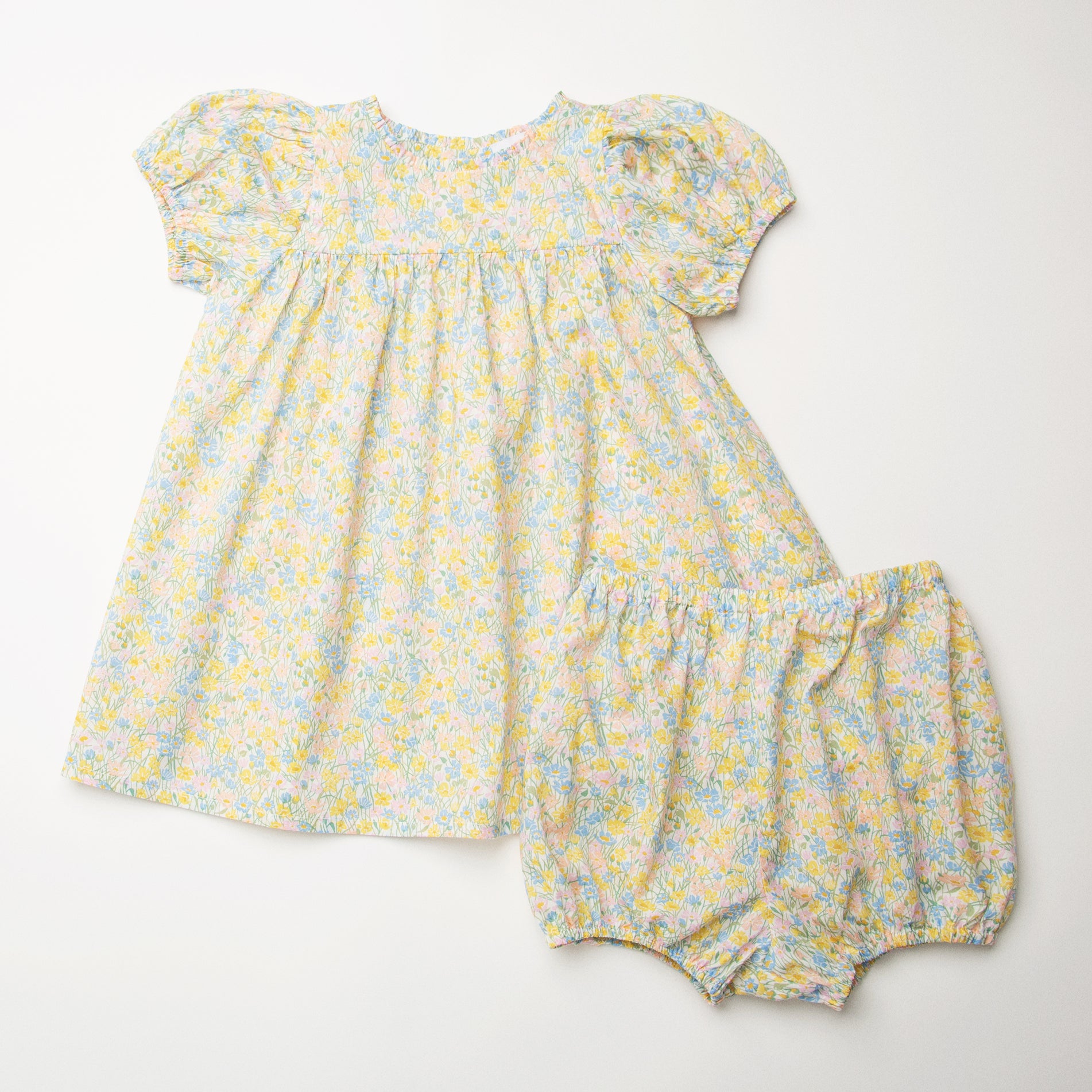 Short puffed elasticated sleeve dress with high empire and mother of pearl buttons down the back yoke and ruffle around the neck. Designed to be oversized for a stylish, comfortable fit. Paired with beautiful comfortable, easy wear bloomers, with elasticated waist and elasticated leg holes. Designed to sit at the top of the thigh, perfect for layering over tights in the winter or stripping back in the summer. Made from beautiful Meadowland Liberty print tana lawn cotton.