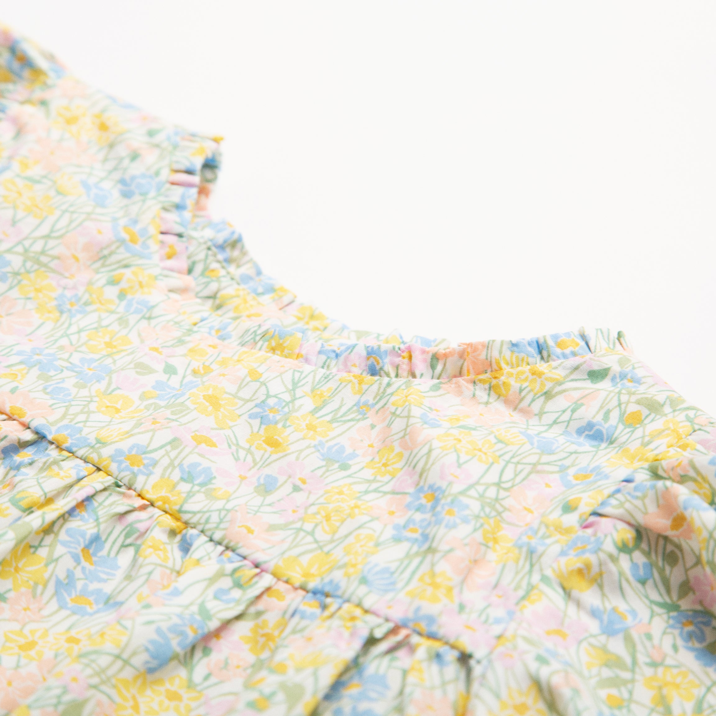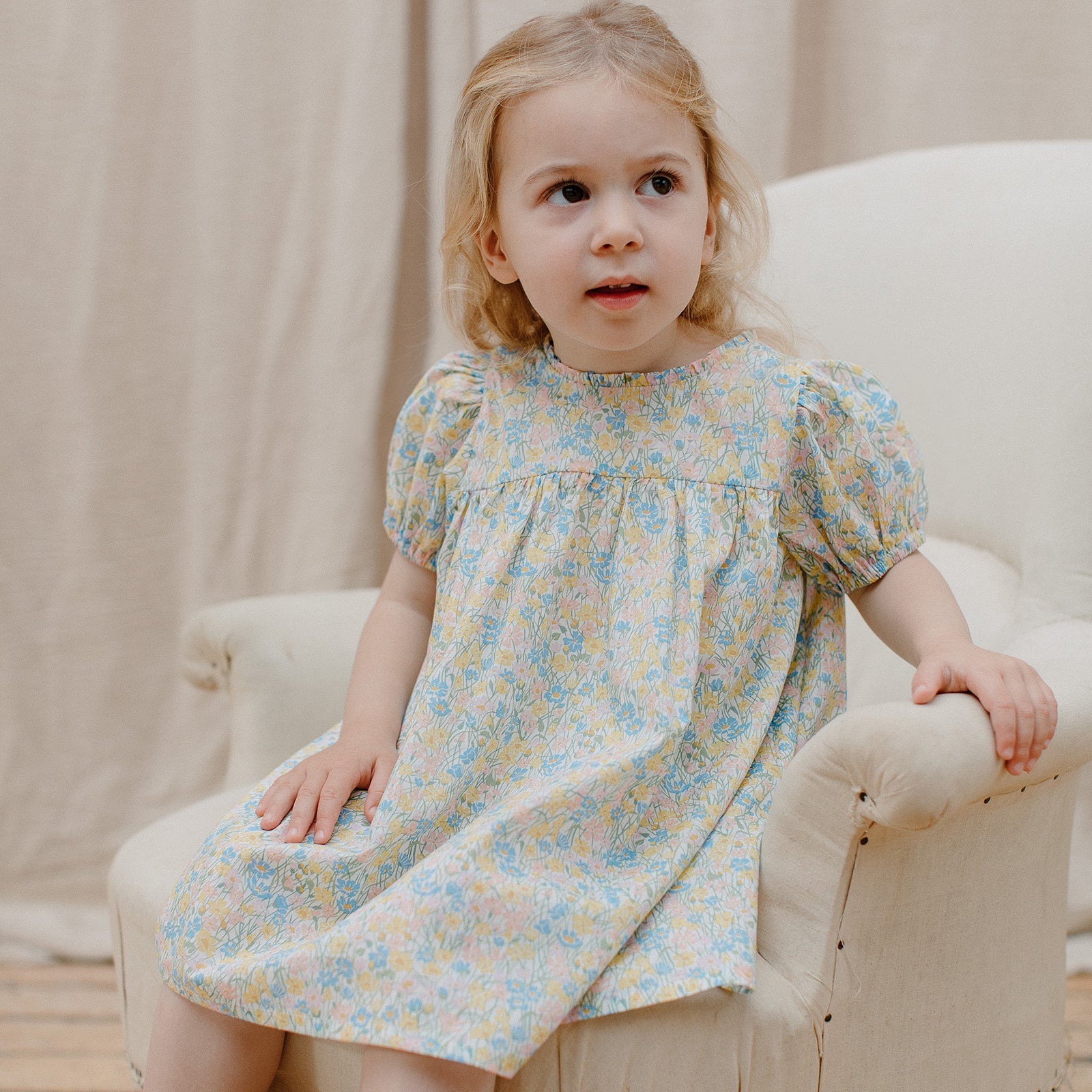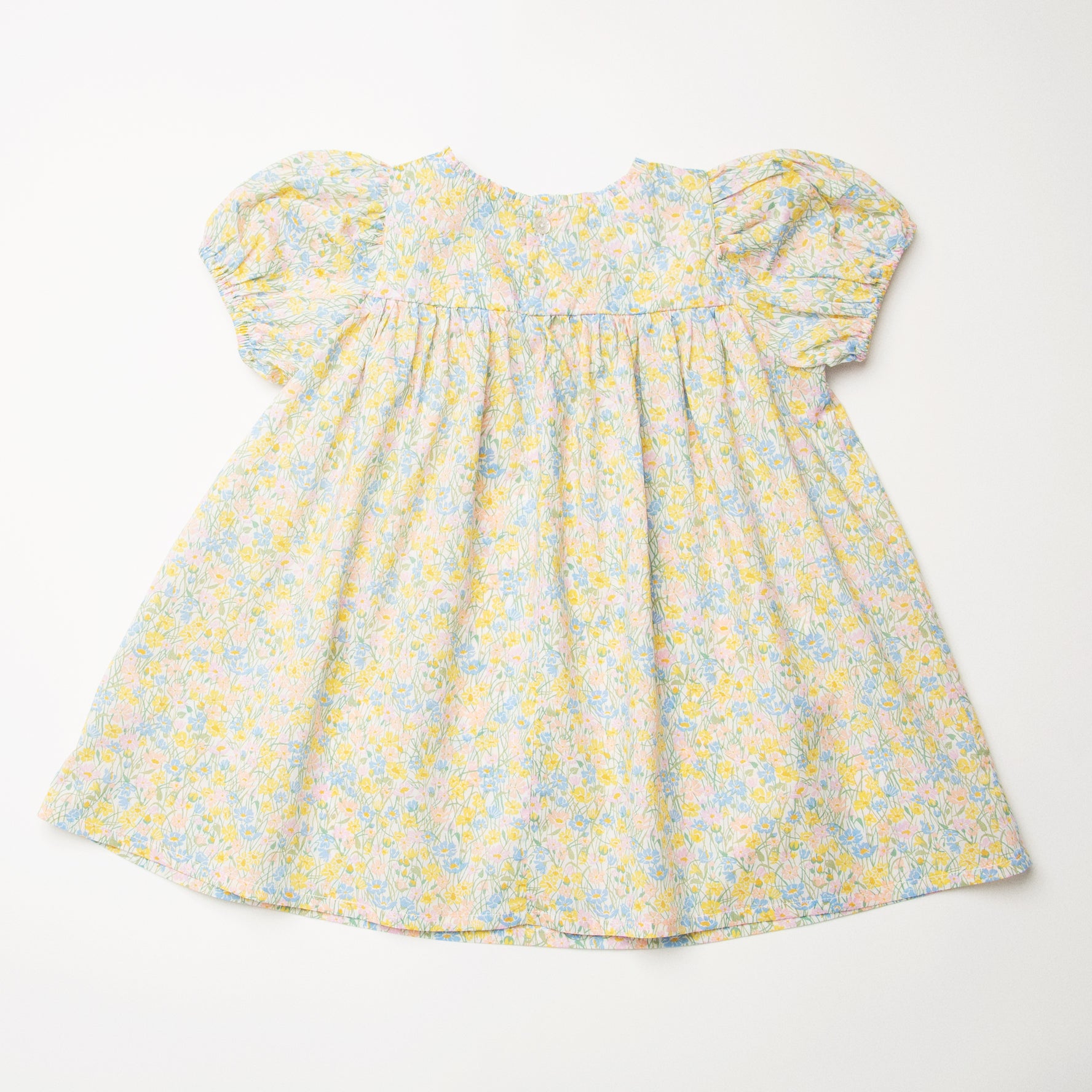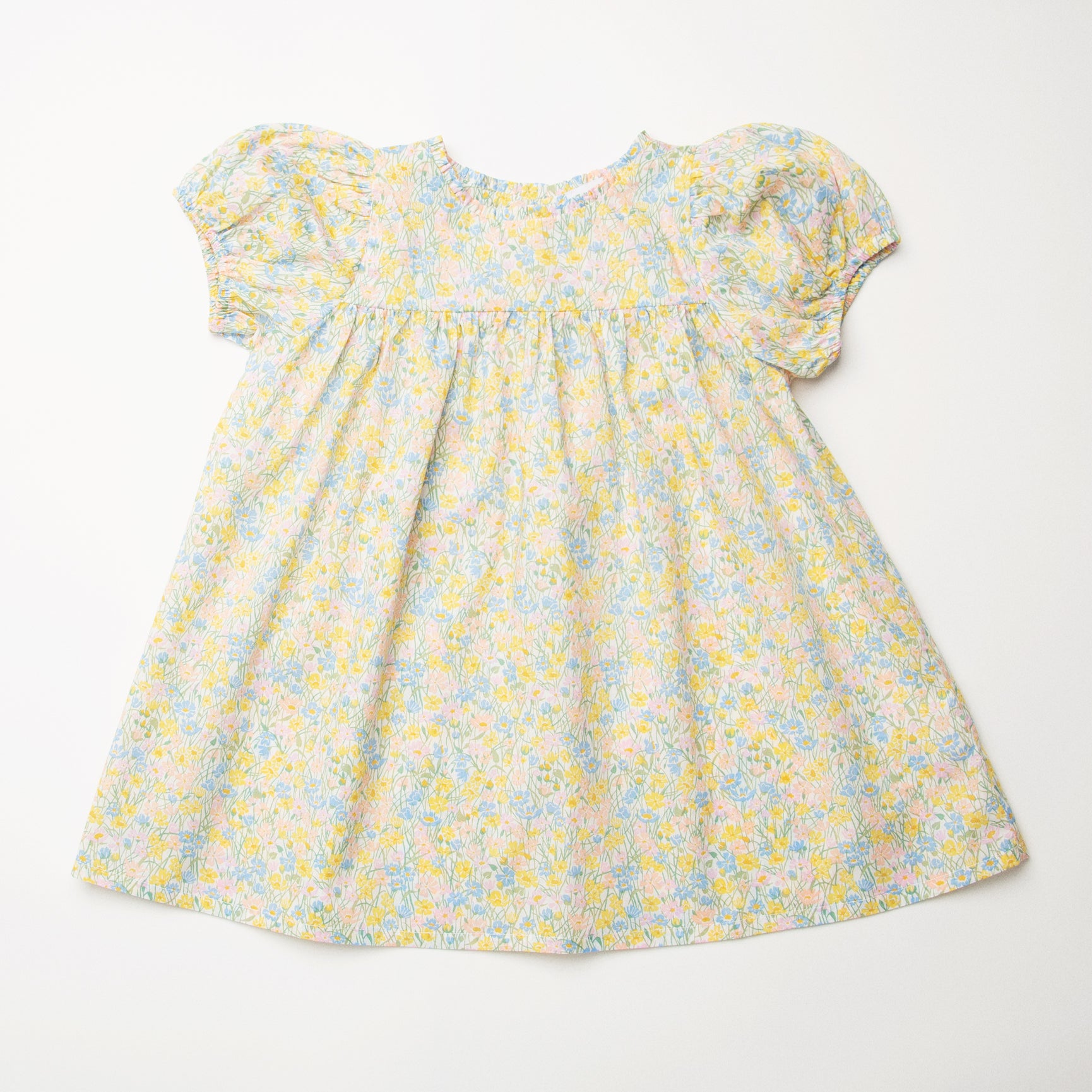 Short puffed elasticated sleeve dress with high empire and mother of pearl buttons down the back yoke and ruffle around the neck. Designed to be oversized for a stylish, comfortable fit. Paired with beautiful comfortable, easy wear bloomers, with elasticated waist and elasticated leg holes. Designed to sit at the top of the thigh, perfect for layering over tights in the winter or stripping back in the summer. Made from beautiful Meadowland Liberty print tana lawn cotton.