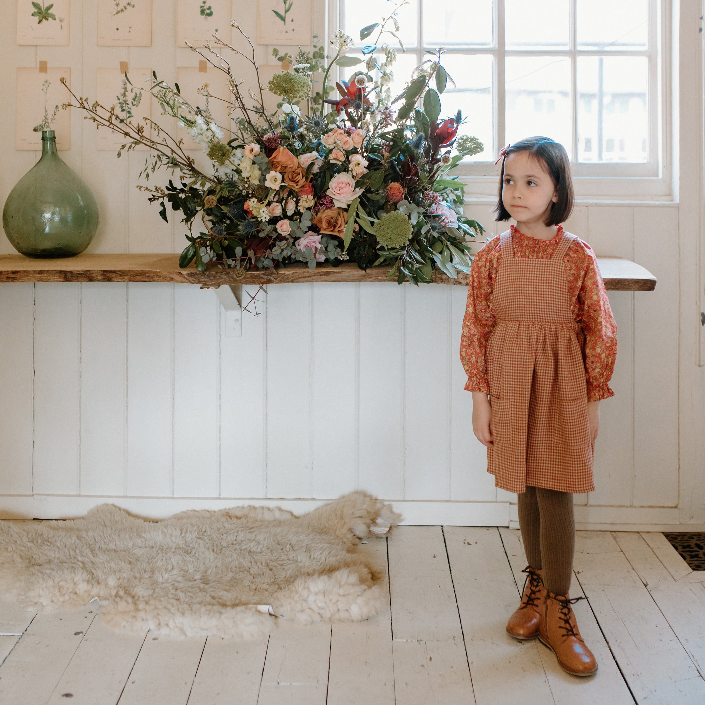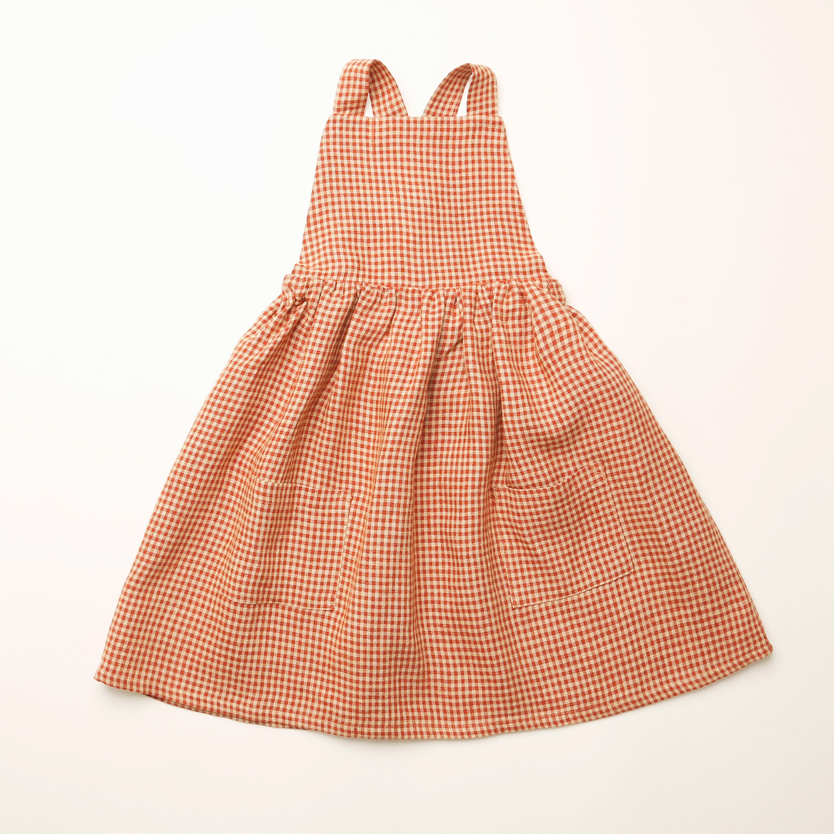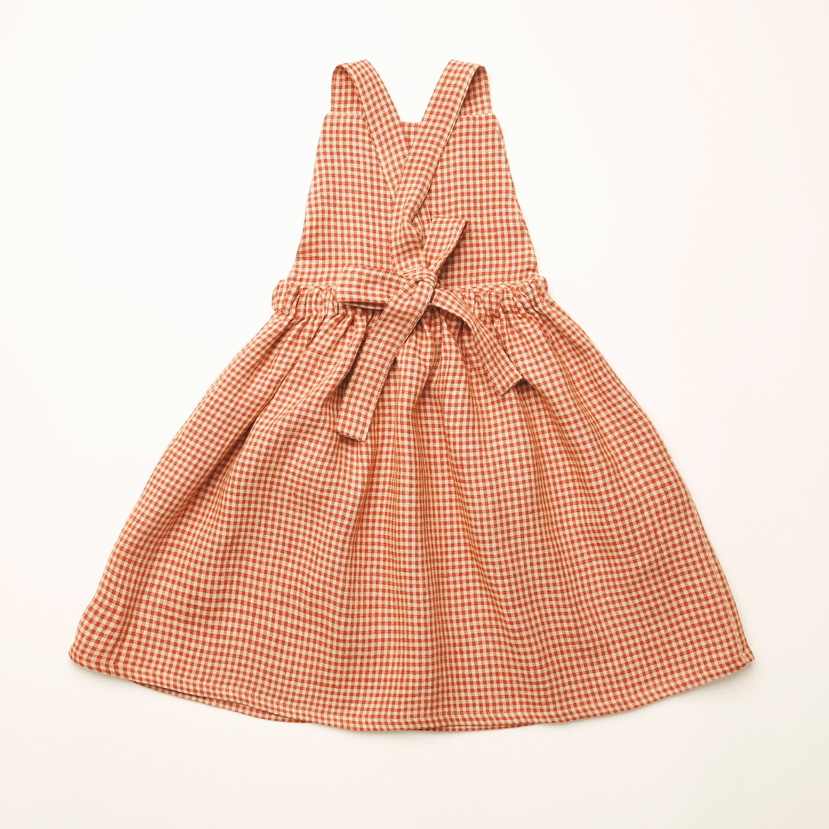 Classic pinafore shaped dress, with gathered skirt front and elasticated waist back for a comfortable fit. Straps tie through loops at the back so fully adjustable. Made from soft rust & oat check linen - a small scale beige/oat check interwoven with a rich rust colour. Designed to sit above the knee. Perfect for layering in cooler weather or stripping back in the summer.