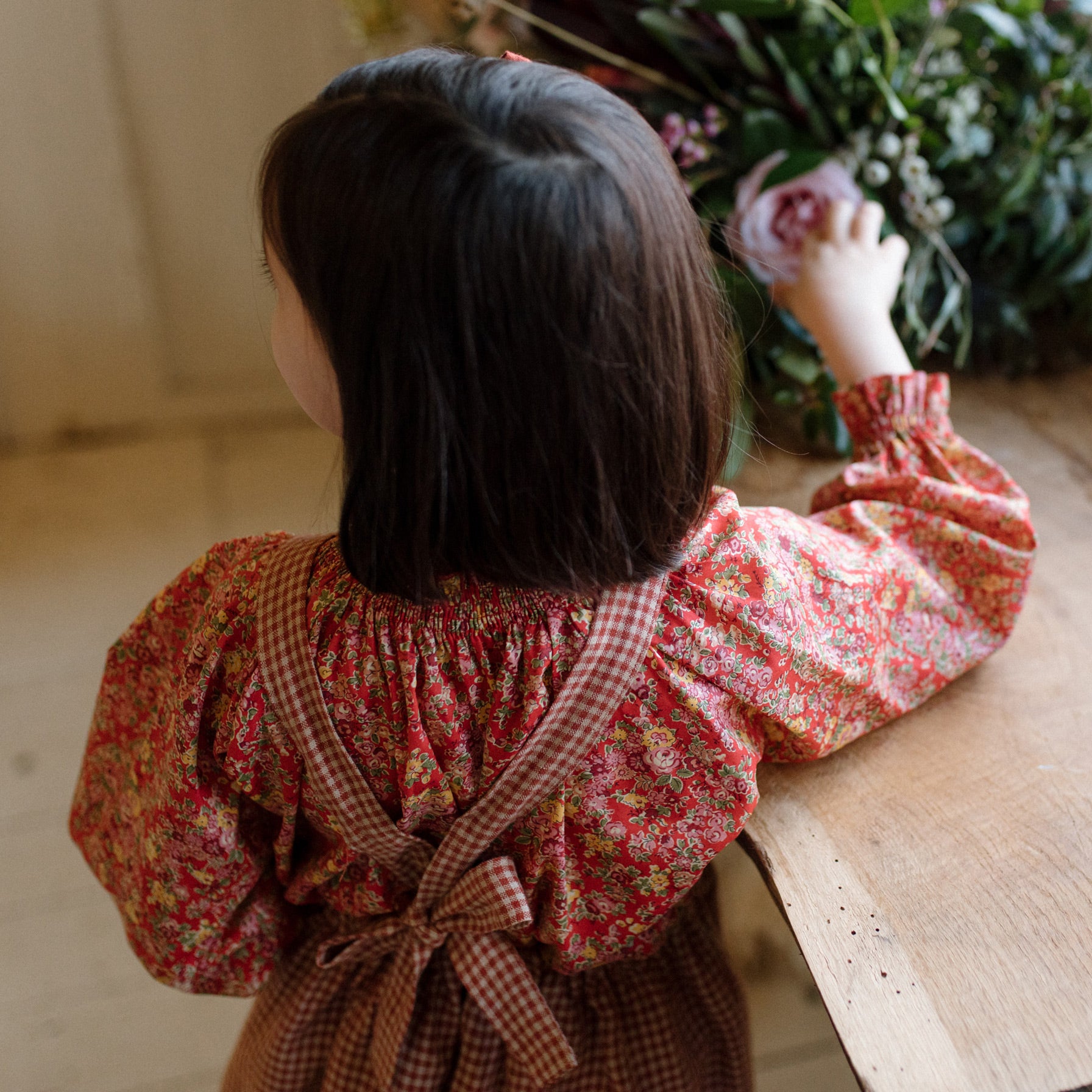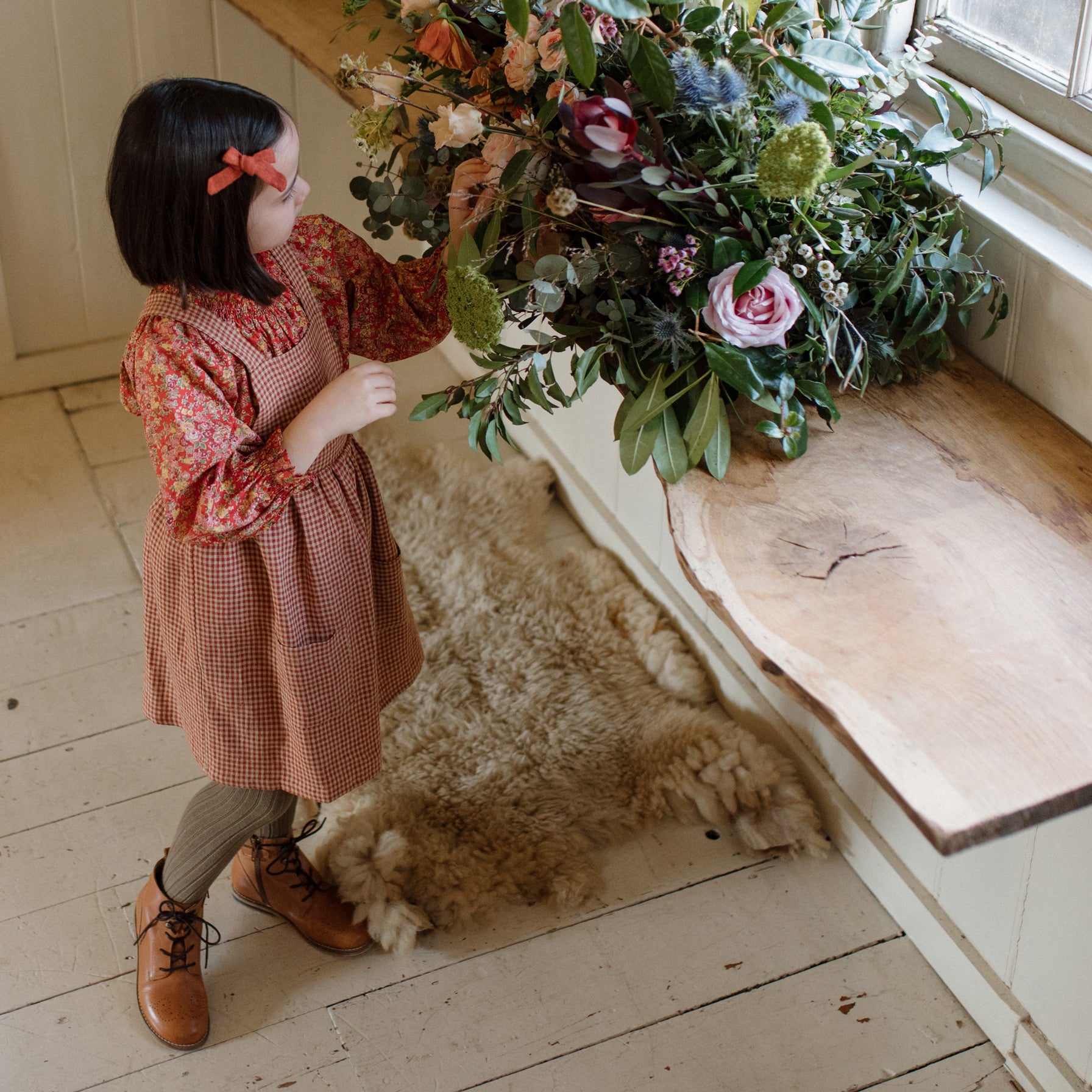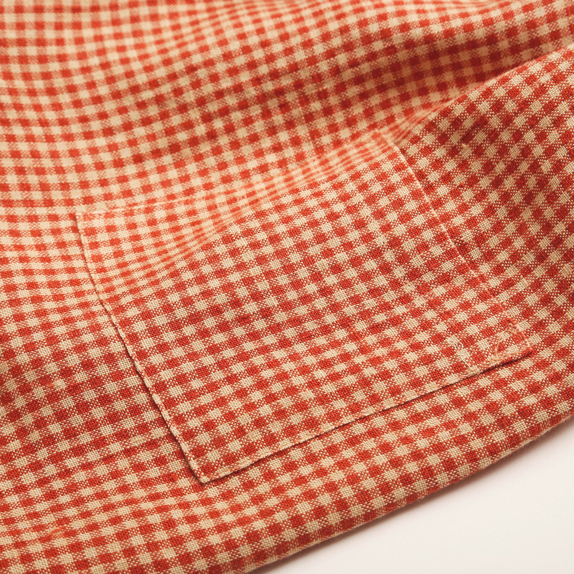 Classic pinafore shaped dress, with gathered skirt front and elasticated waist back for a comfortable fit. Straps tie through loops at the back so fully adjustable. Made from soft rust & oat check linen - a small scale beige/oat check interwoven with a rich rust colour. Designed to sit above the knee. Perfect for layering in cooler weather or stripping back in the summer.