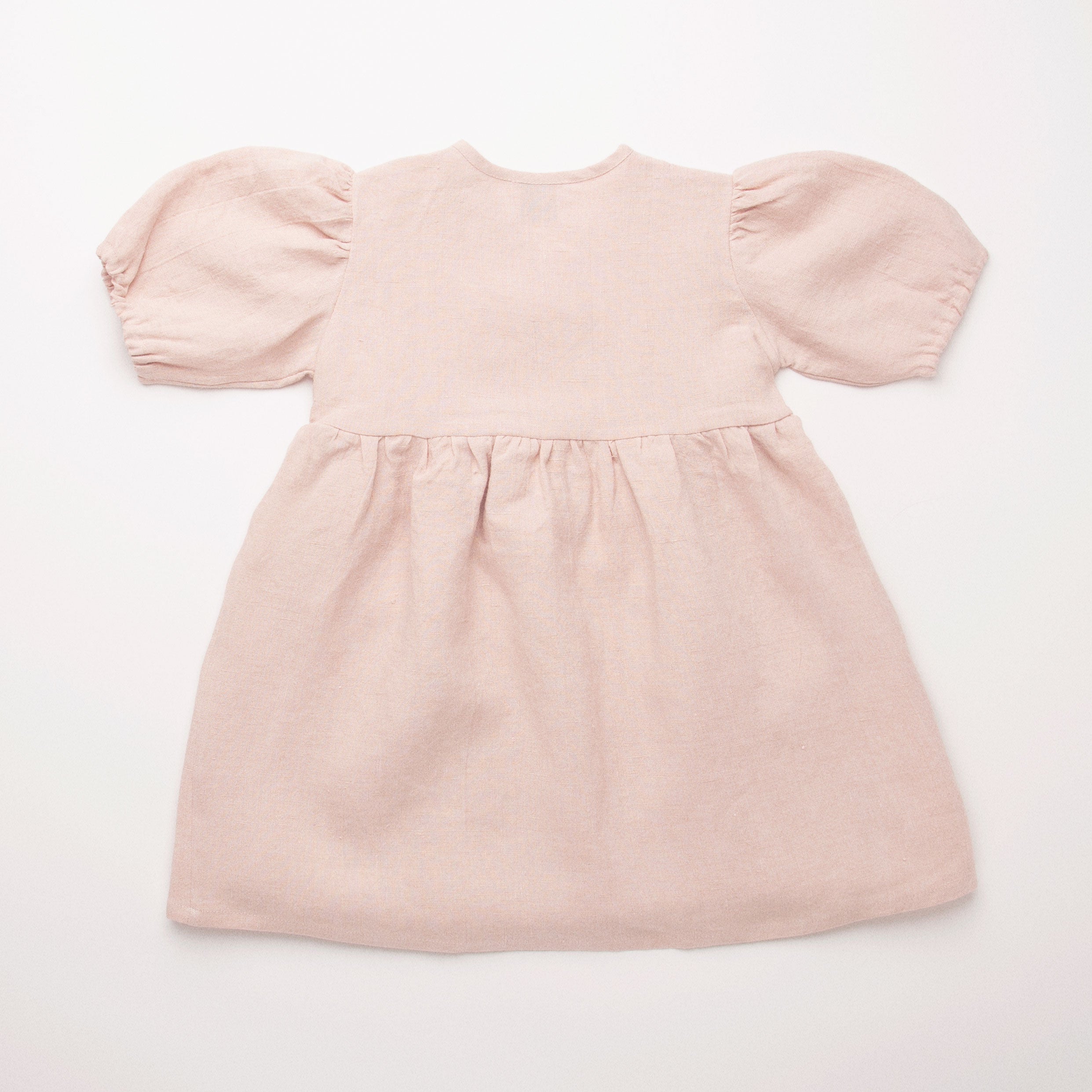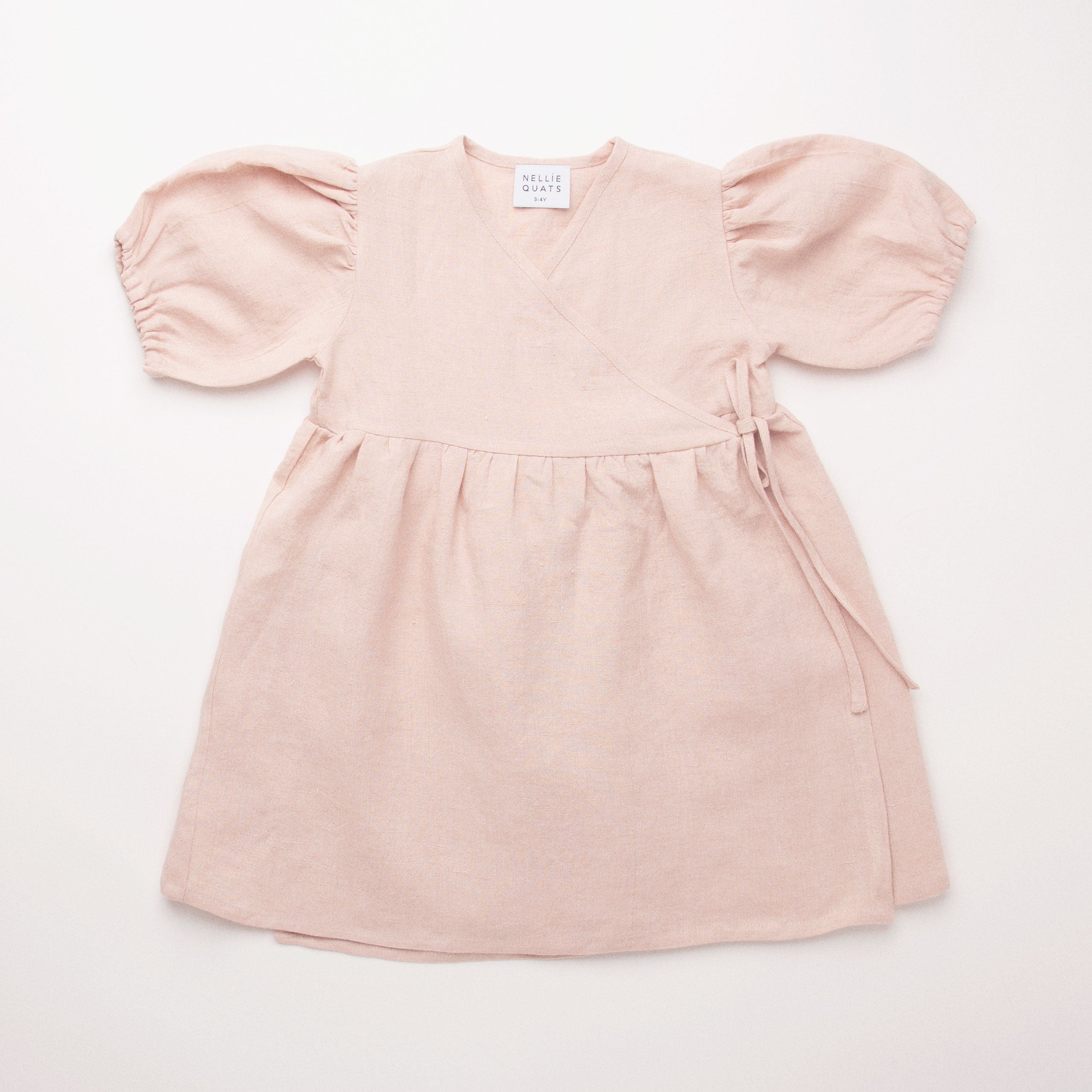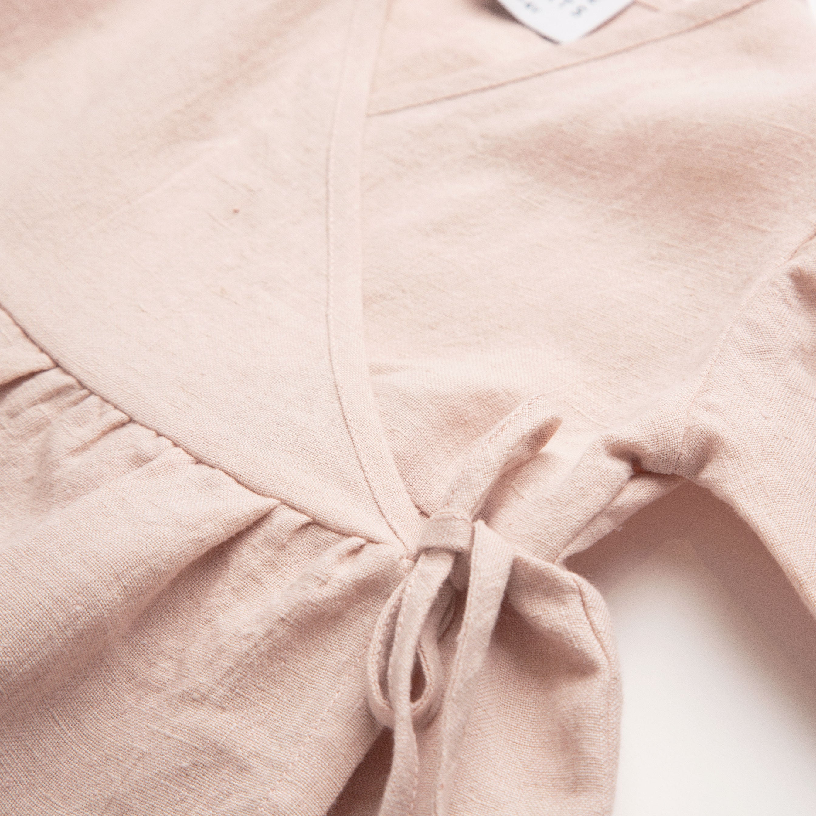 Puffed sleeve dress with with elasticated cuffs and wrap over kimono style front. Edges are finished with binding and fastened at the side with a tie. Attached gathered skirt sits above the knee. Designed to be oversized for a stylish, comfortable fit. Made from soft, blush linen - a beautiful pale rose, soft pastel pink colour.