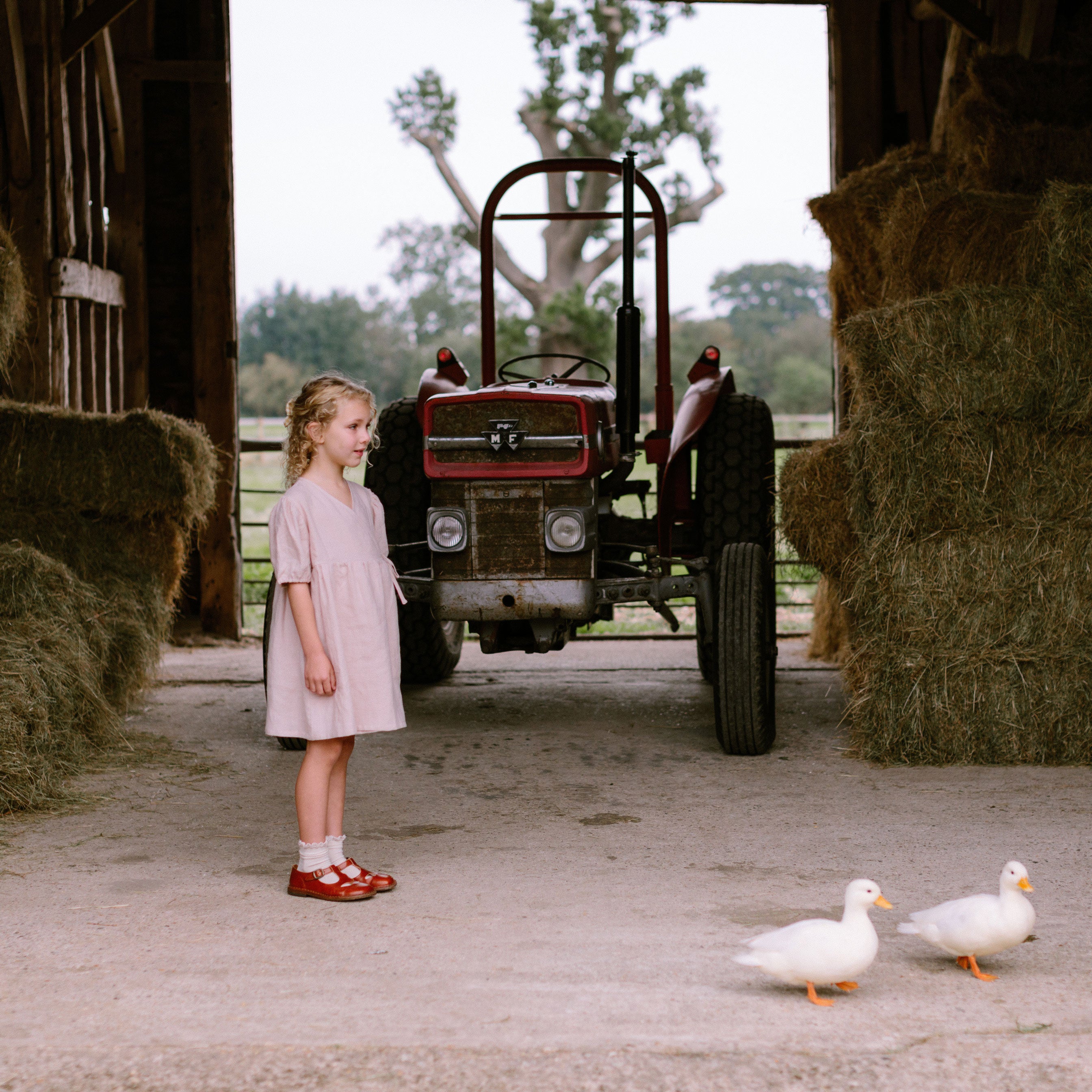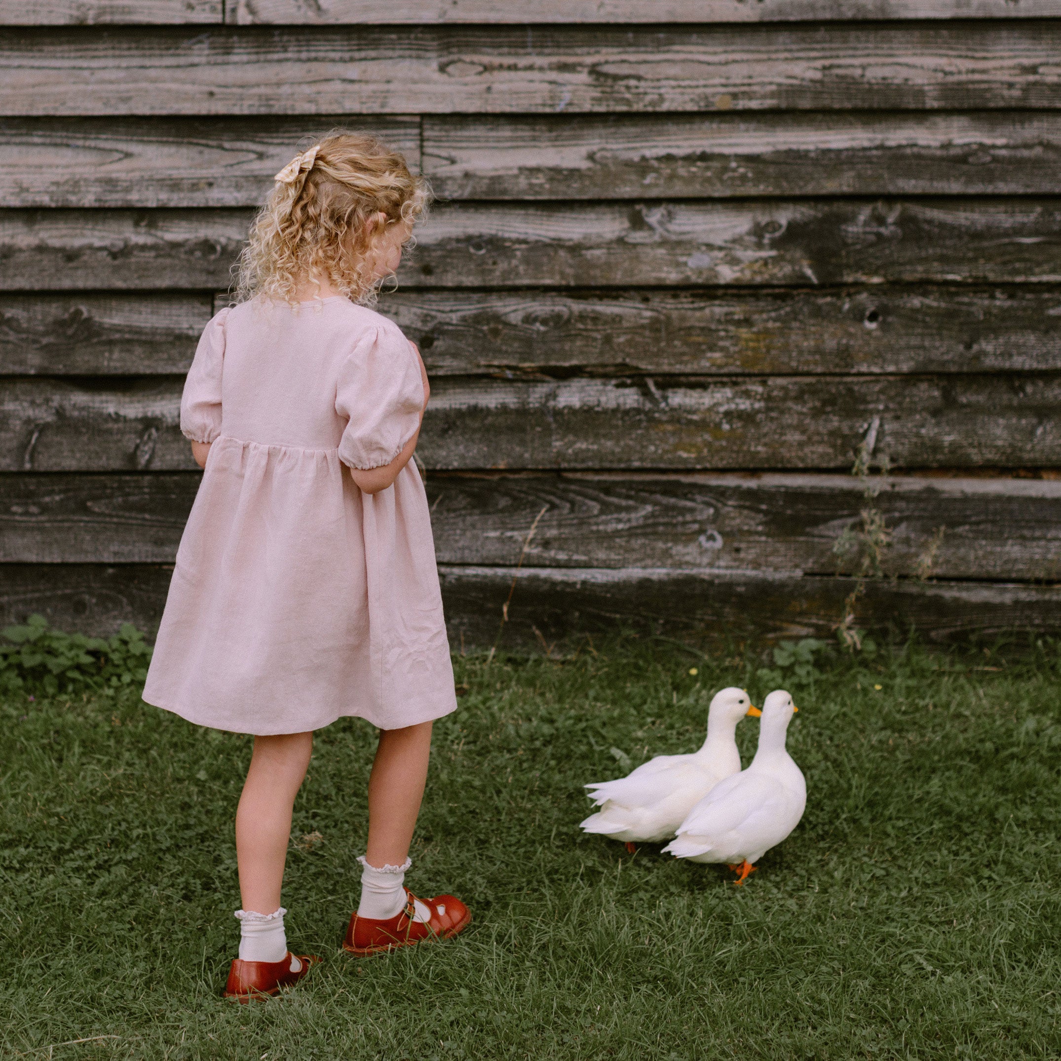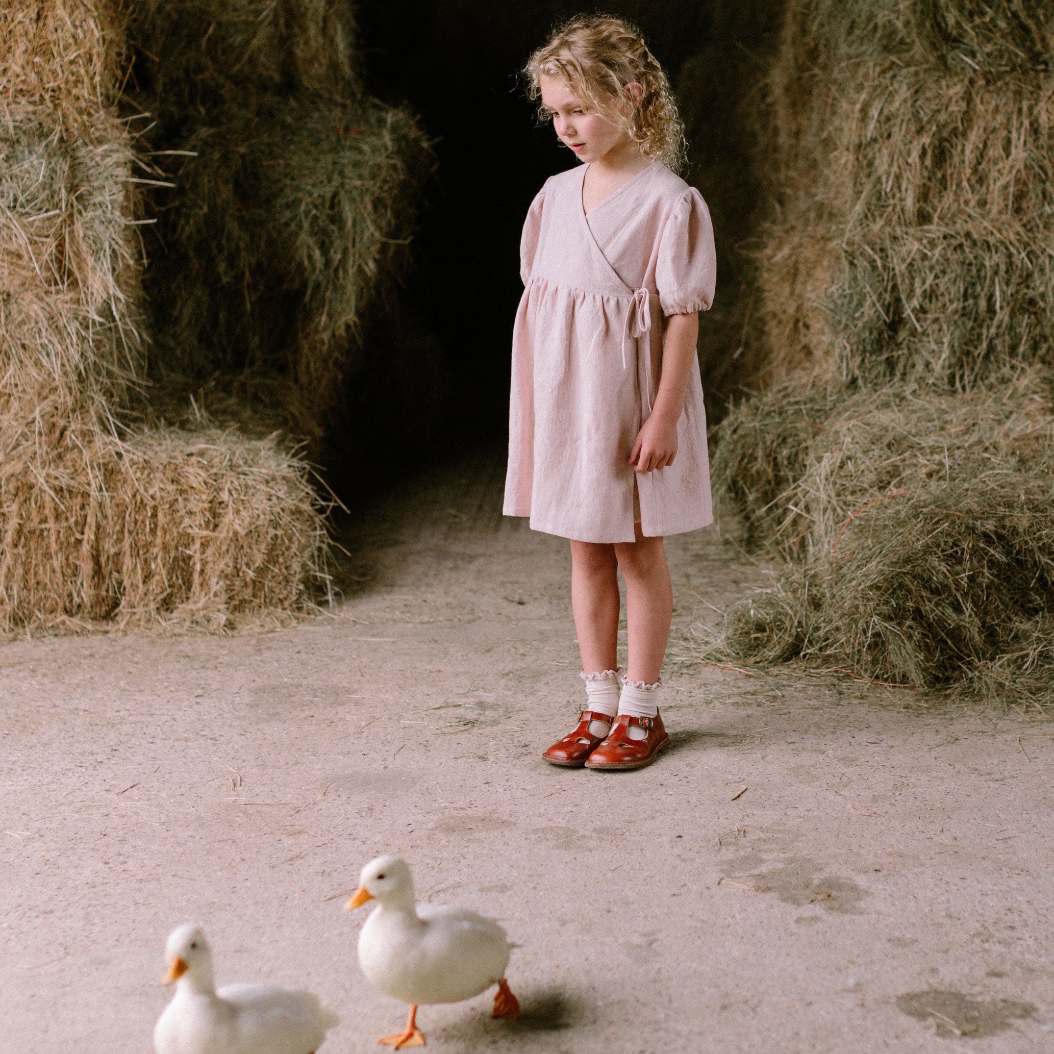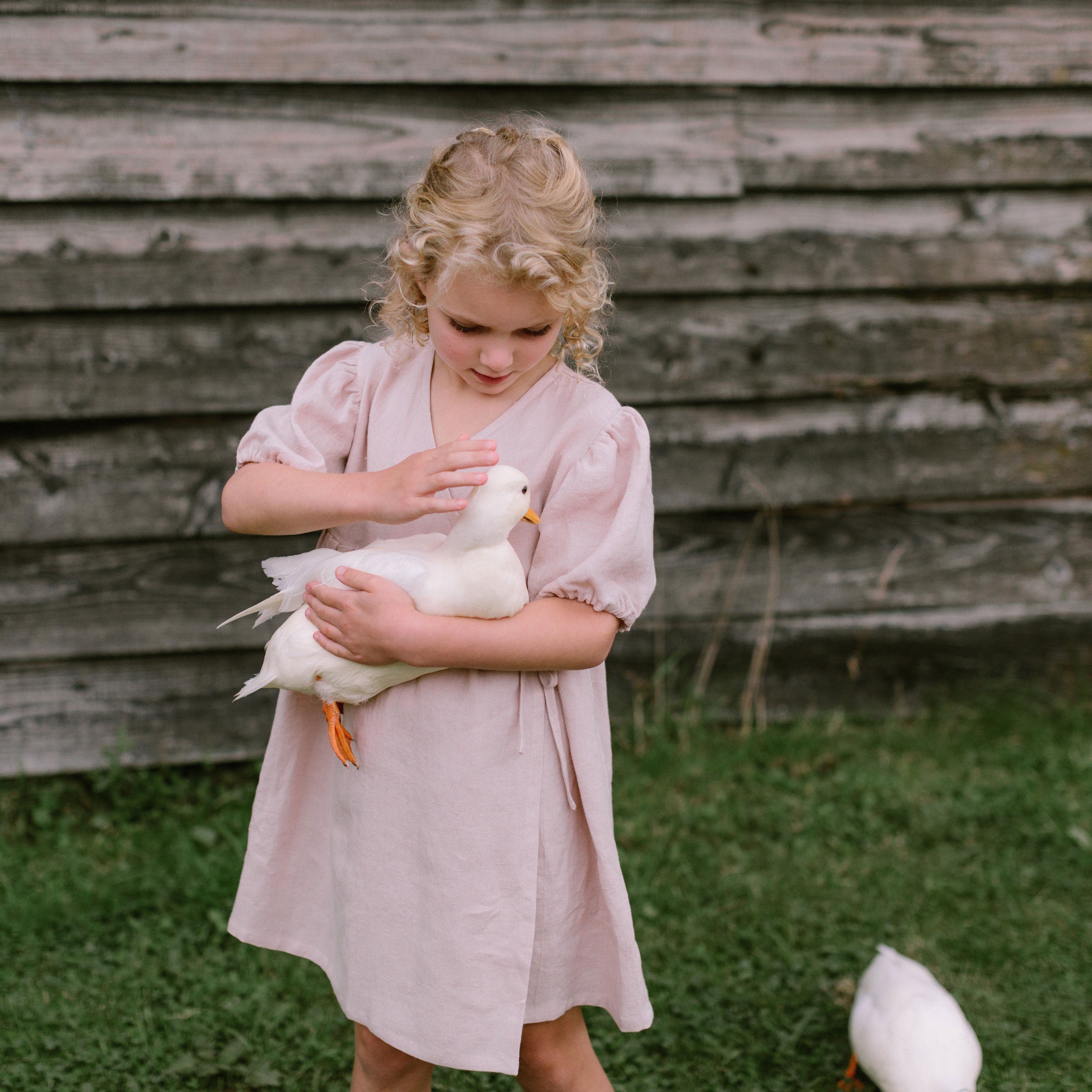 Puffed sleeve dress with with elasticated cuffs and wrap over kimono style front. Edges are finished with binding and fastened at the side with a tie. Attached gathered skirt sits above the knee. Designed to be oversized for a stylish, comfortable fit. Made from soft, blush linen - a beautiful pale rose, soft pastel pink colour.