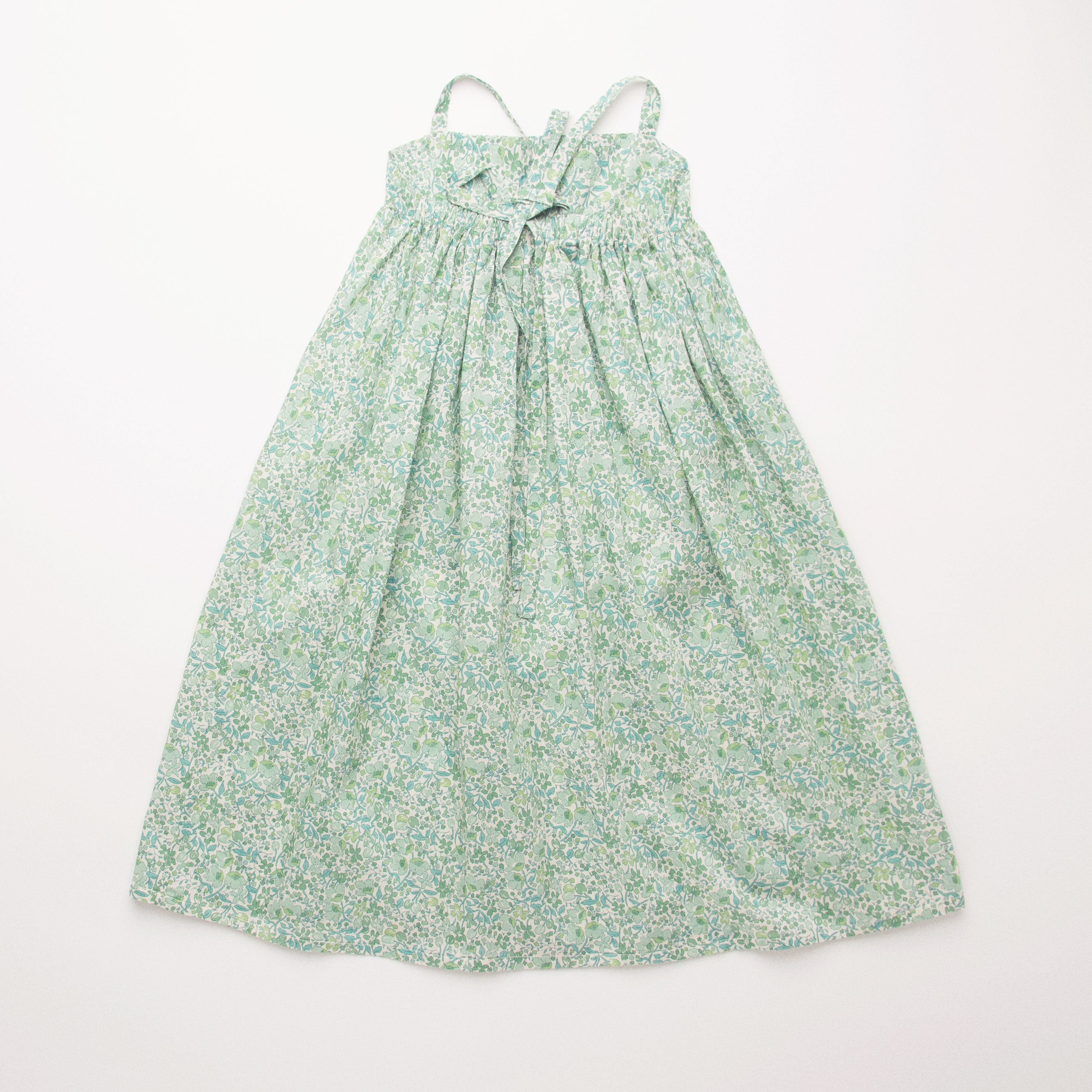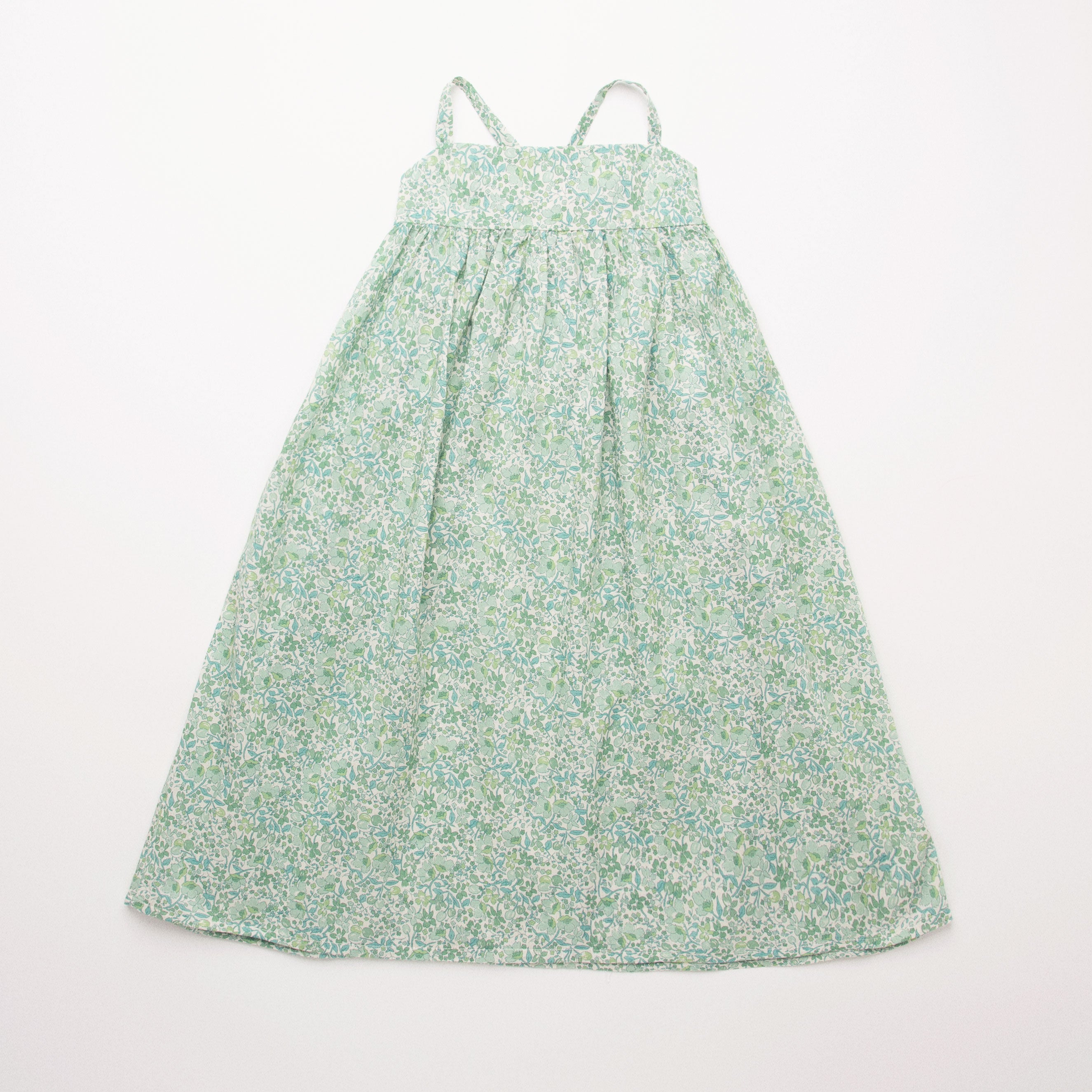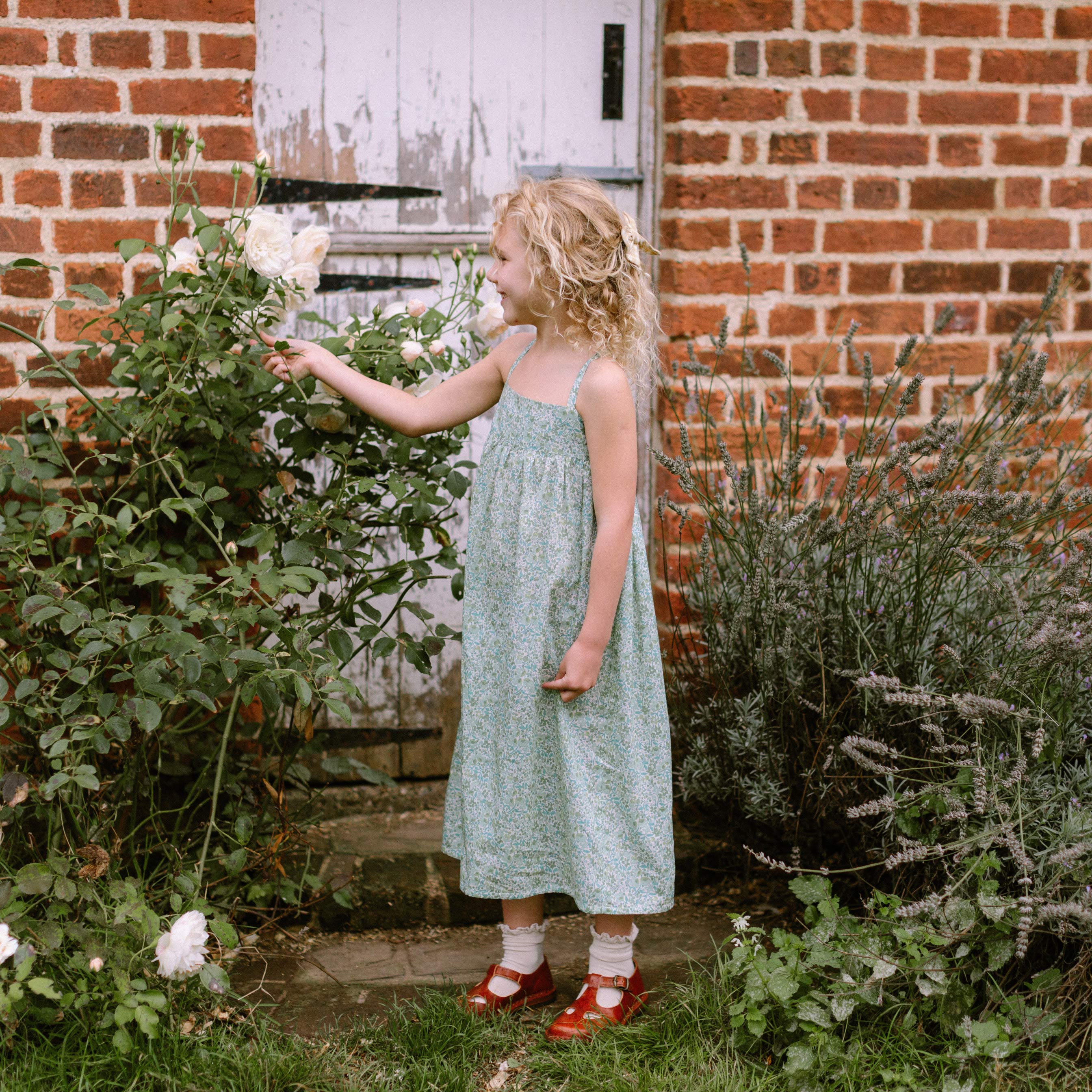 Floaty midi dress with fitted top, elasticated back and adjustable straps that tie through loops at the back. Skirt gathers at the chest to create a full, floaty style designed to sit calf to ankle length. Perfect for layering over a blouse in the cooler weather and stripping back in the summer. Made from beautiful Coward Liberty print tana lawn organic cotton, an exclusive print to NQ.