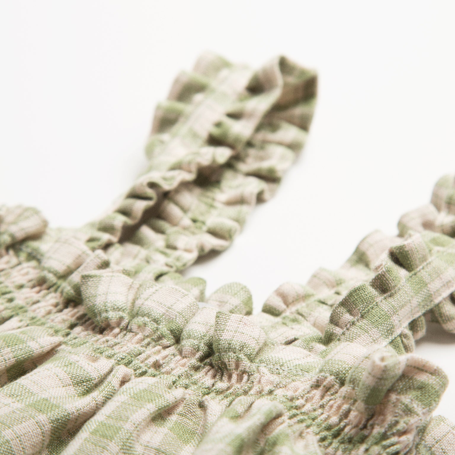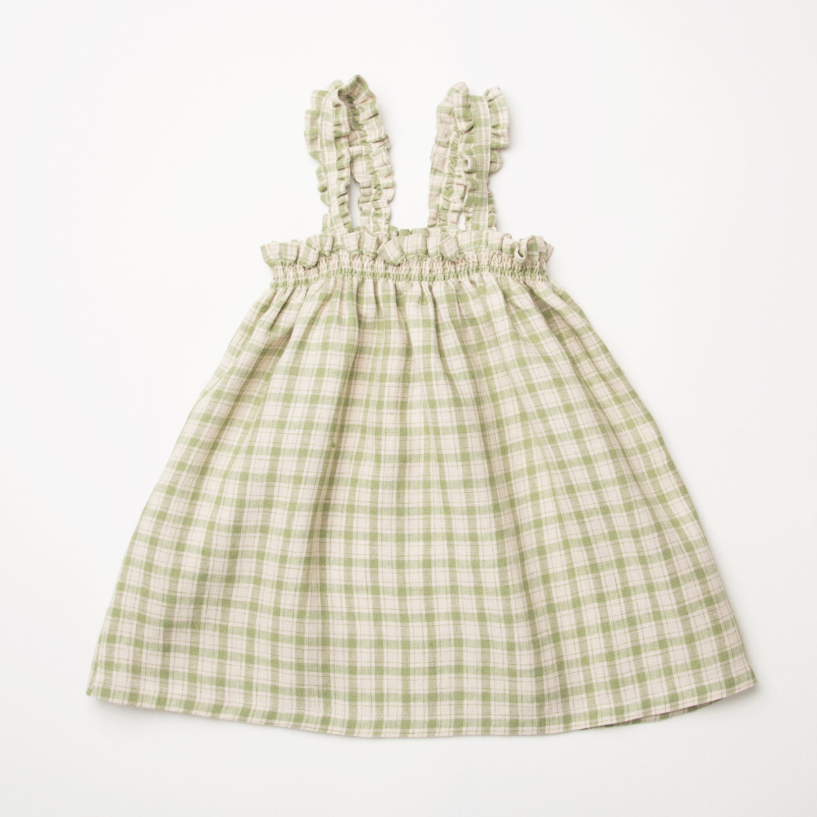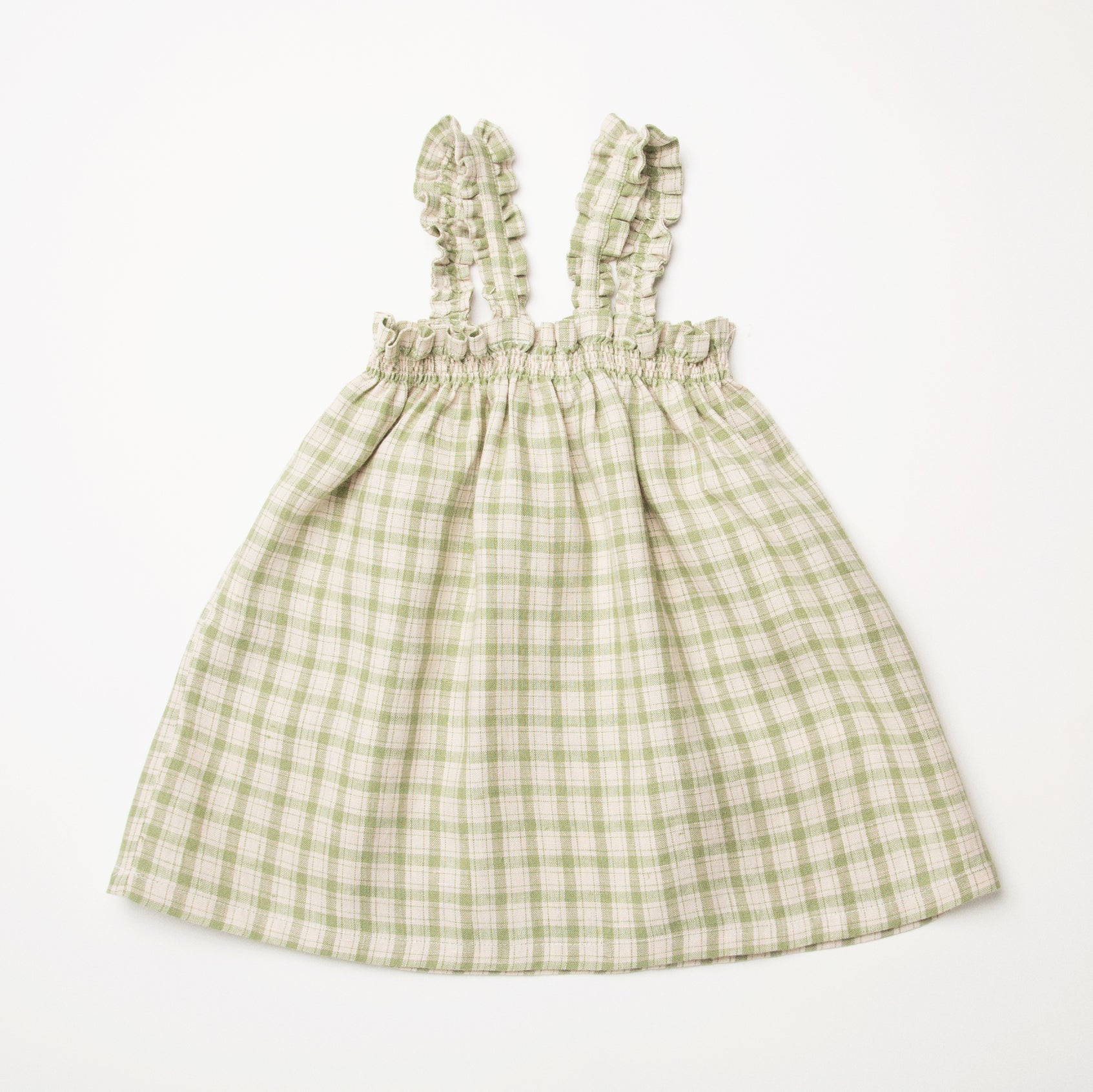 Floaty A-line shaped dress with shirred elastic rows around the top and ruffle detail. Straps lined with ruffles either side meet at the back in a V-shape. Skirt gathers at the chest to create a full, floaty style, designed to sit at a shorter length above the knee. Perfect for layering over a blouse in the cooler weather and stripping back in the summer. Made from soft, olive & oat check linen - a two-tone green grid, layering a warm oat colour background.
