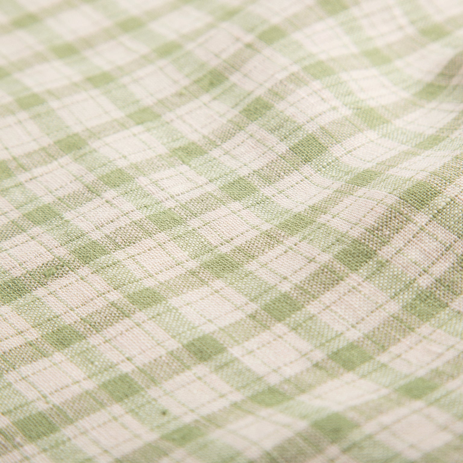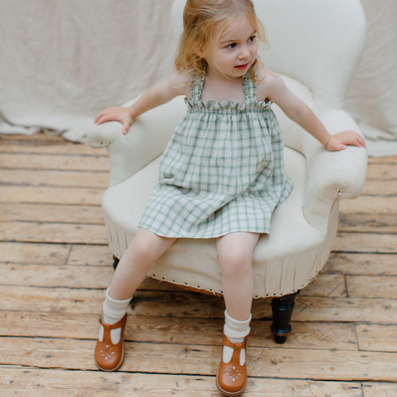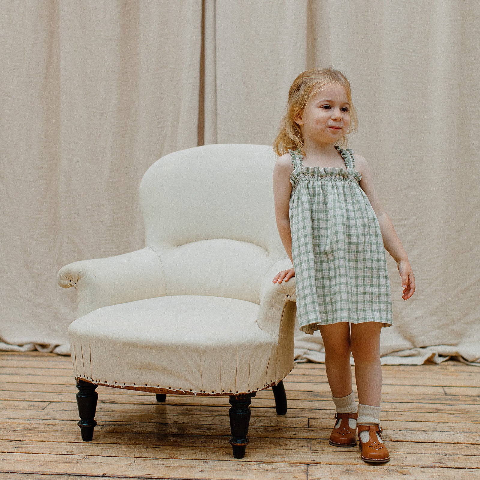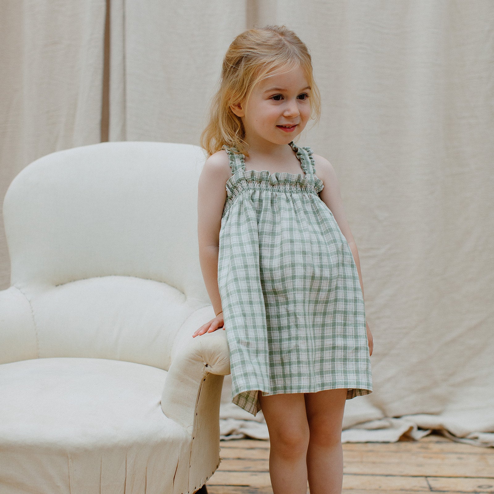 Floaty A-line shaped dress with shirred elastic rows around the top and ruffle detail. Straps lined with ruffles either side meet at the back in a V-shape. Skirt gathers at the chest to create a full, floaty style, designed to sit at a shorter length above the knee. Perfect for layering over a blouse in the cooler weather and stripping back in the summer. Made from soft, olive & oat check linen - a two-tone green grid, layering a warm oat colour background.