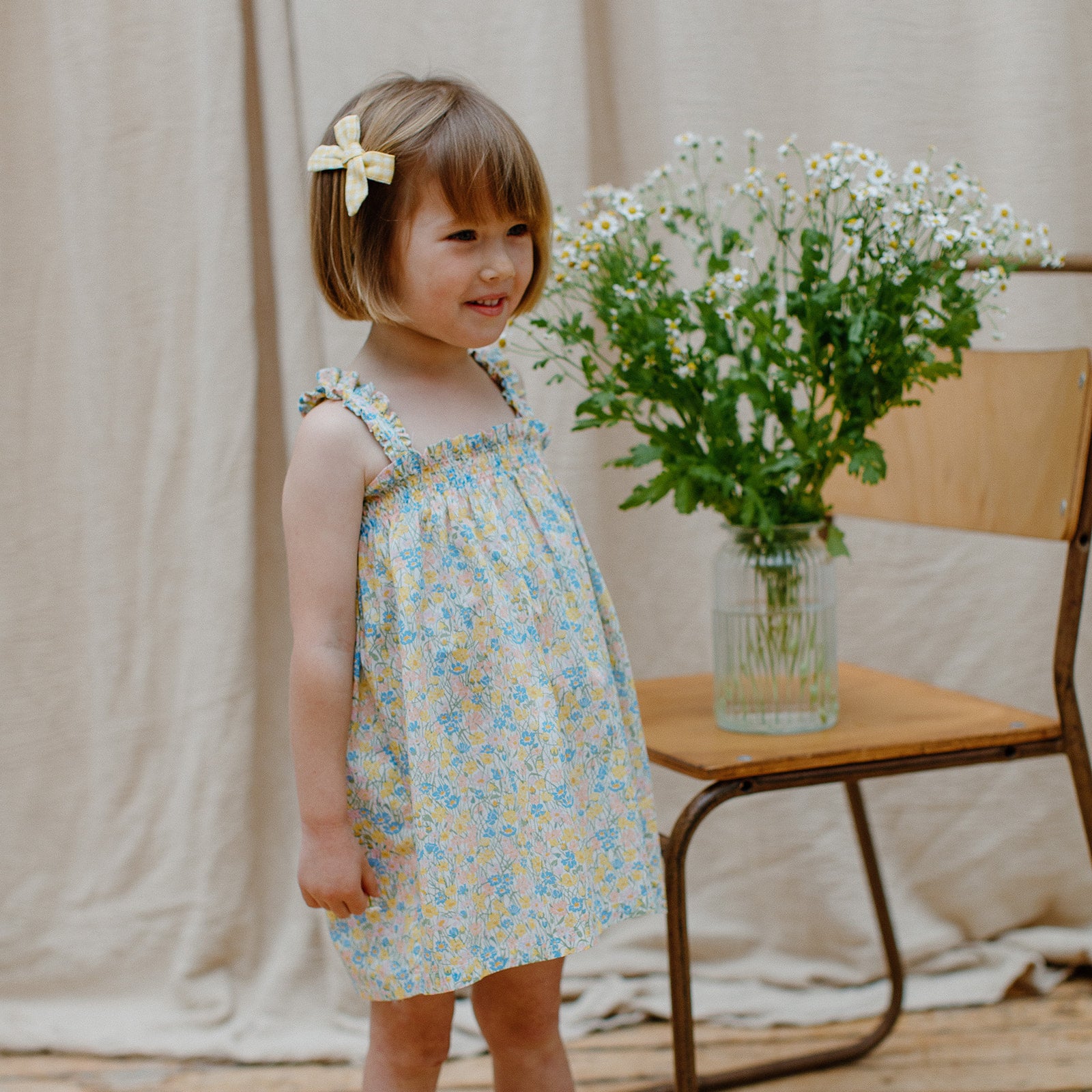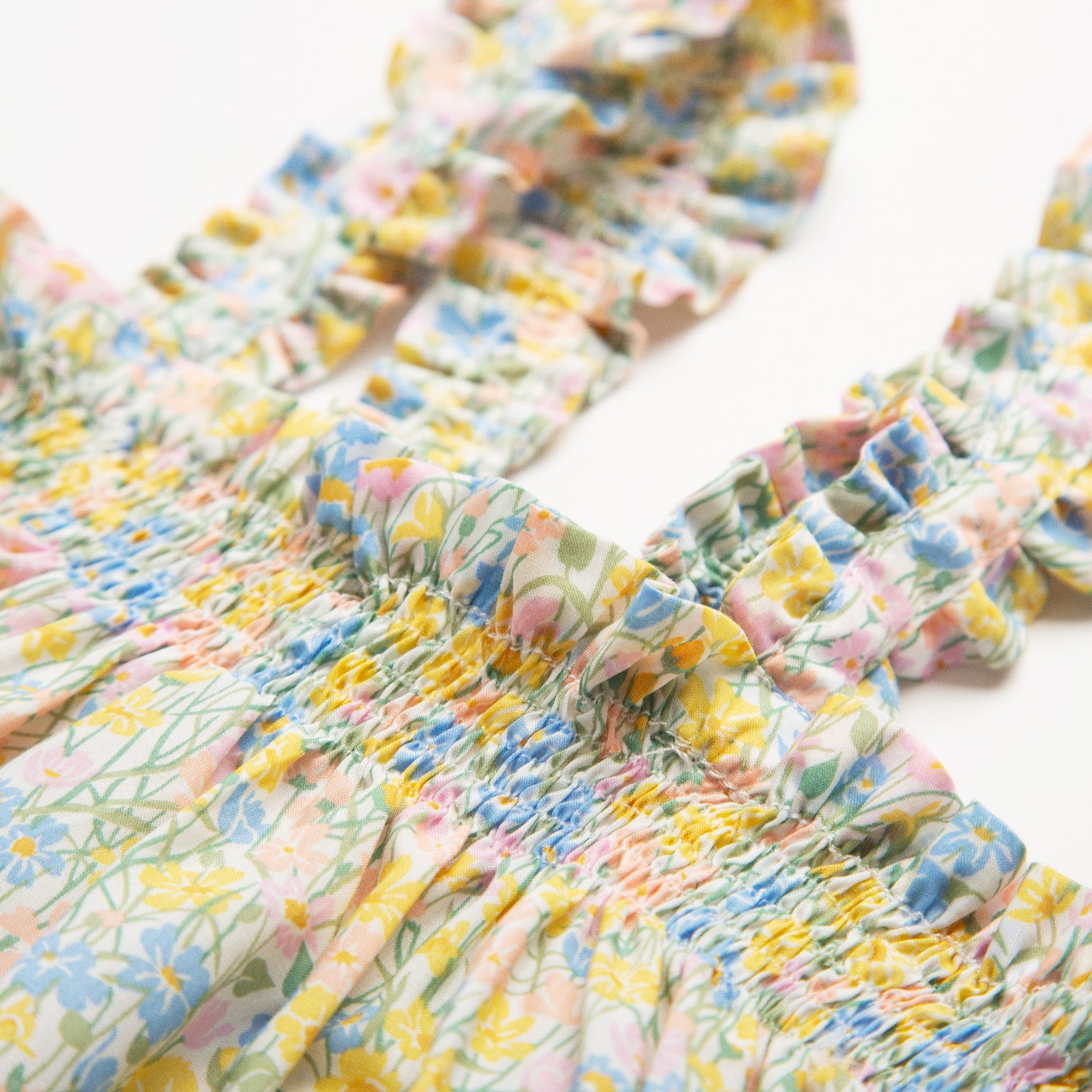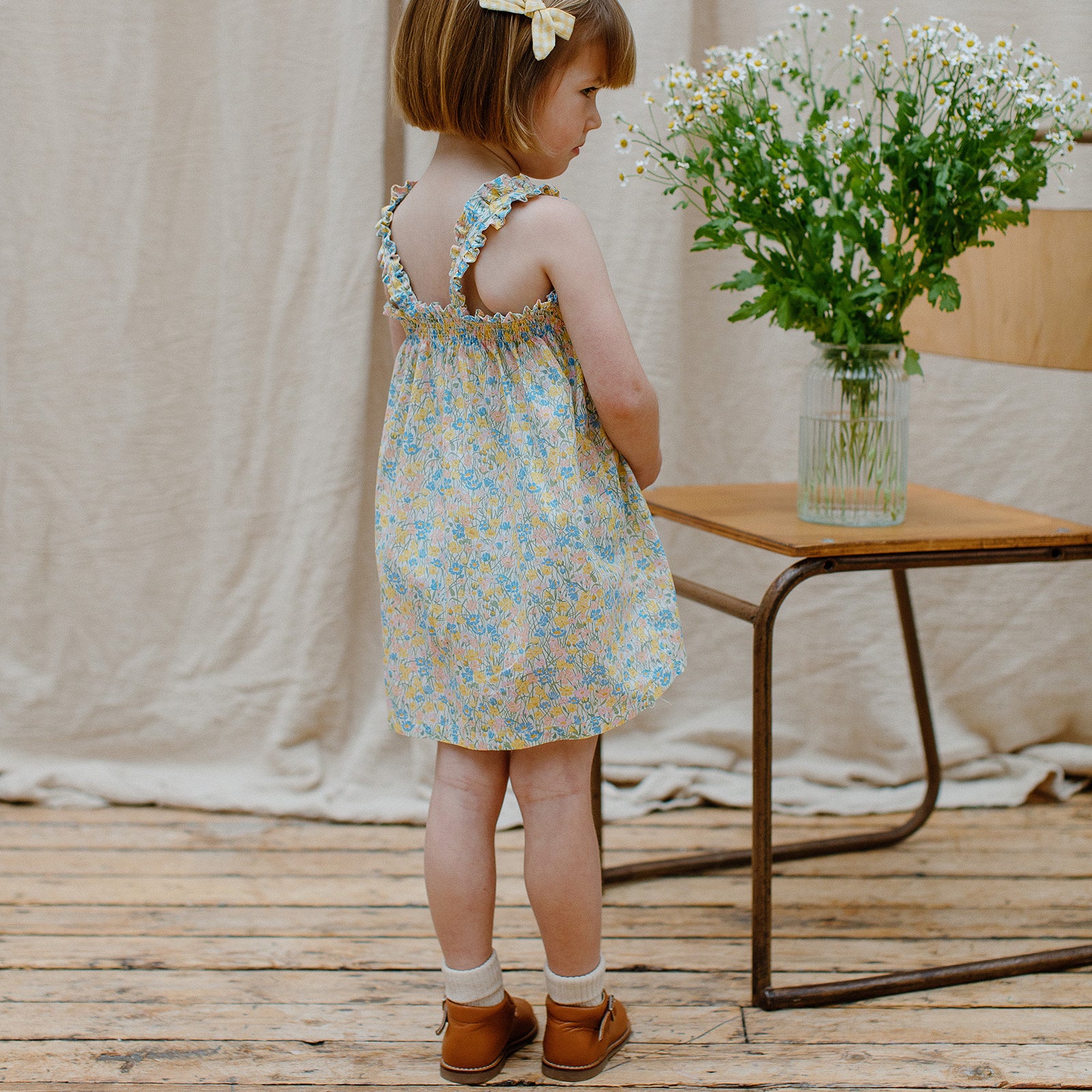 Floaty A-line shaped dress with shirred elastic rows around the top and ruffle detail. Straps lined with ruffles either side meet at the back in a V-shape. Skirt gathers at the chest to create a full, floaty style, designed to sit at a shorter length above the knee. Perfect for layering over a blouse in the cooler weather and stripping back in the summer. Made from beautiful Meadowland Liberty print tana lawn cotton.
