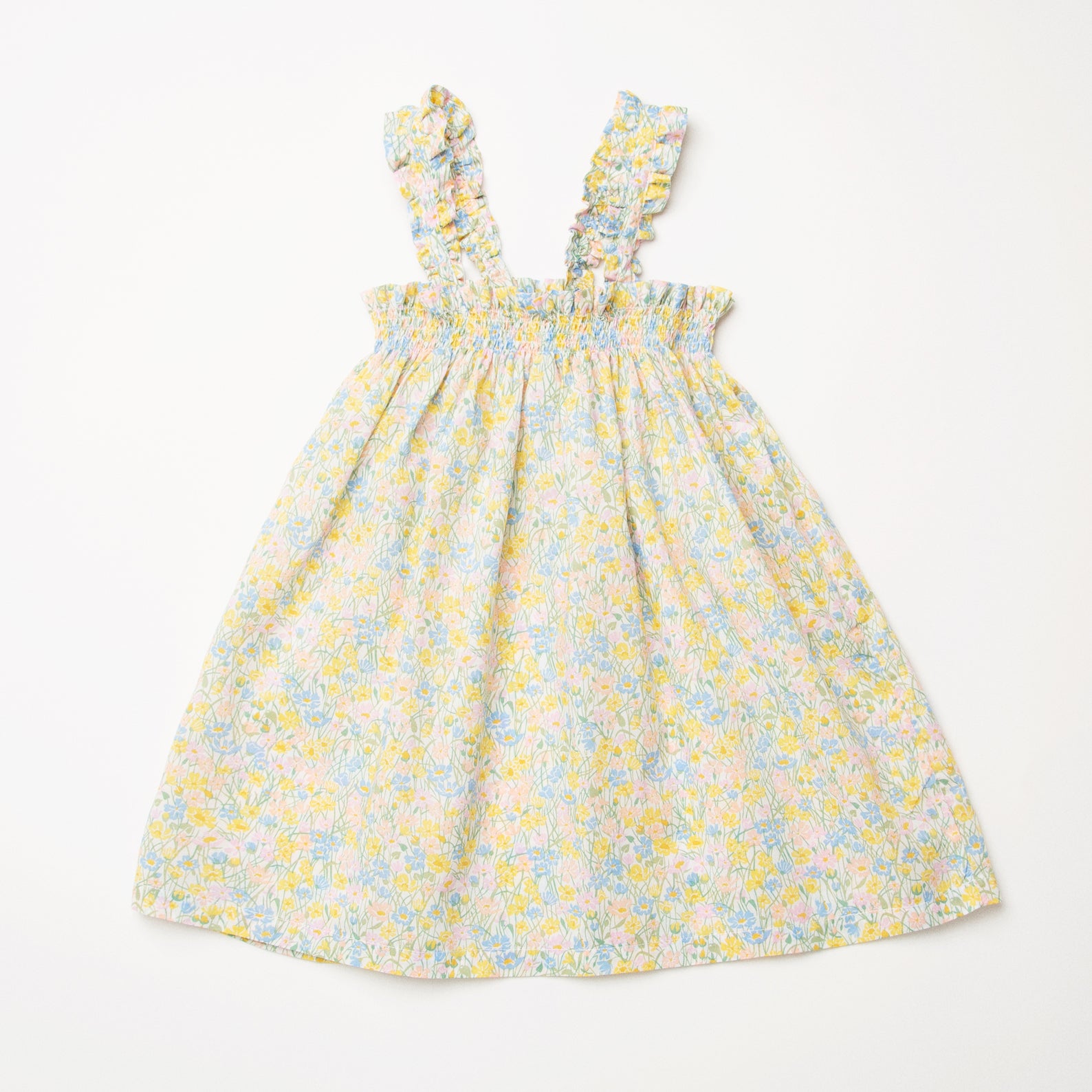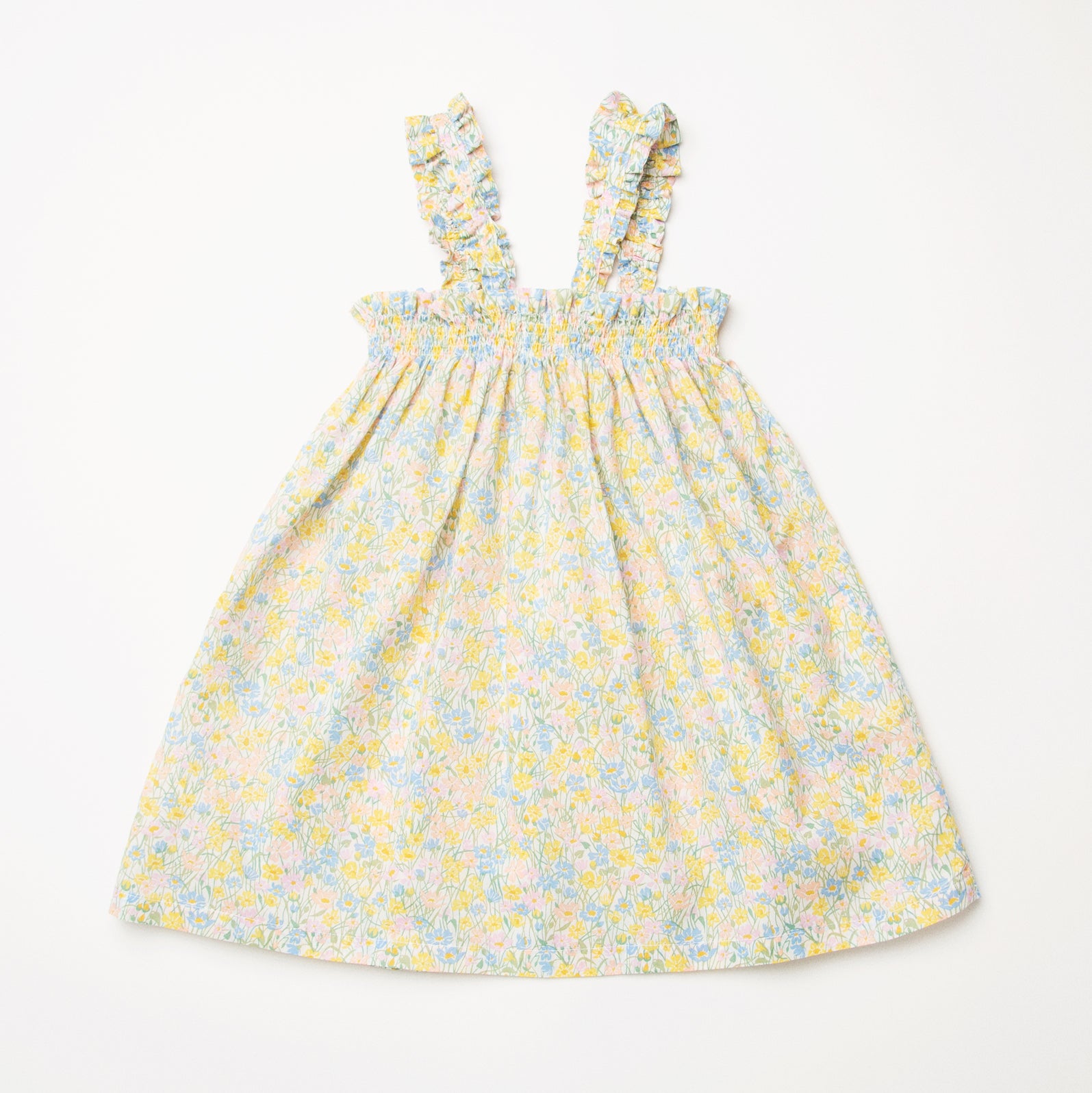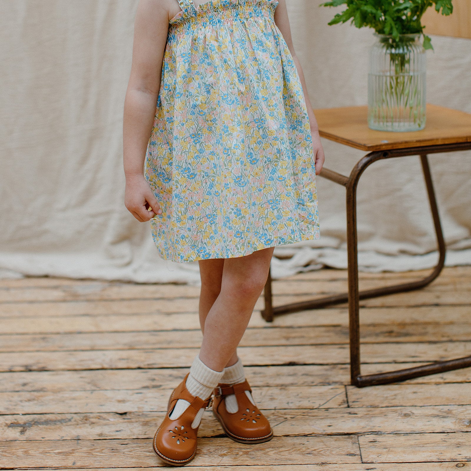 Floaty A-line shaped dress with shirred elastic rows around the top and ruffle detail. Straps lined with ruffles either side meet at the back in a V-shape. Skirt gathers at the chest to create a full, floaty style, designed to sit at a shorter length above the knee. Perfect for layering over a blouse in the cooler weather and stripping back in the summer. Made from beautiful Meadowland Liberty print tana lawn cotton.