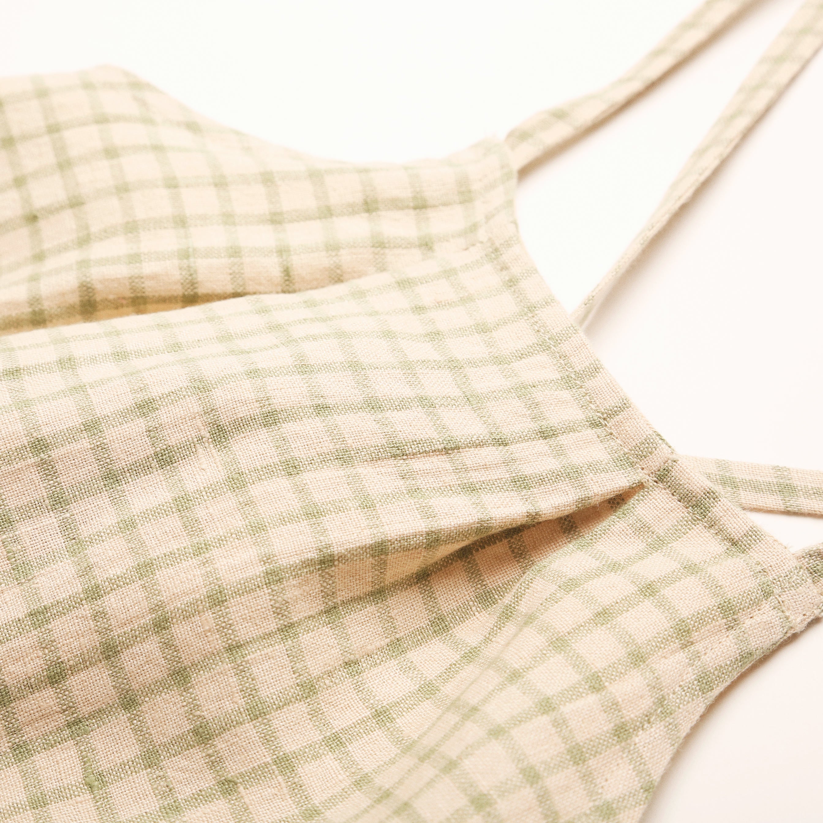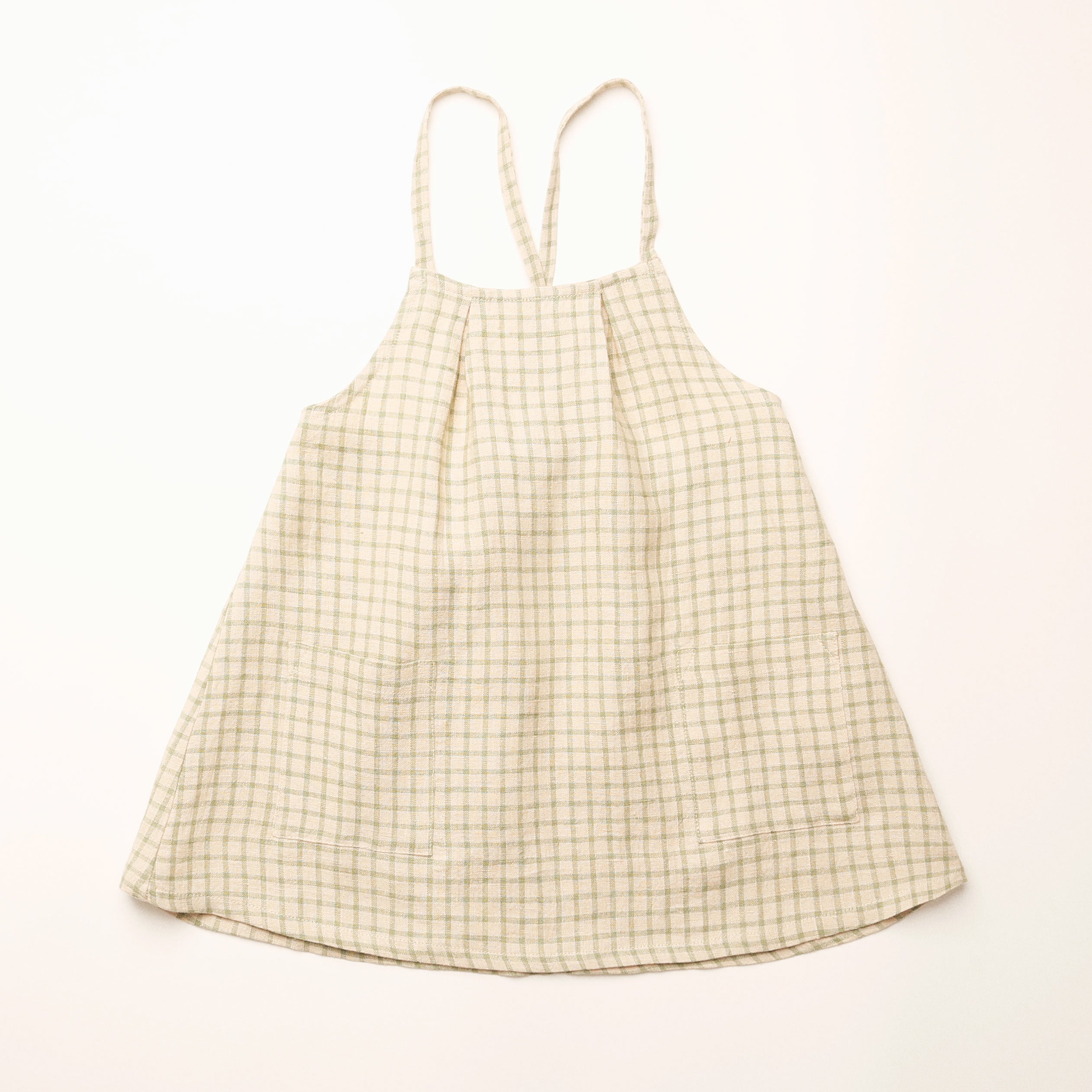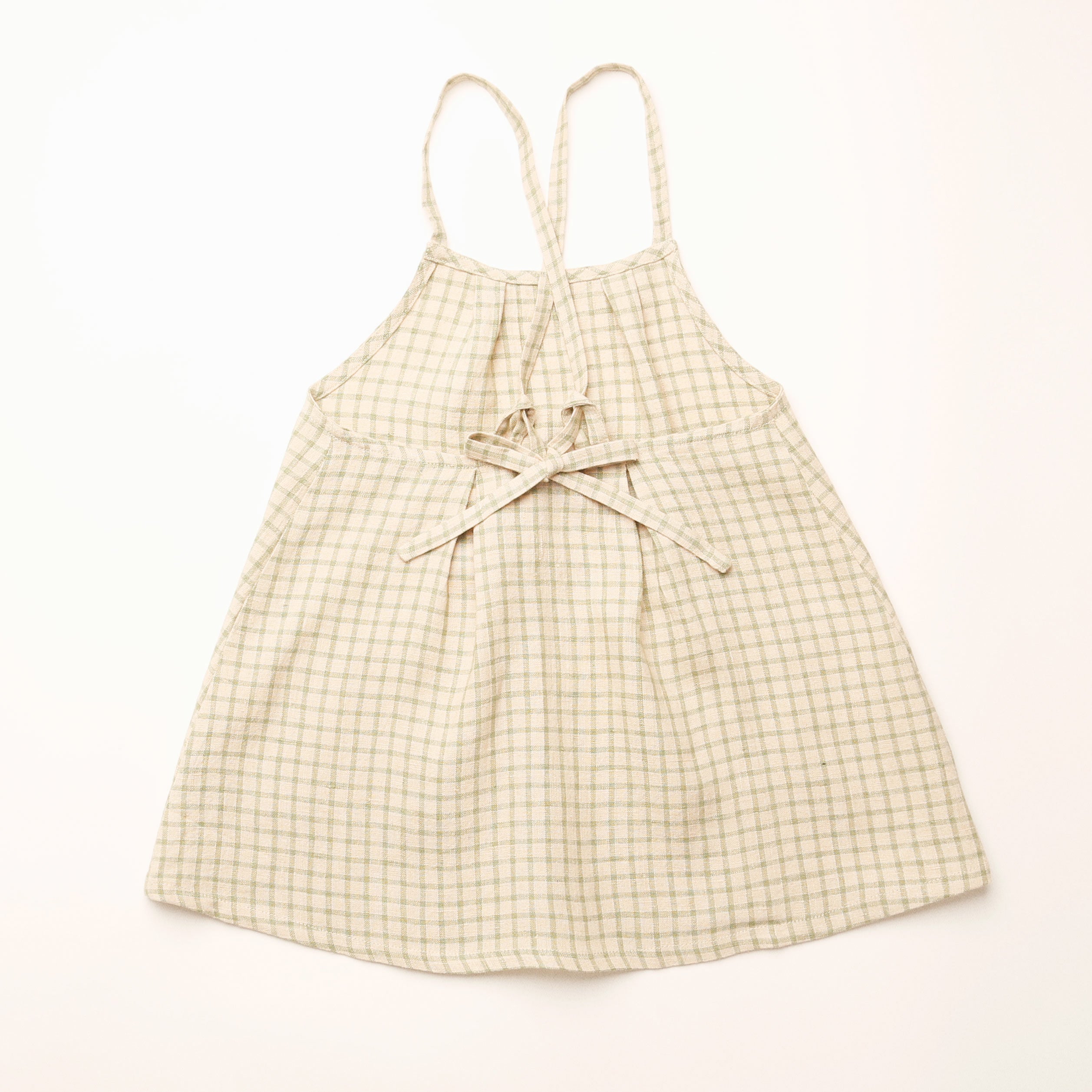 Simple pinafore shaped dress, with front patch pockets and pleats at the front and back to create an A-line shape. Slim straps tie through loops at the back for a comfortable, adjustable fit. Designed to sit at a shorter length above the knee. Made from soft, pistachio windowpane check linen - a medium scale warm oat background layered with a soft pastel green check.