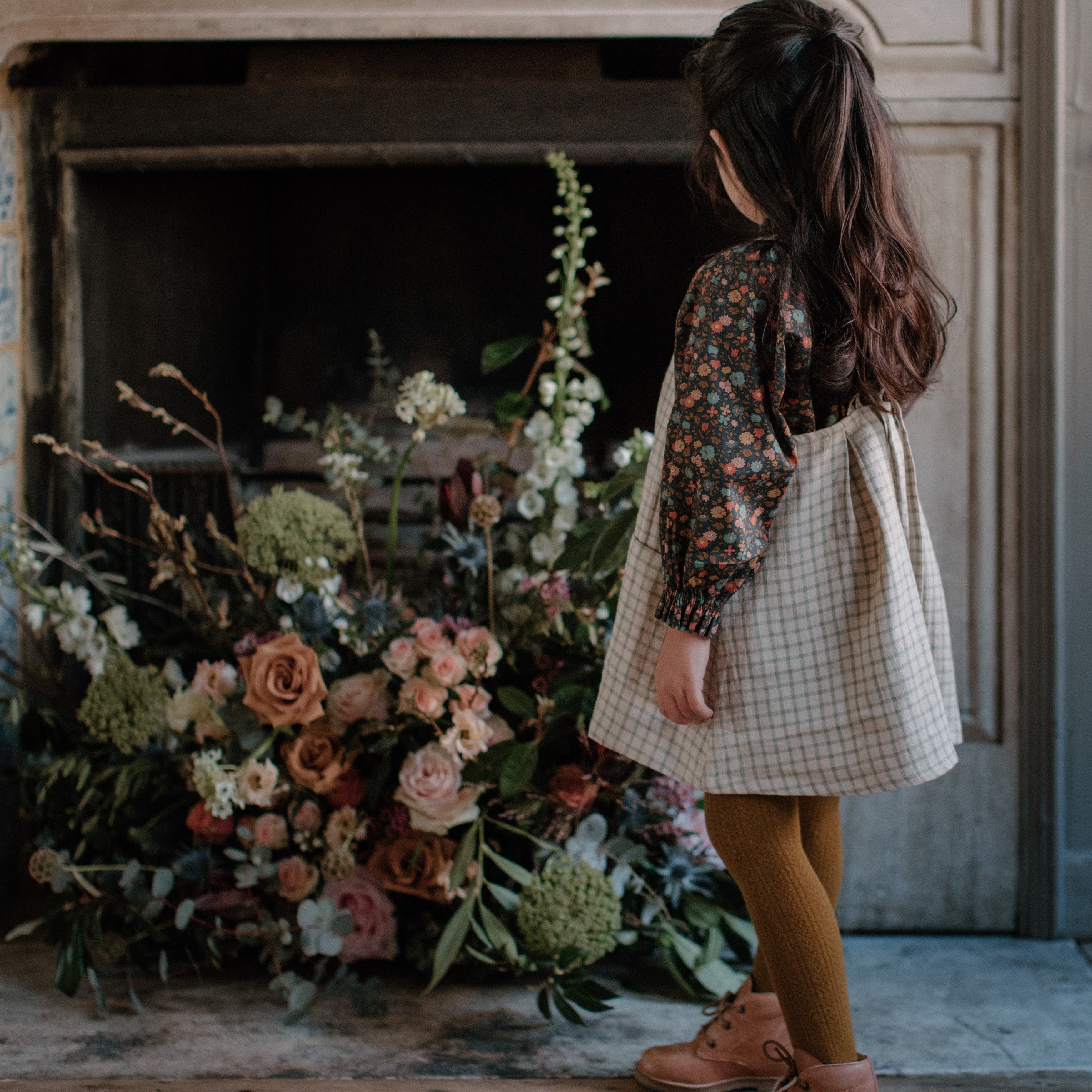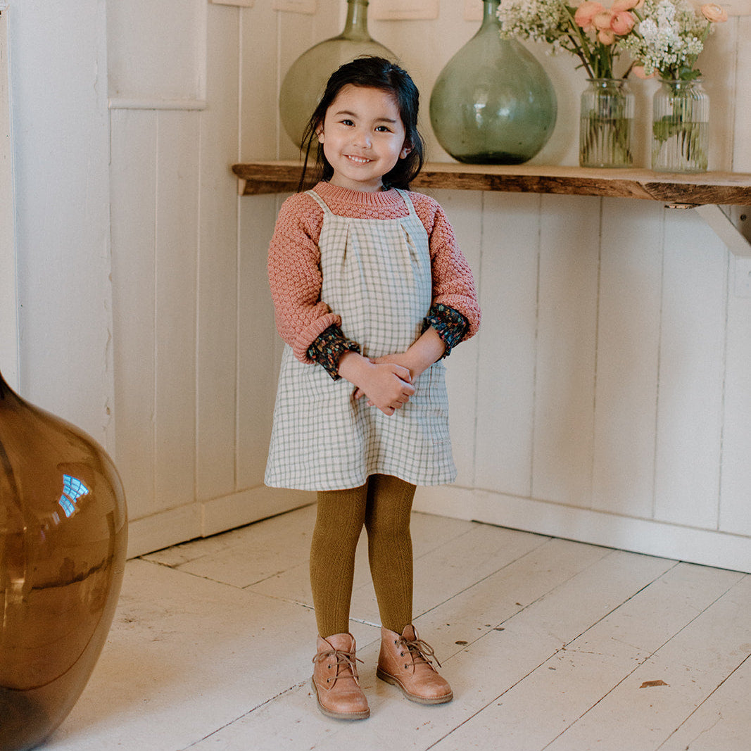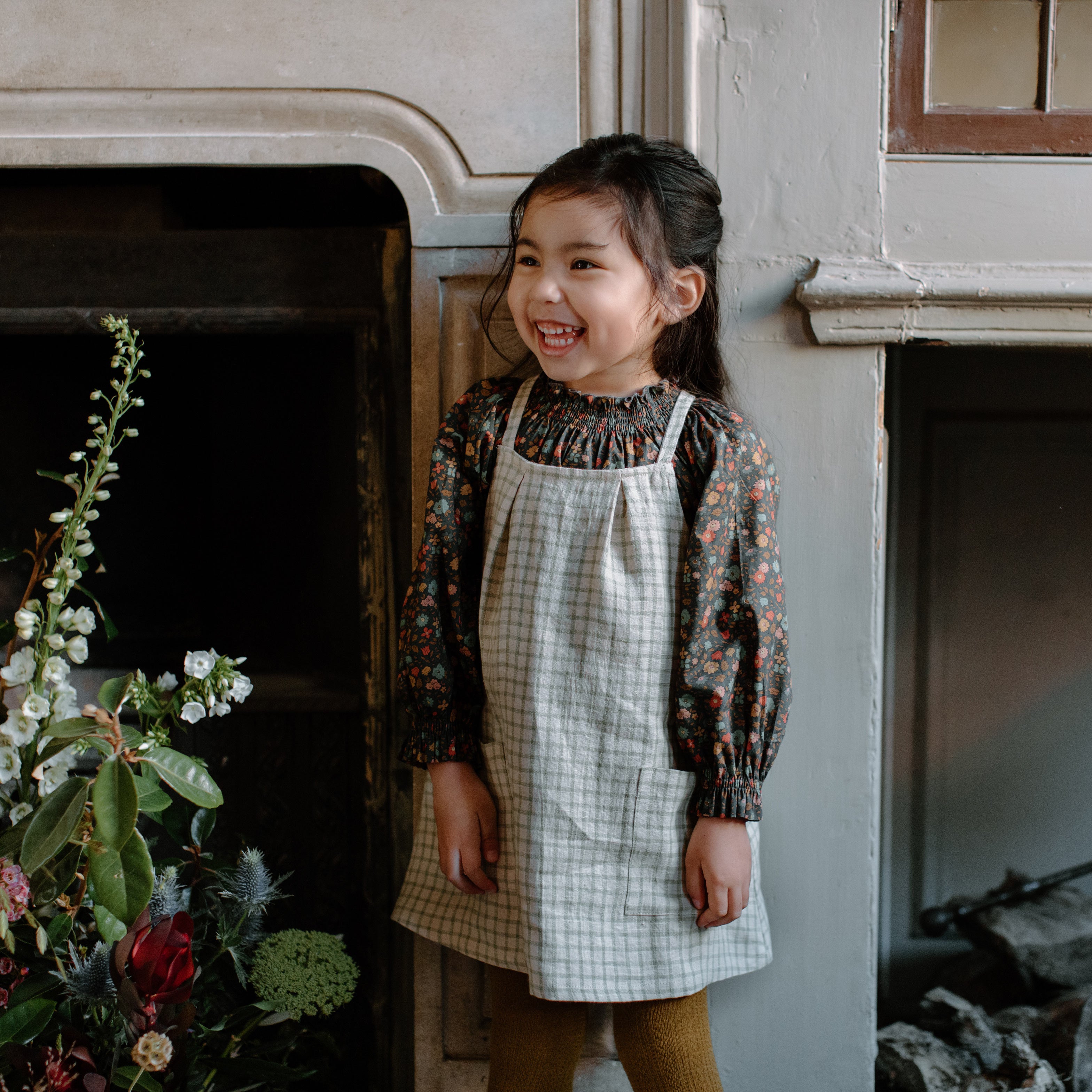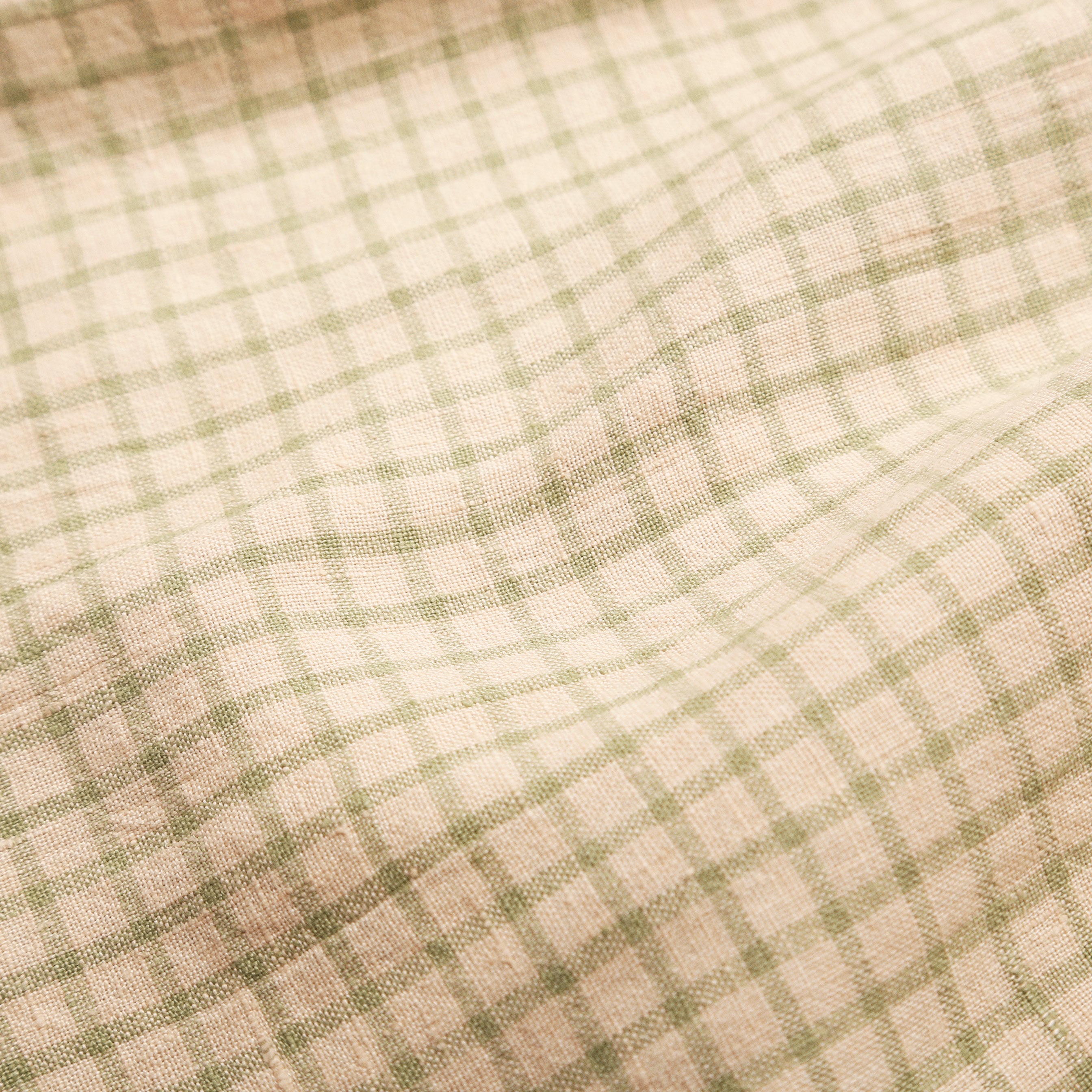 Simple pinafore shaped dress, with front patch pockets and pleats at the front and back to create an A-line shape. Slim straps tie through loops at the back for a comfortable, adjustable fit. Designed to sit at a shorter length above the knee. Made from soft, pistachio windowpane check linen - a medium scale warm oat background layered with a soft pastel green check.