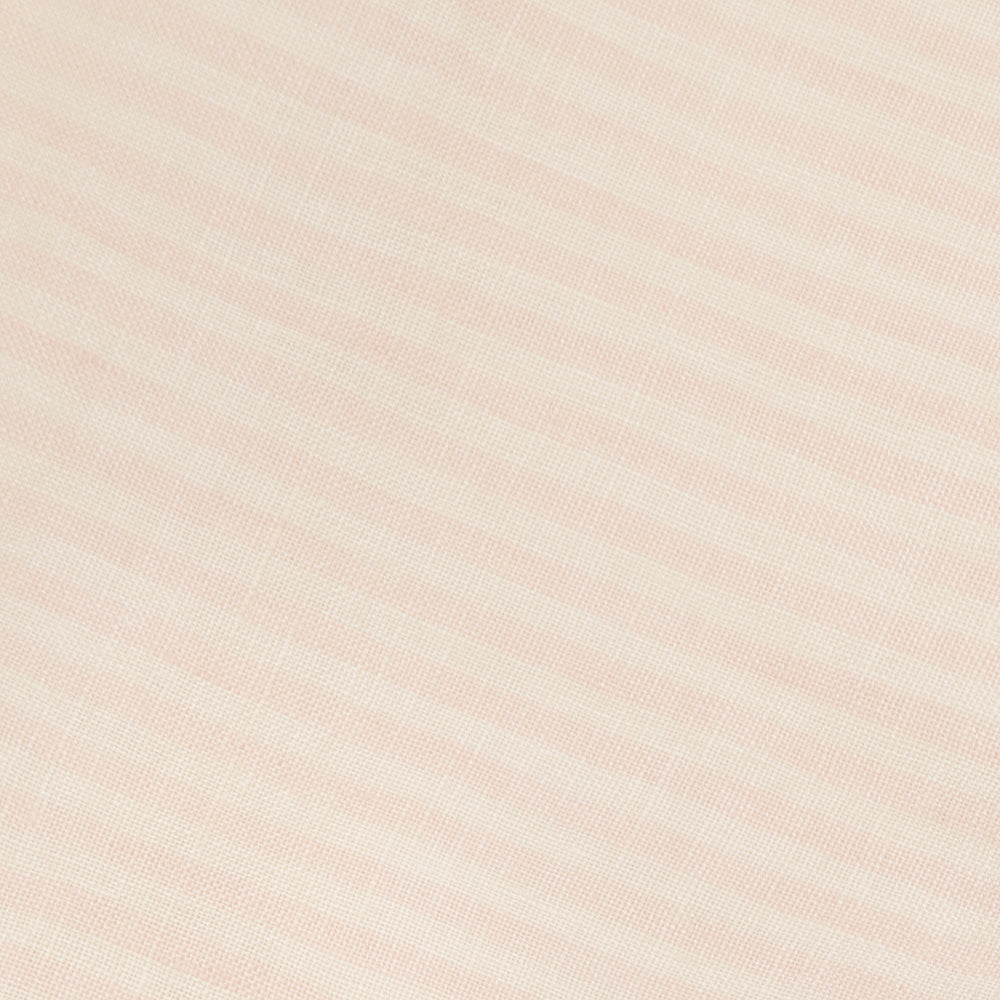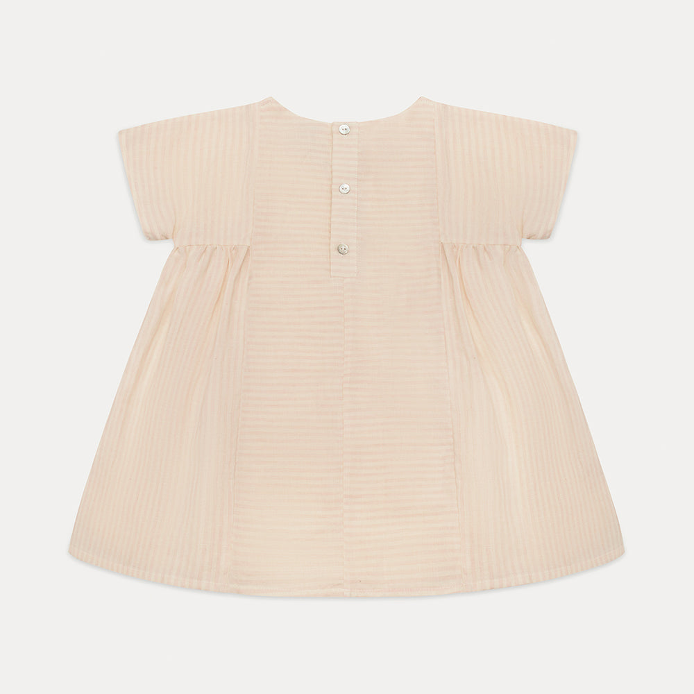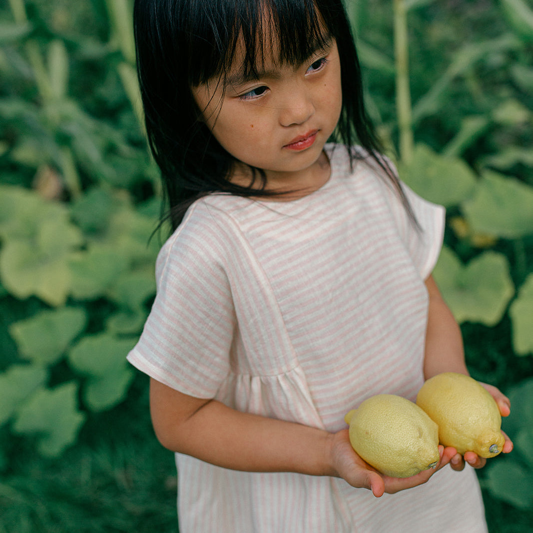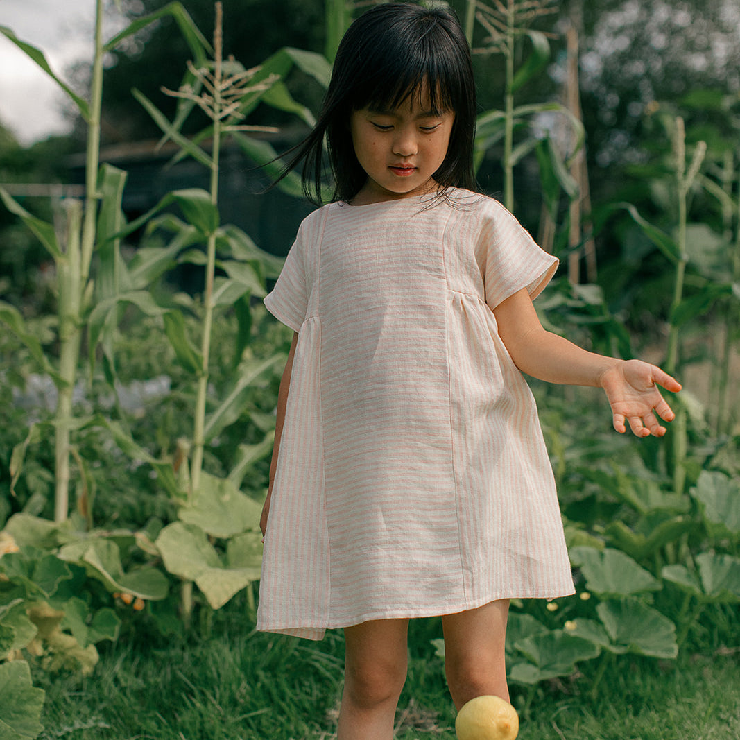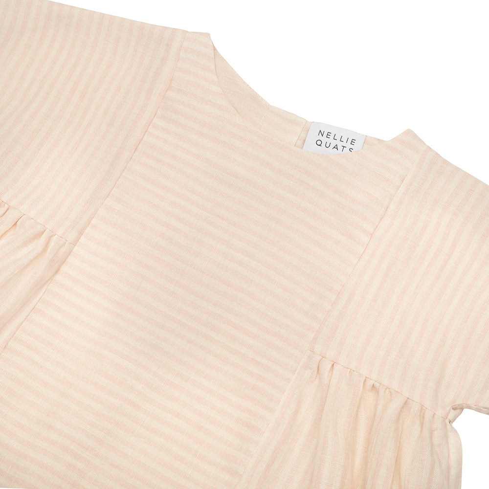 Short boxy sleeved dress with fixed, straight front and back panels, and gathering on either side under the arms. Mother of Pearl buttons sit down the back of the neck. Designed to be oversized for a stylish, comfortable fit. Made from soft, blush & oat stripe OEKO TEX certified linen, a pale pink and warm cream colour linen woven together into small stripes.