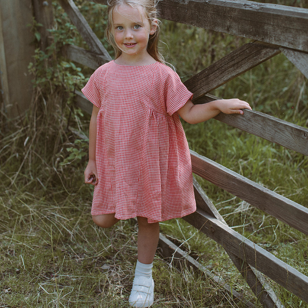 Short boxy sleeved dress with fixed, straight front and back panels, and gathering on either side under the arms. Mother of Pearl buttons sit down the back of the neck. Designed to be oversized for a stylish, comfortable fit. Made from soft, strawberry & oat mini check linen, a vibrant red and muted oat colour linen woven together in a small check.