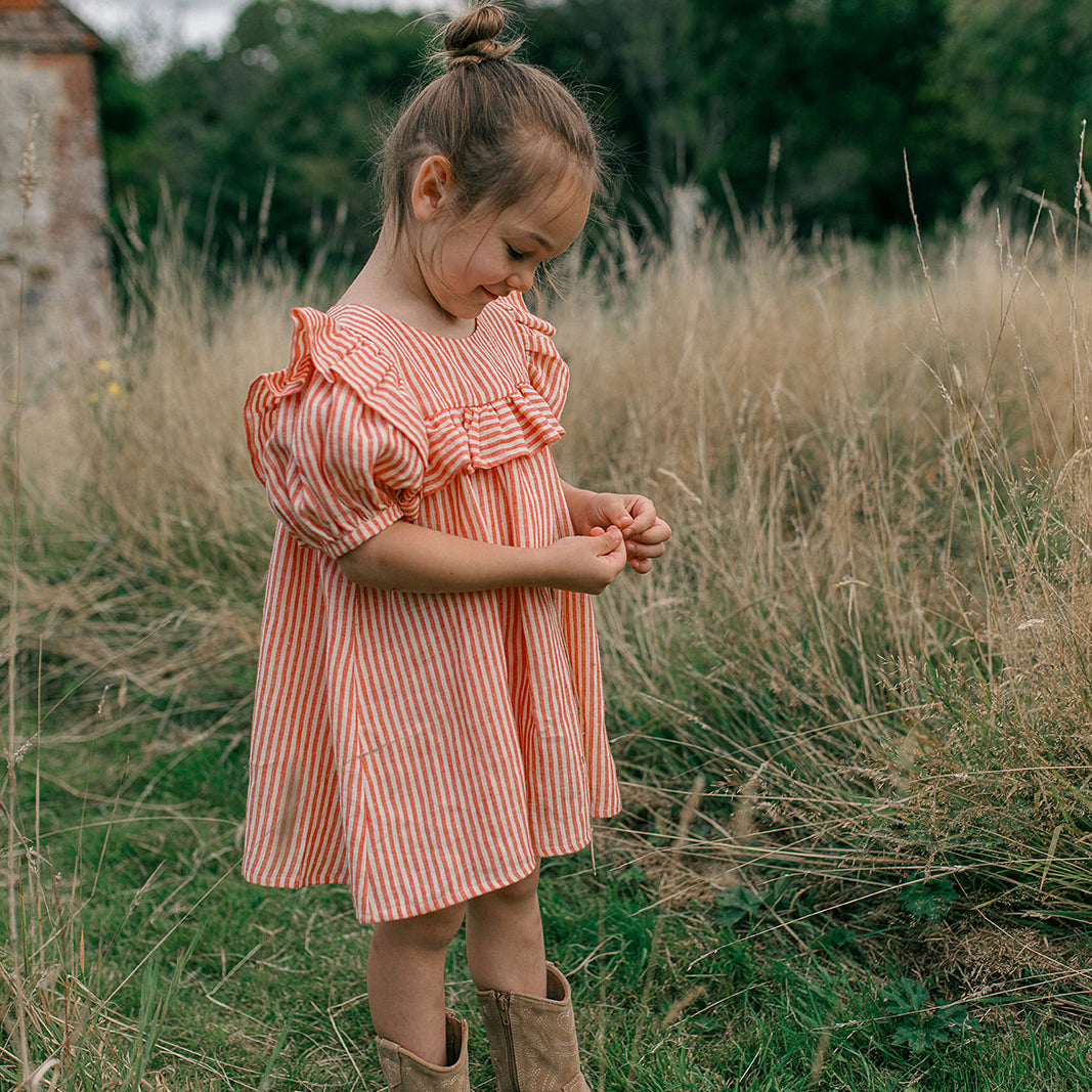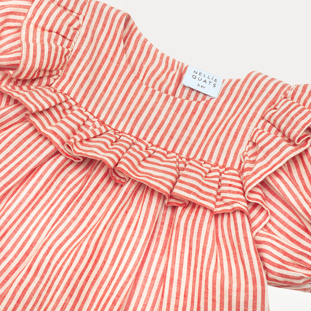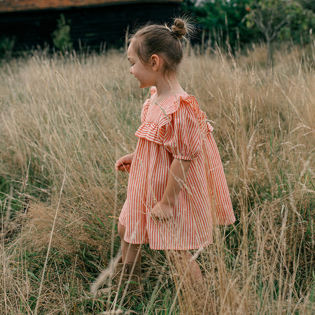 Loose fit dress, with large over shoulder and bodice ruffles. Oversized puffed sleeves finish with elasticated cuffs, and dress opens with mother of pearl buttons down the back. Attached gathered skirt sits above the knee. Designed to be oversized for a stylish, comfortable fit. Made from soft, strawberry & oat stripe OEKO TEX certified linen, a vibrant red and warm cream colour linen woven together into small stripes.