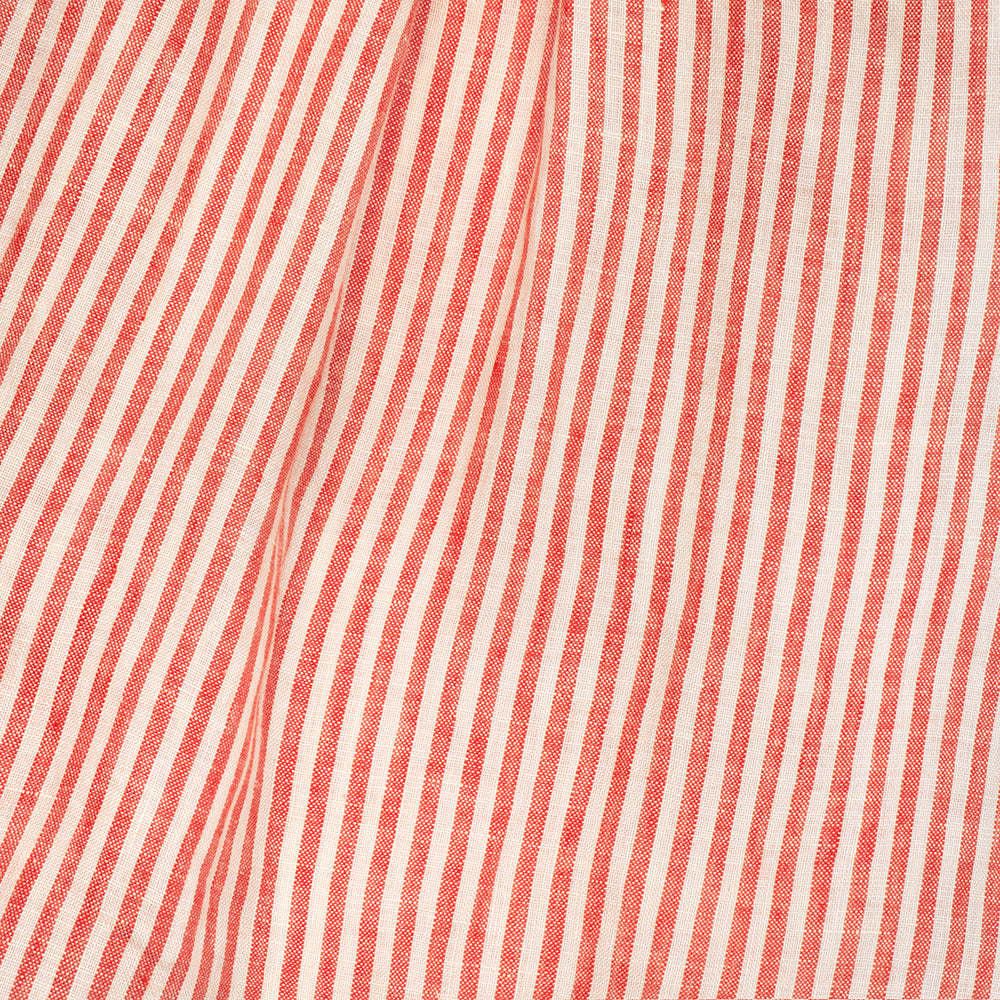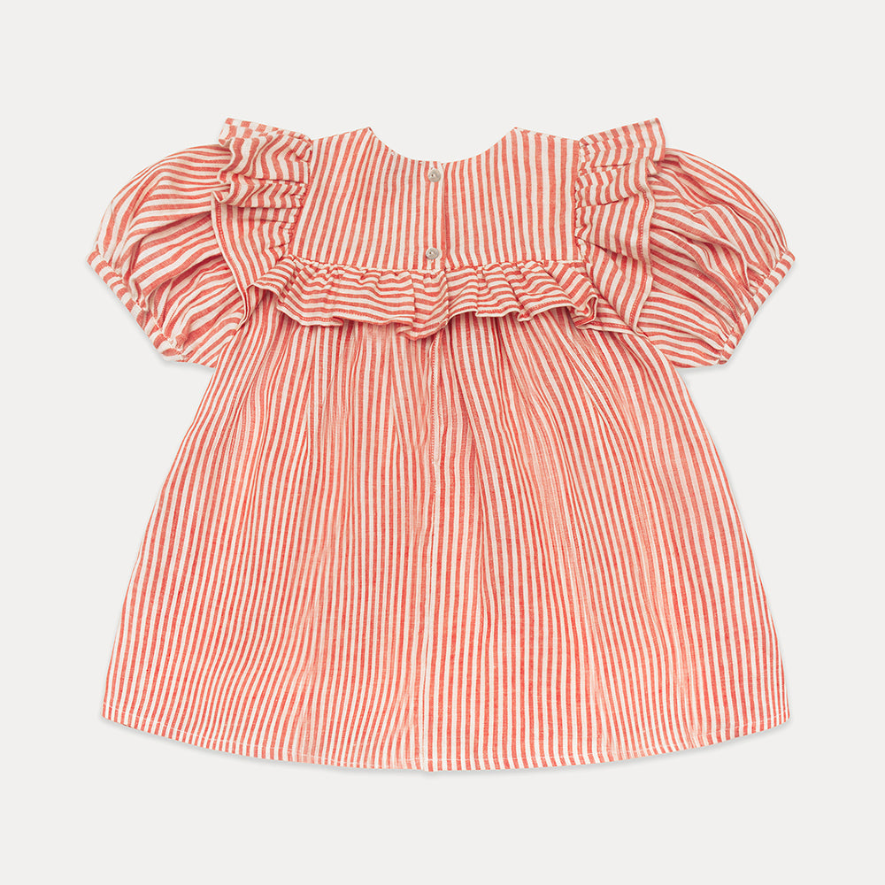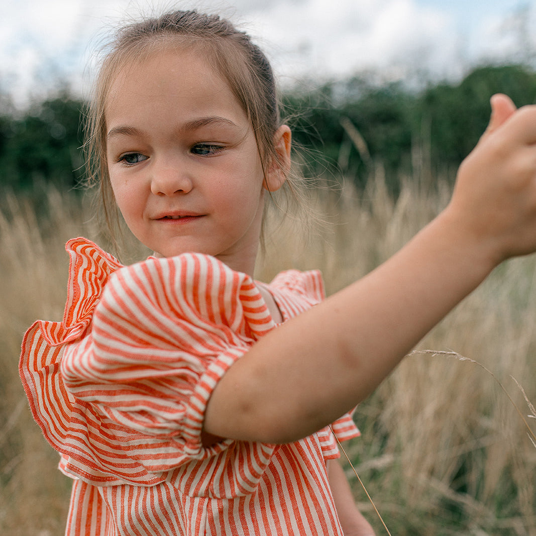 Loose fit dress, with large over shoulder and bodice ruffles. Oversized puffed sleeves finish with elasticated cuffs, and dress opens with mother of pearl buttons down the back. Attached gathered skirt sits above the knee. Designed to be oversized for a stylish, comfortable fit. Made from soft, strawberry & oat stripe OEKO TEX certified linen, a vibrant red and warm cream colour linen woven together into small stripes.
