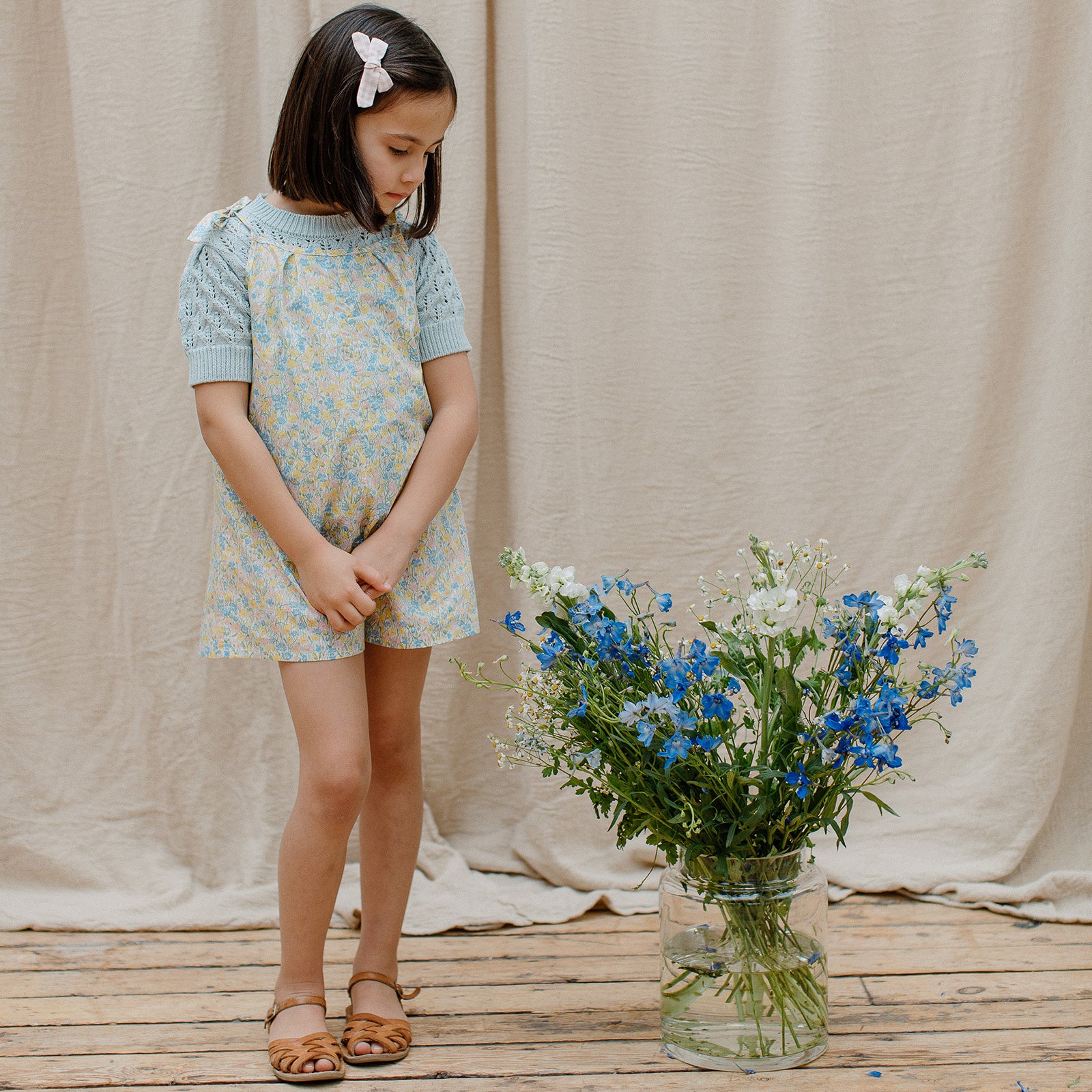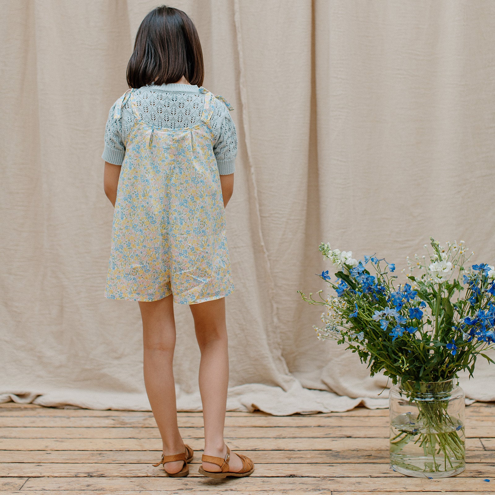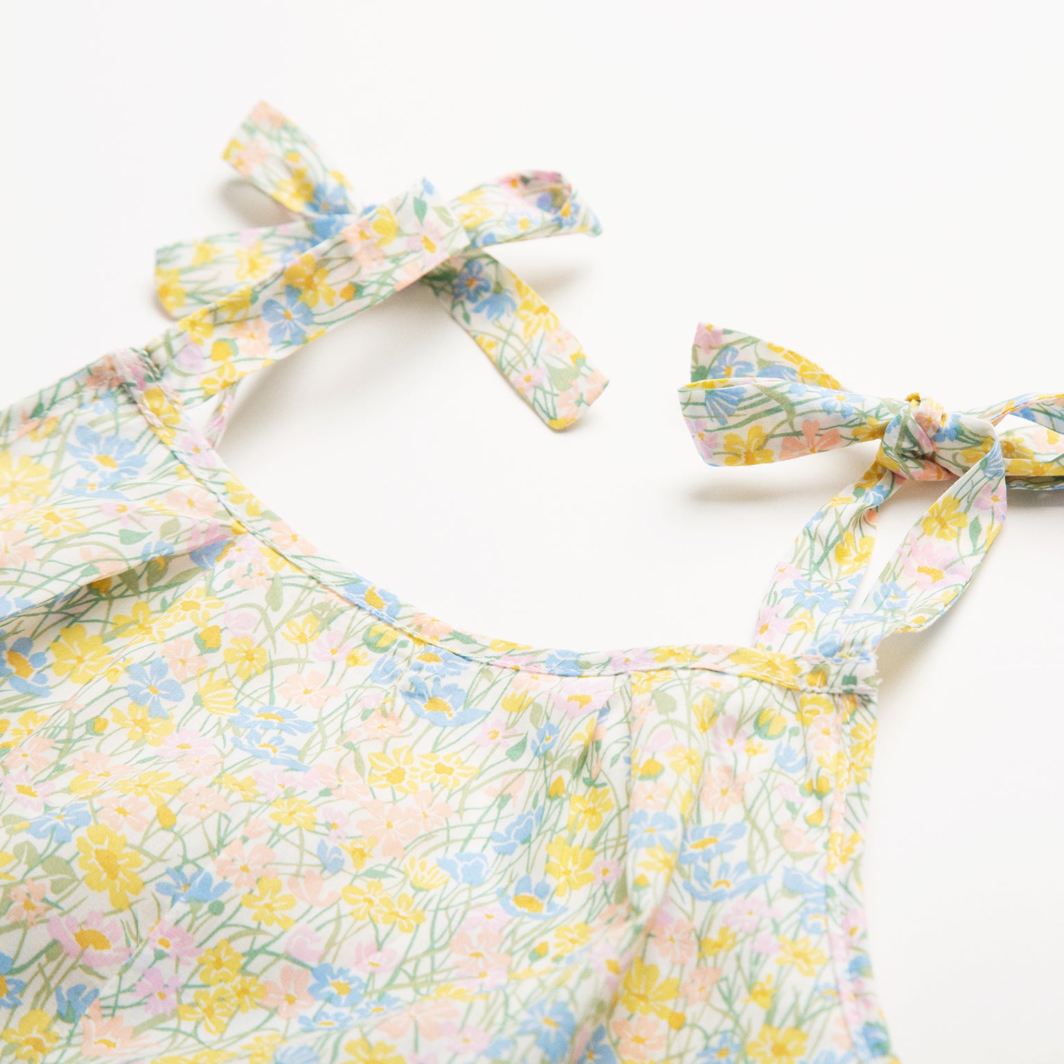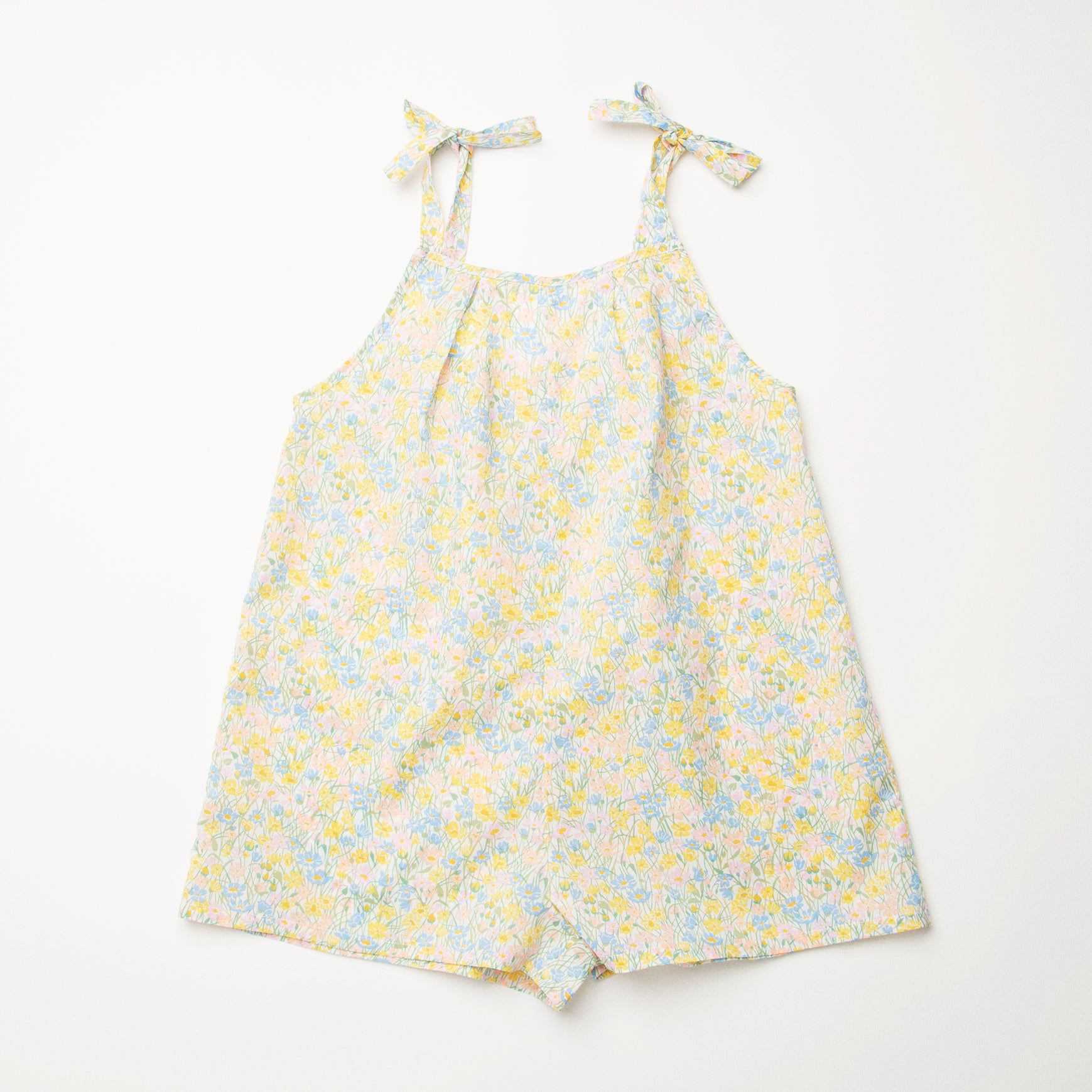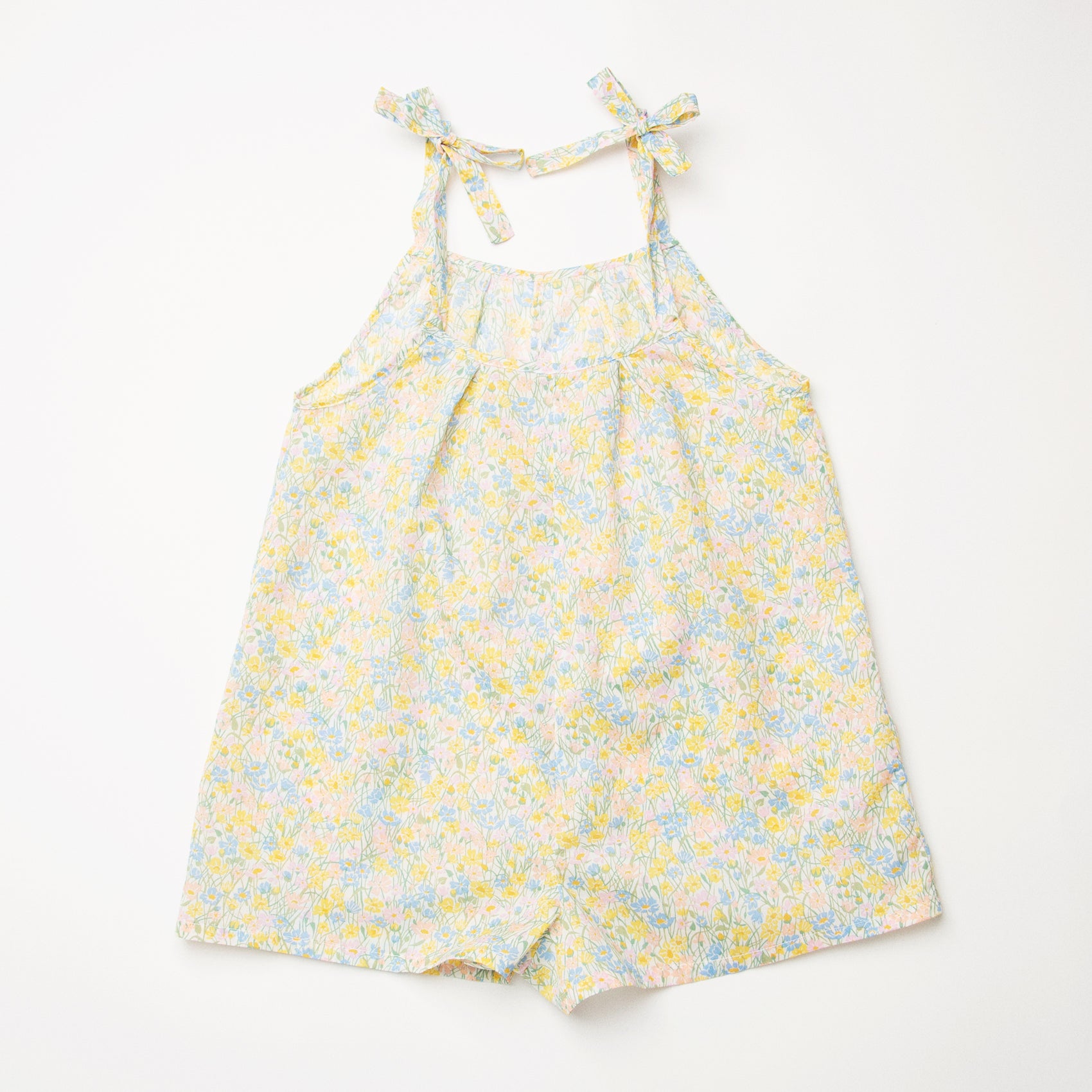 A-line shaped playsuit, with adjustable tie up shoulder straps and gathering at the front and back for an oversized, comfortable fit. Drops lower at the back and designed to be short. Made from soft, lemon check linen - a small scale yellow check interwoven with warm white colour.