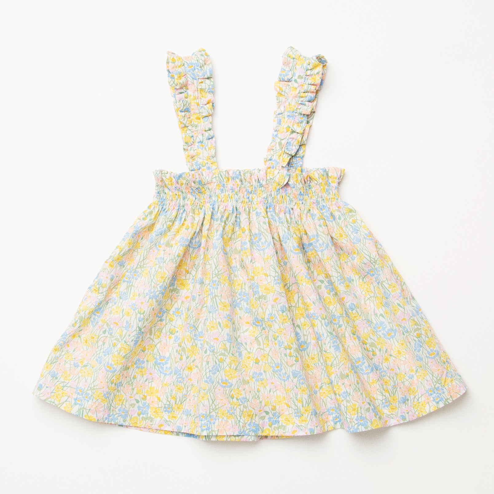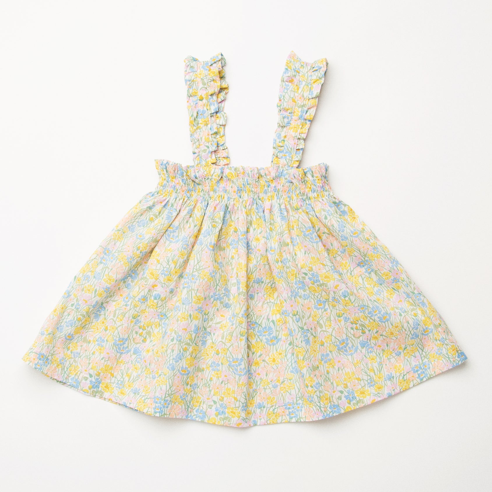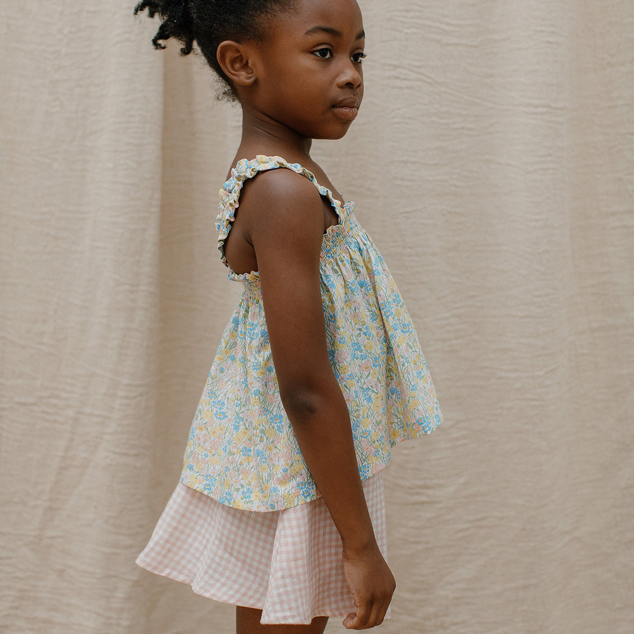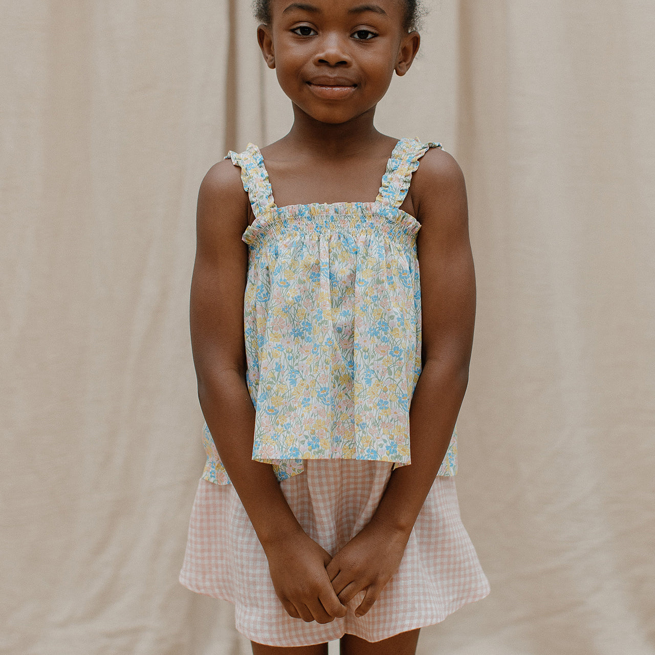 Floaty A-line shaped top with shirred elastic rows around the top and ruffle detail. Straps lined with ruffles either side meet at the back in a V-shape. Top gathers at the chest to create a full, floaty style. Made from beautiful Meadowland Liberty print tana lawn cotton.