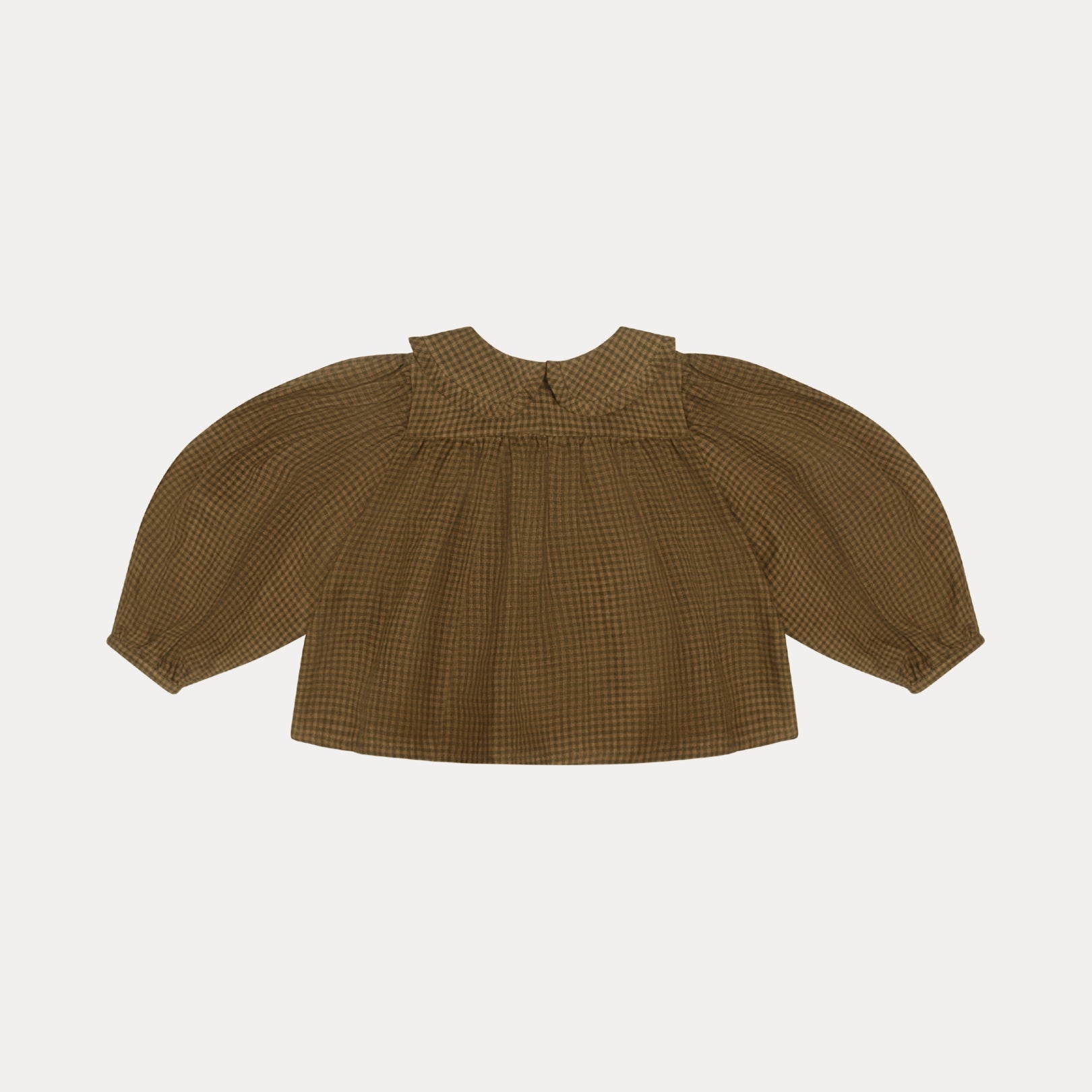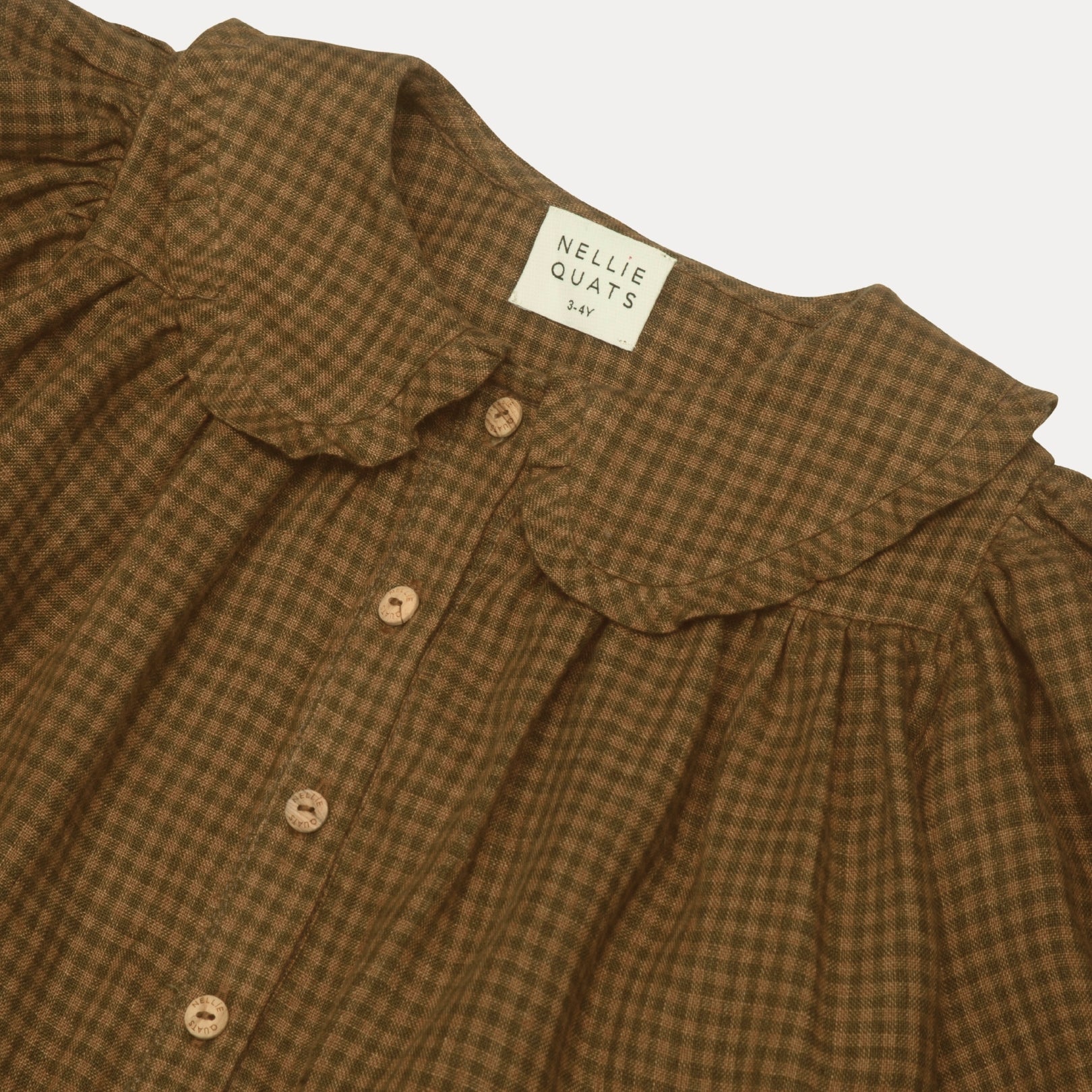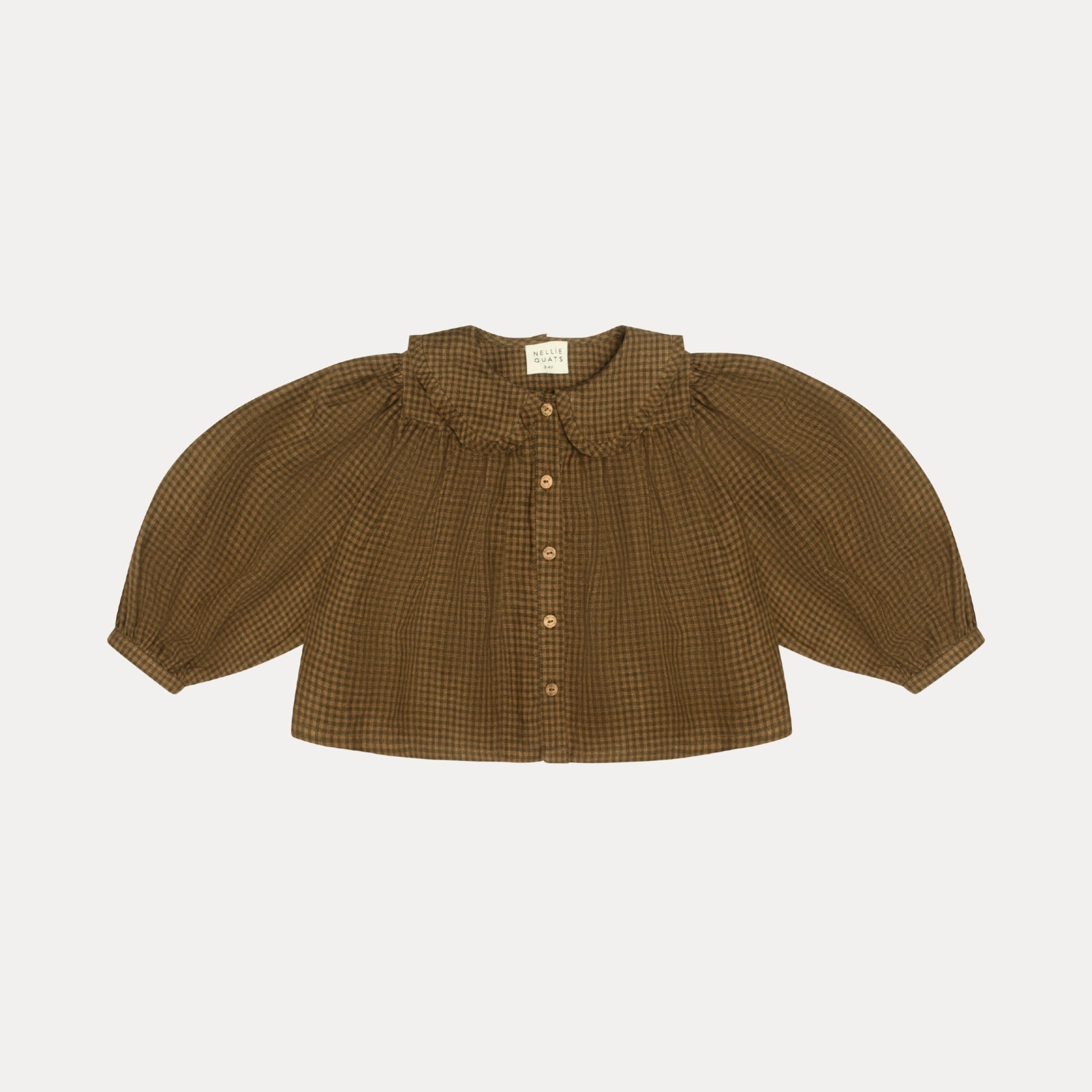 High empire line gathers into a loose fit, flowing blouse, with full length puffed sleeves and fixed cuffs. The neckline features an oversized collar with gathered ruffle trim, and wooden buttons run down the front of the blouse to open. Made from super soft nut brown mini check linen - a warm brown interwoven with a dark olive green.