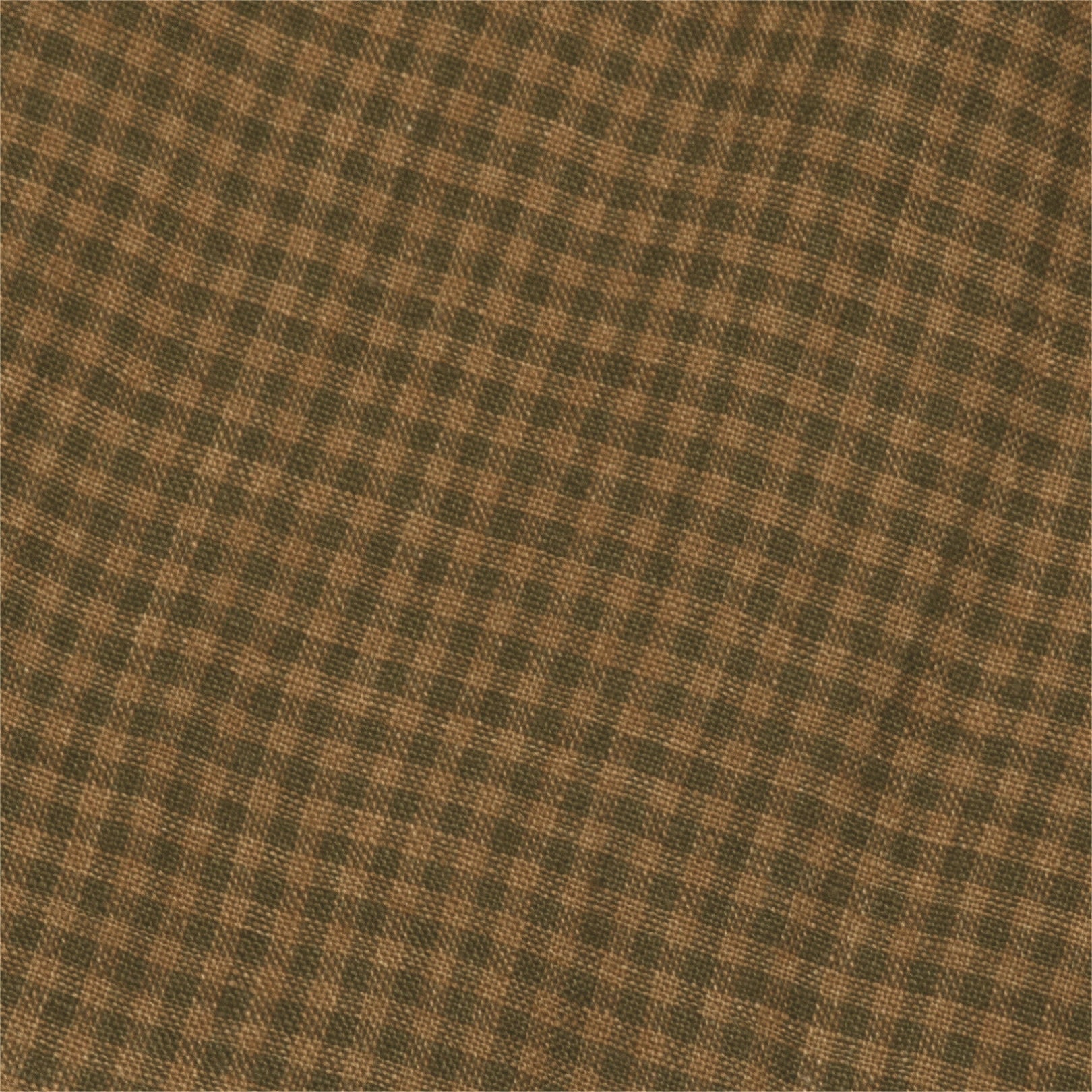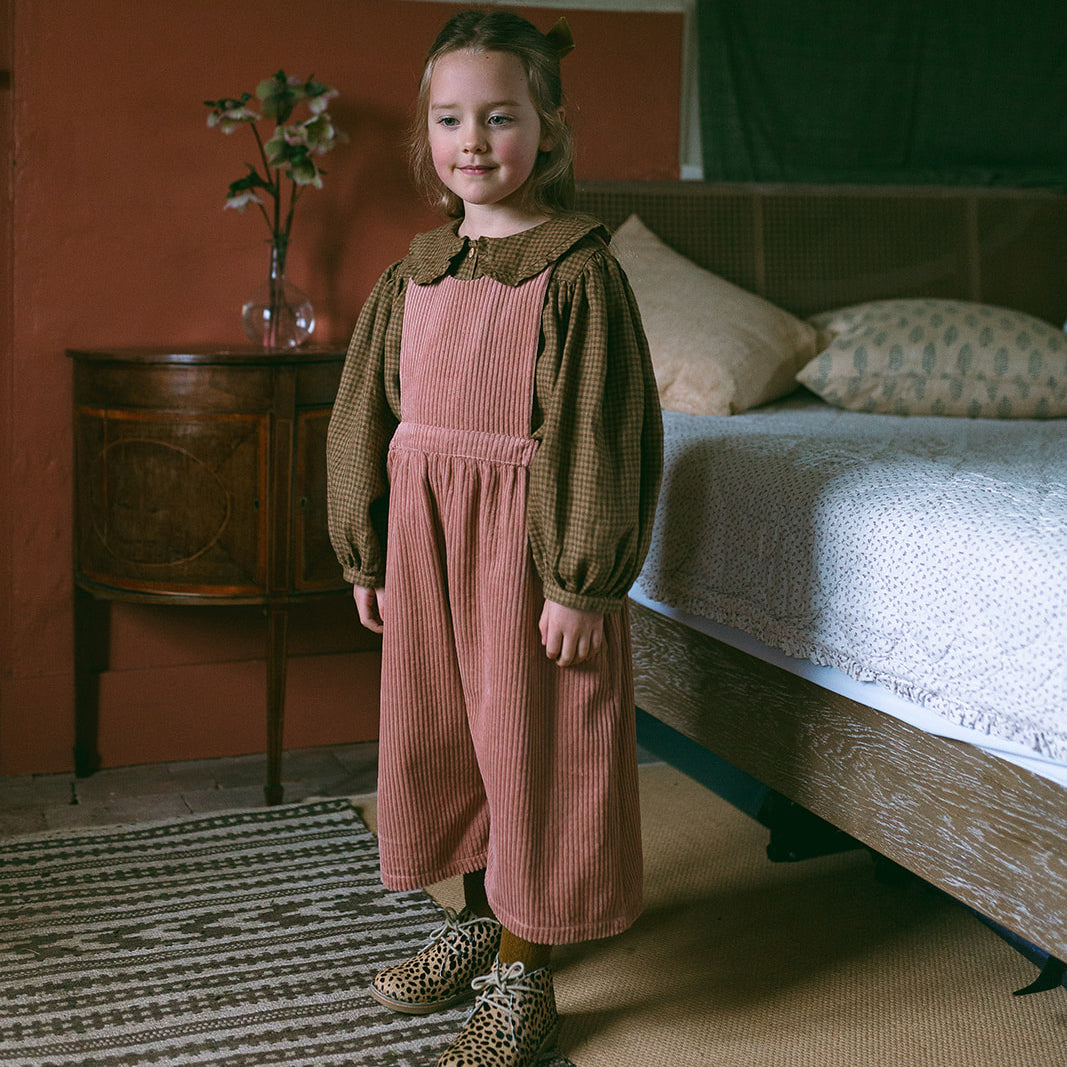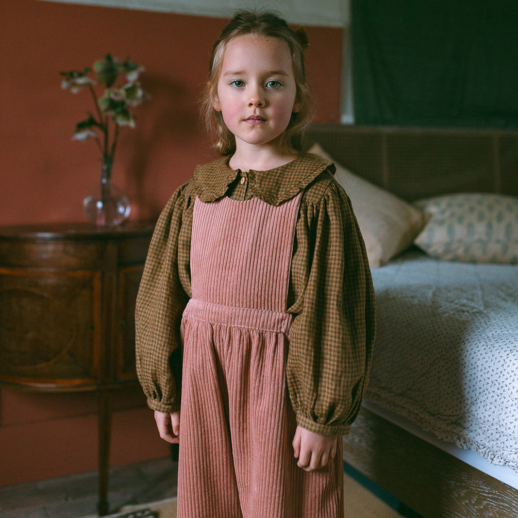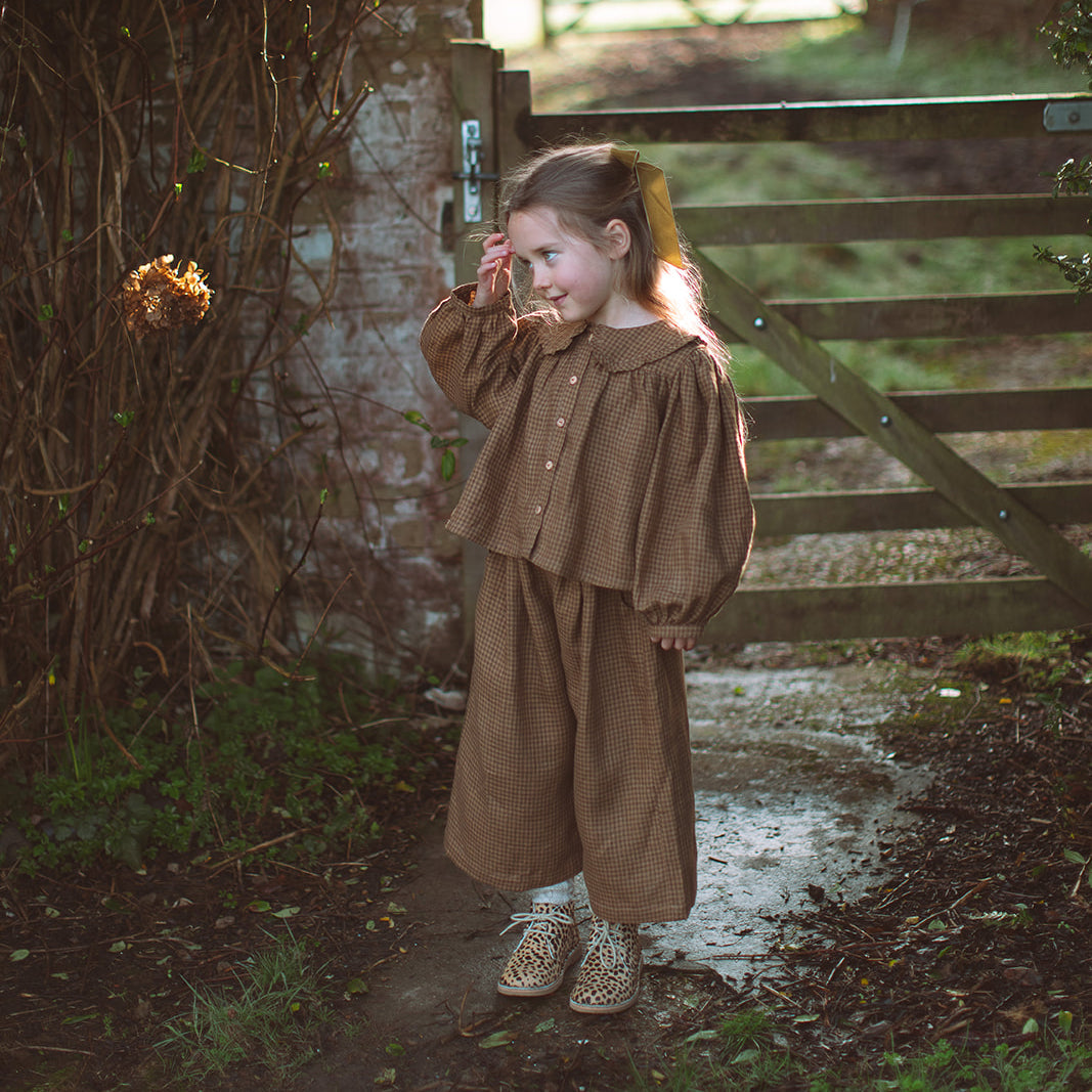 High empire line gathers into a loose fit, flowing blouse, with full length puffed sleeves and fixed cuffs. The neckline features an oversized collar with gathered ruffle trim, and wooden buttons run down the front of the blouse to open. Made from super soft nut brown mini check linen - a warm brown interwoven with a dark olive green.