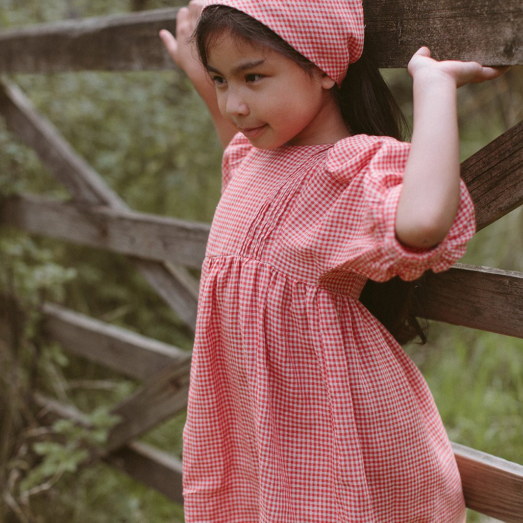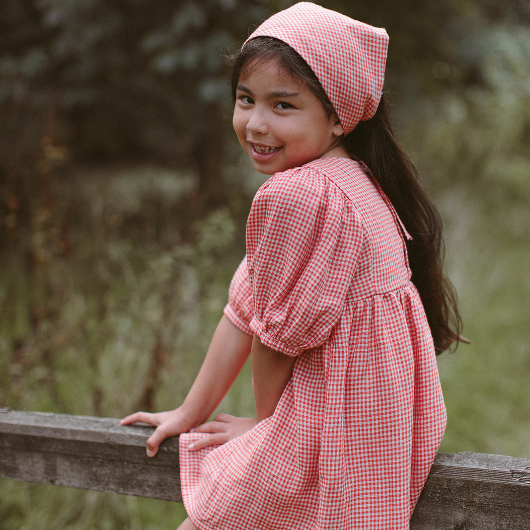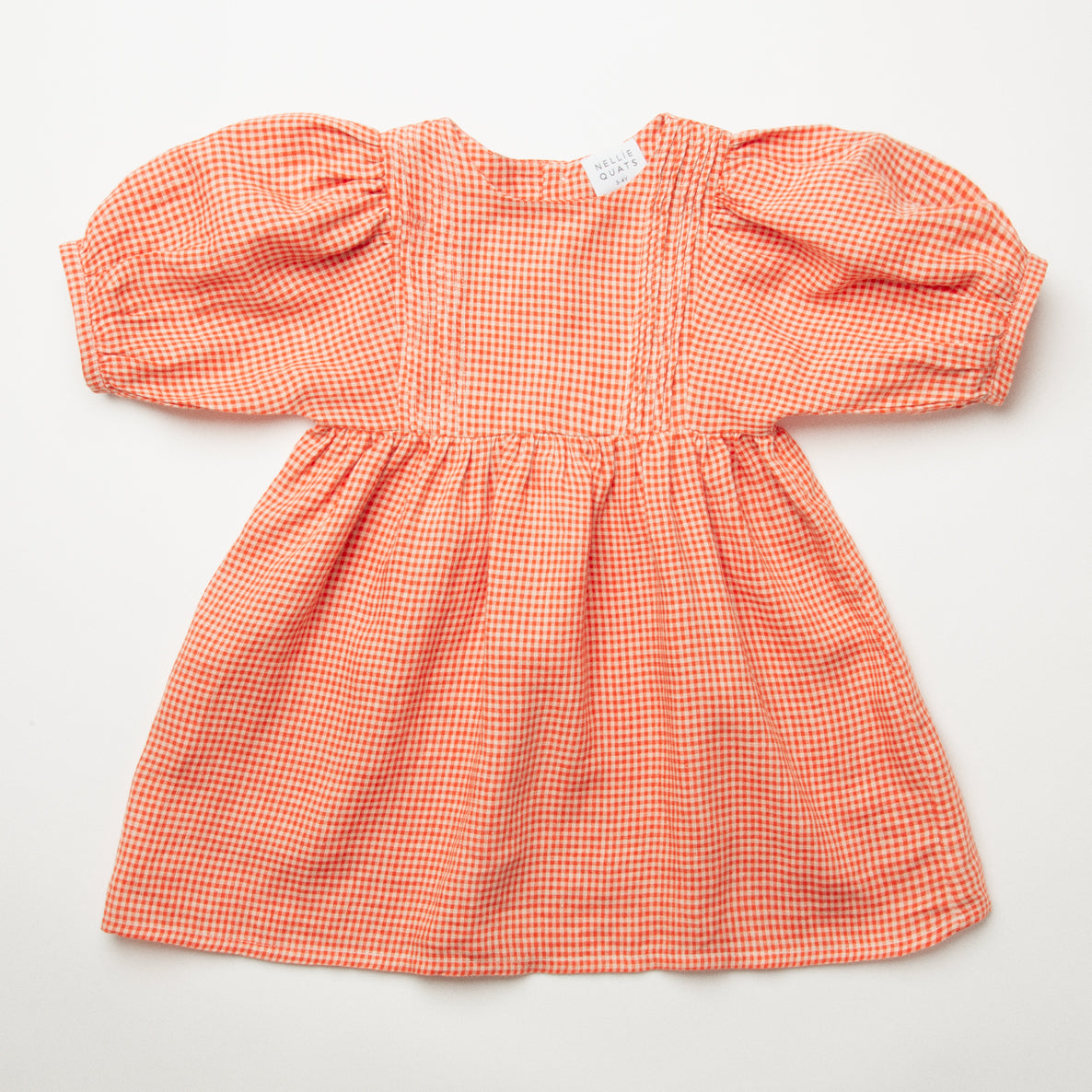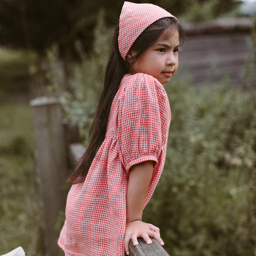 Three quarter length sleeve dress with small decorative pleats up either side of the bodice and Mother of Pearl buttons up the back. Attached gathered skirt designed to sit above the knee. Made from soft, strawberry & oat mini check linen, a vibrant red and muted oat colour linen woven together in a small check.