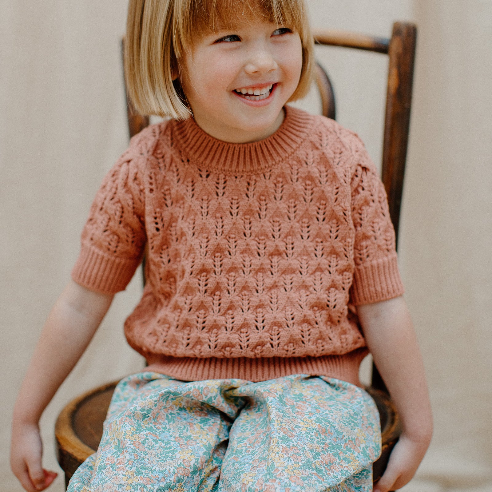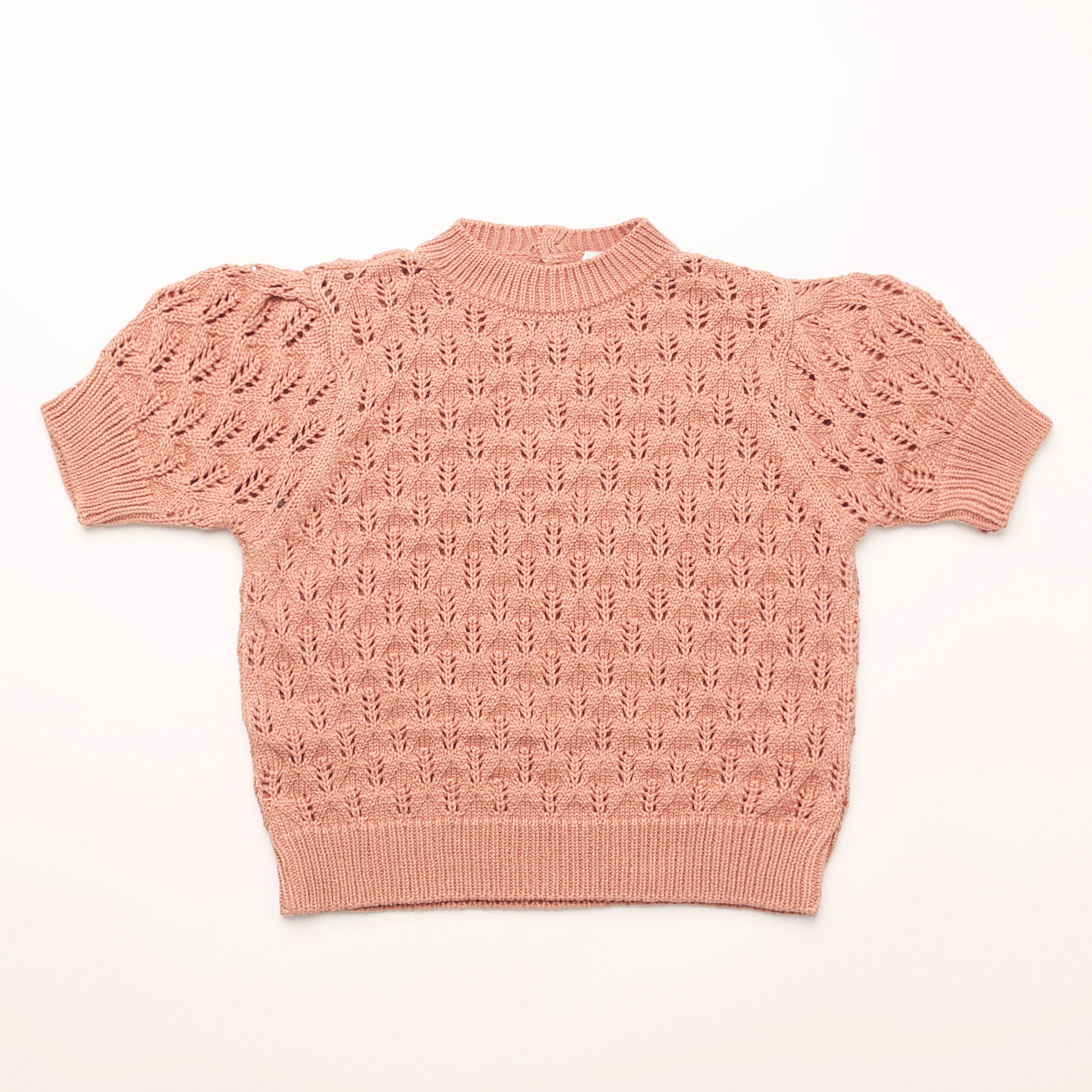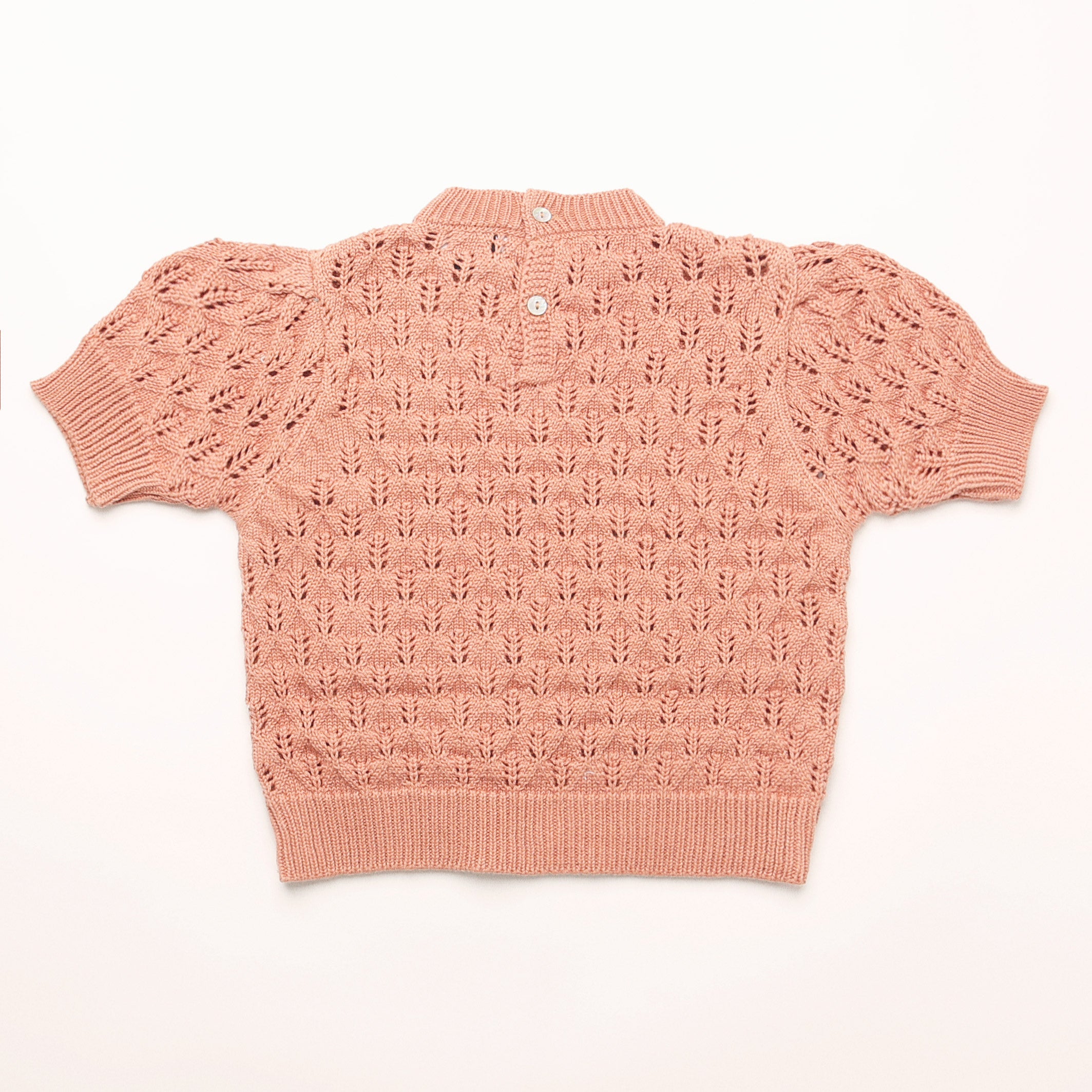 Short puff sleeved jumper with gathering on the shoulders and a T-shirt shape. Knit is a small detailed openwork texture and is contrasted with ribbed cuffs, neck and hem. Made from clay organic cotton yarn, a perfect shade to match & layer with the collection.