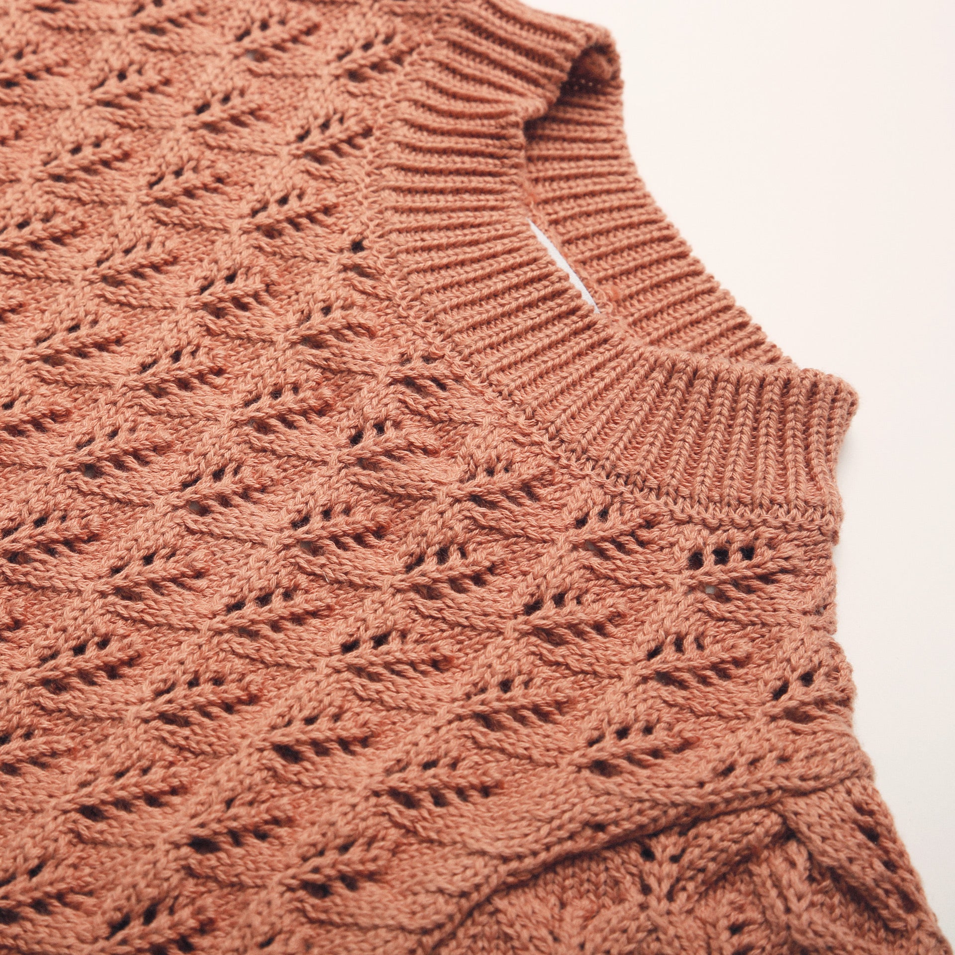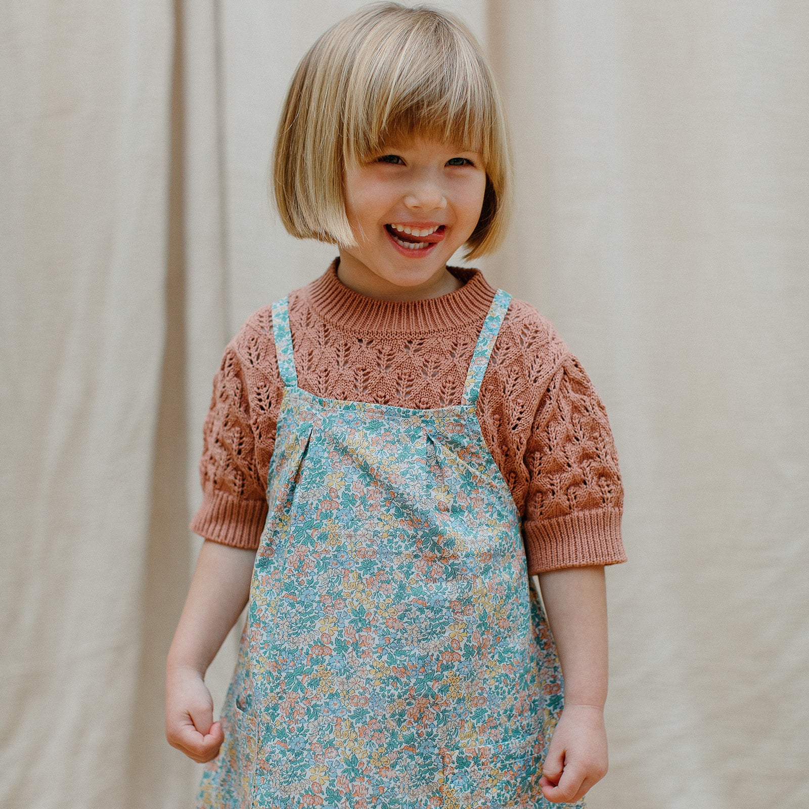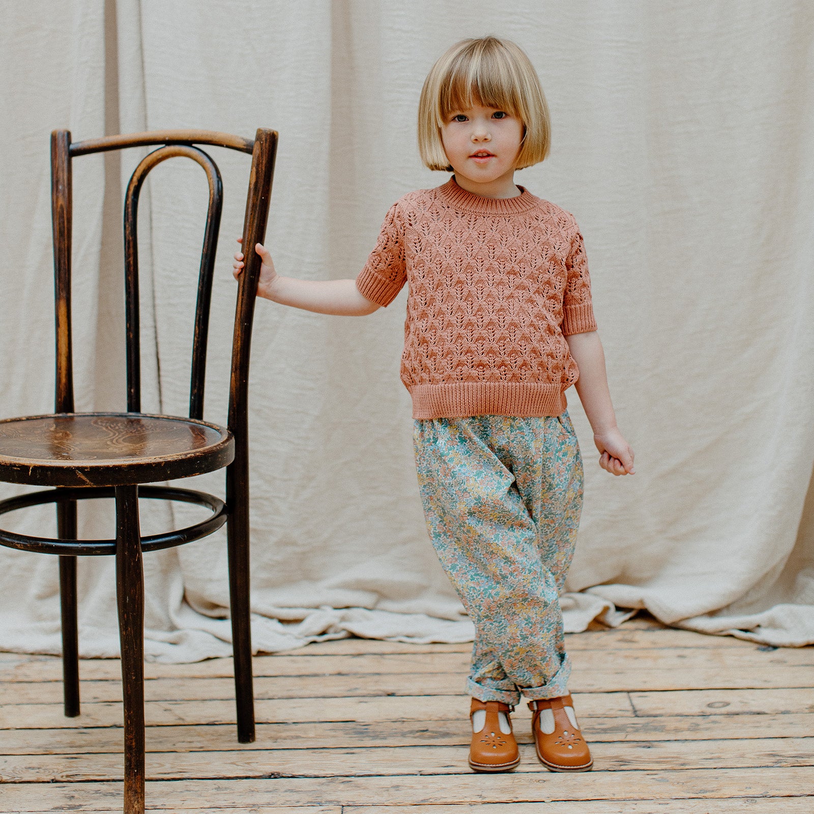 Short puff sleeved jumper with gathering on the shoulders and a T-shirt shape. Knit is a small detailed openwork texture and is contrasted with ribbed cuffs, neck and hem. Made from clay organic cotton yarn, a perfect shade to match & layer with the collection.