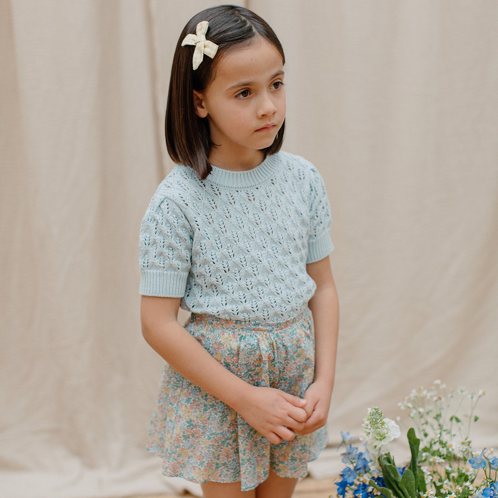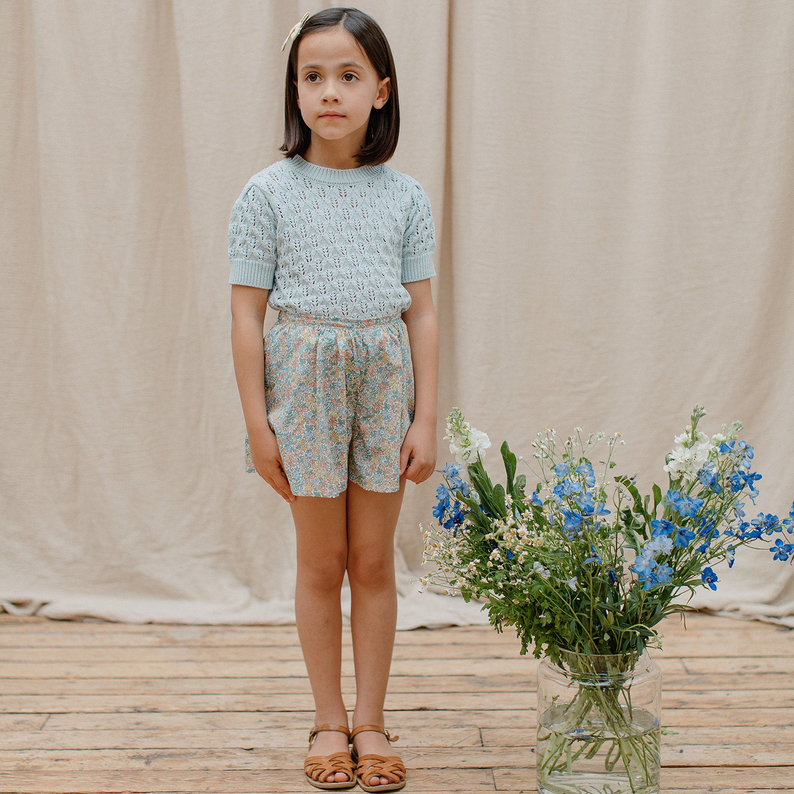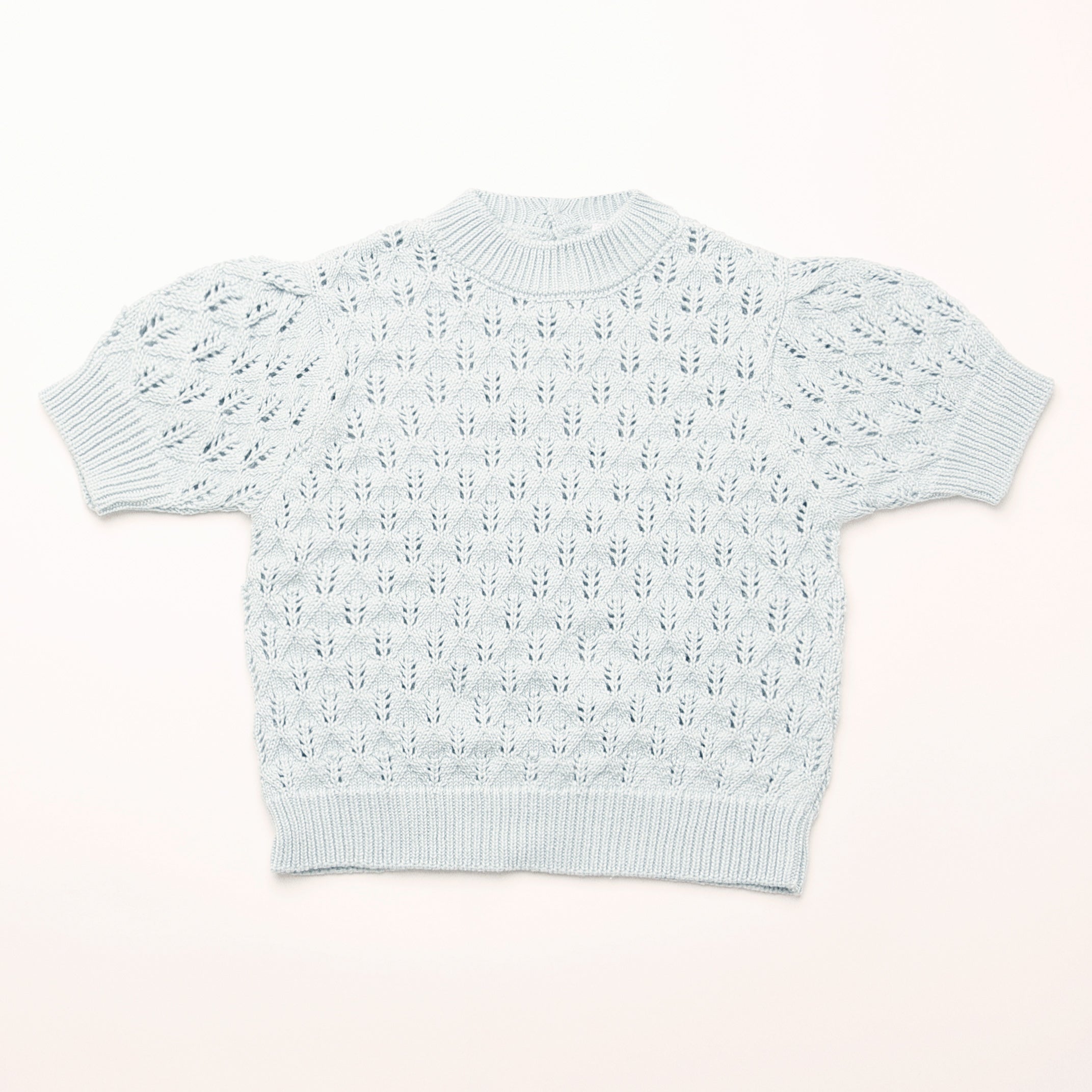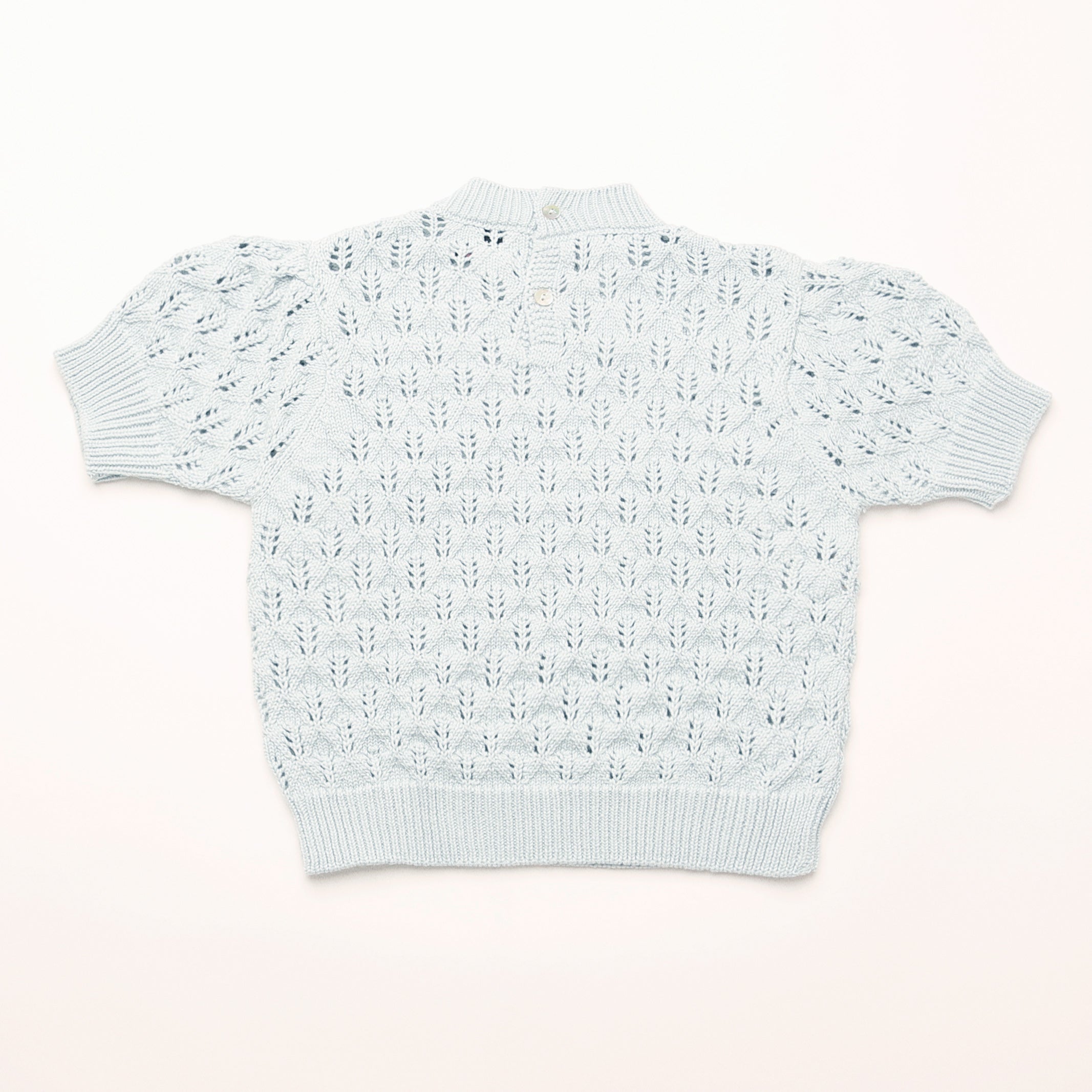Short puff sleeved jumper with gathering on the shoulders and a T-shirt shape. Knit is a small detailed openwork texture and is contrasted with ribbed cuffs, neck and hem. Made from powder blue organic cotton yarn, a perfect shade to match & layer with the collection.