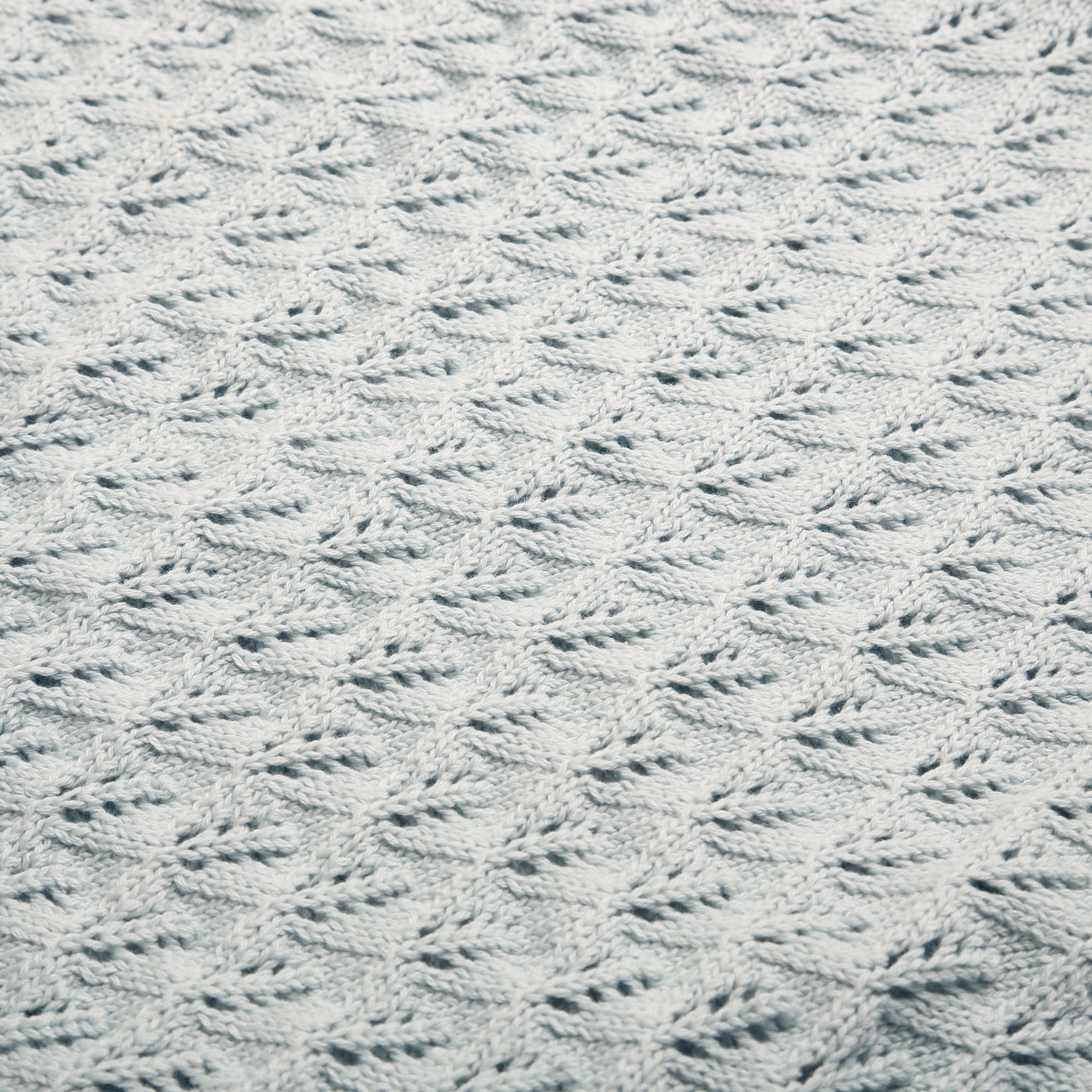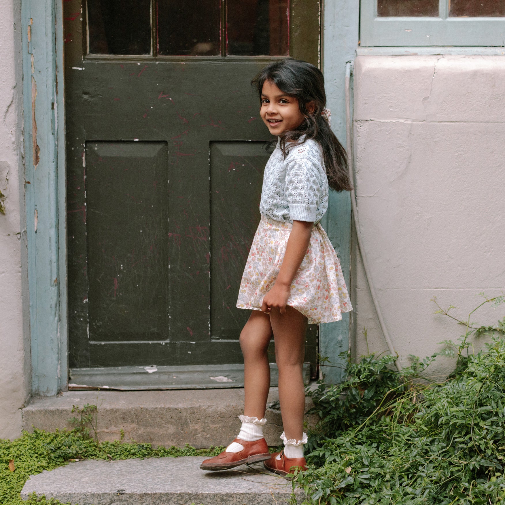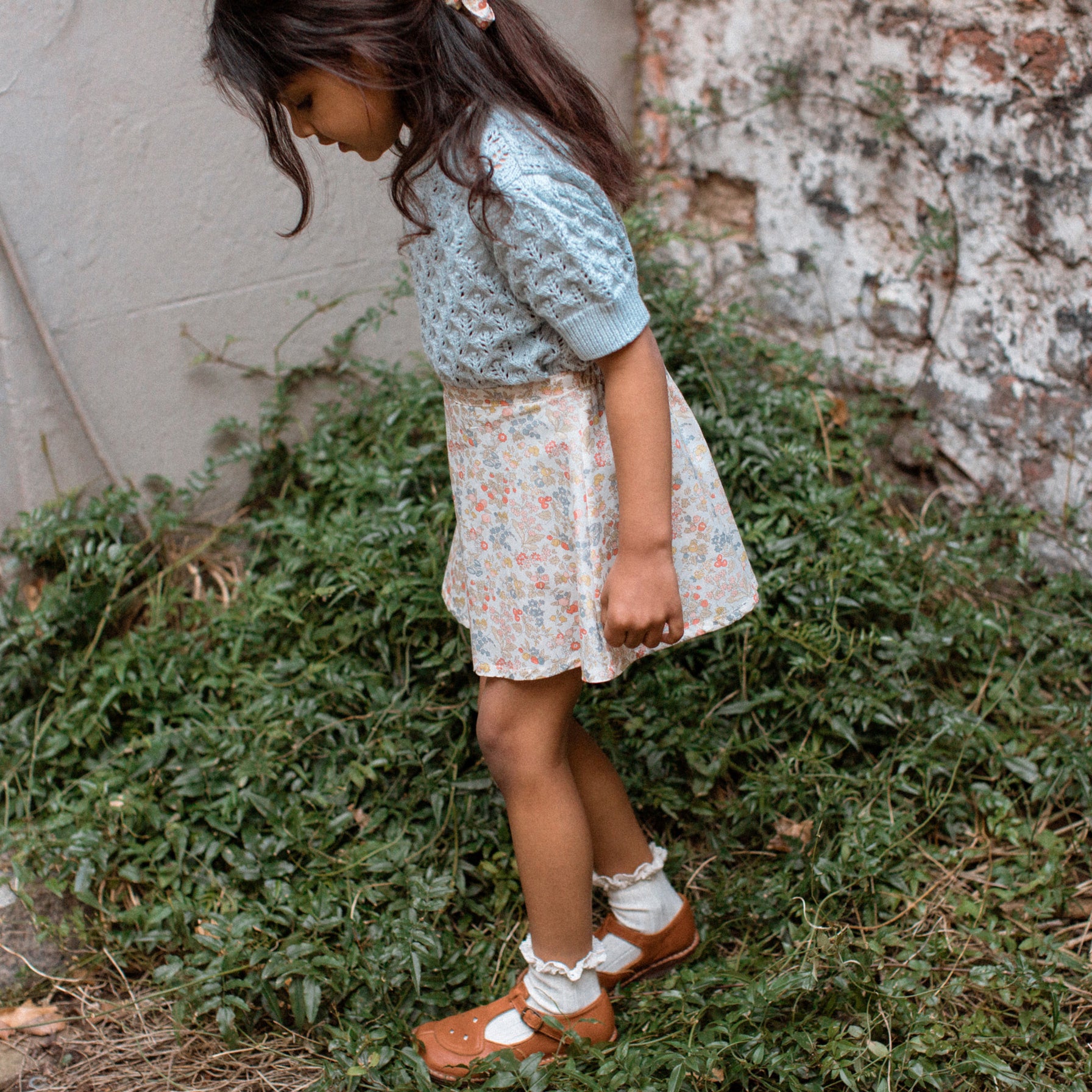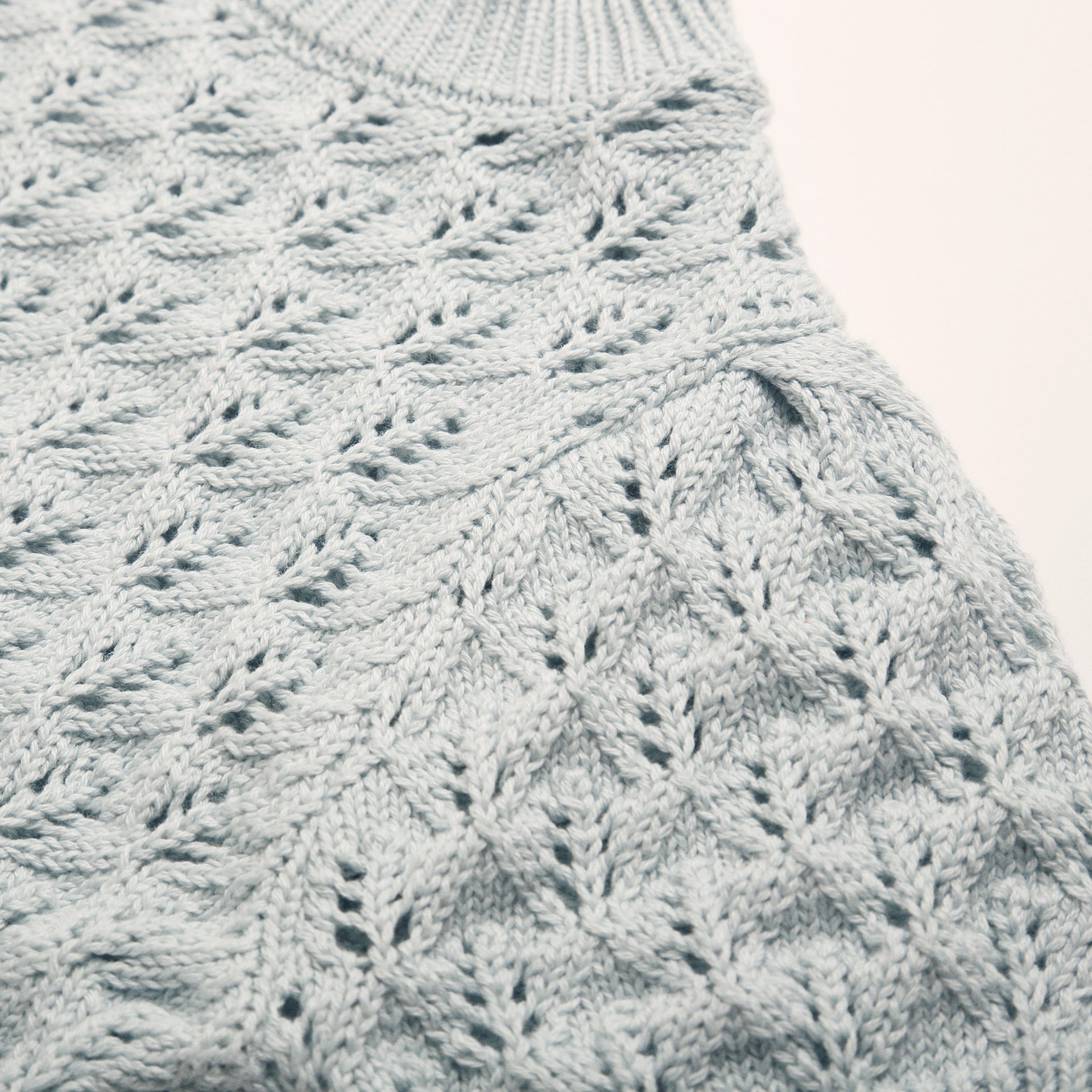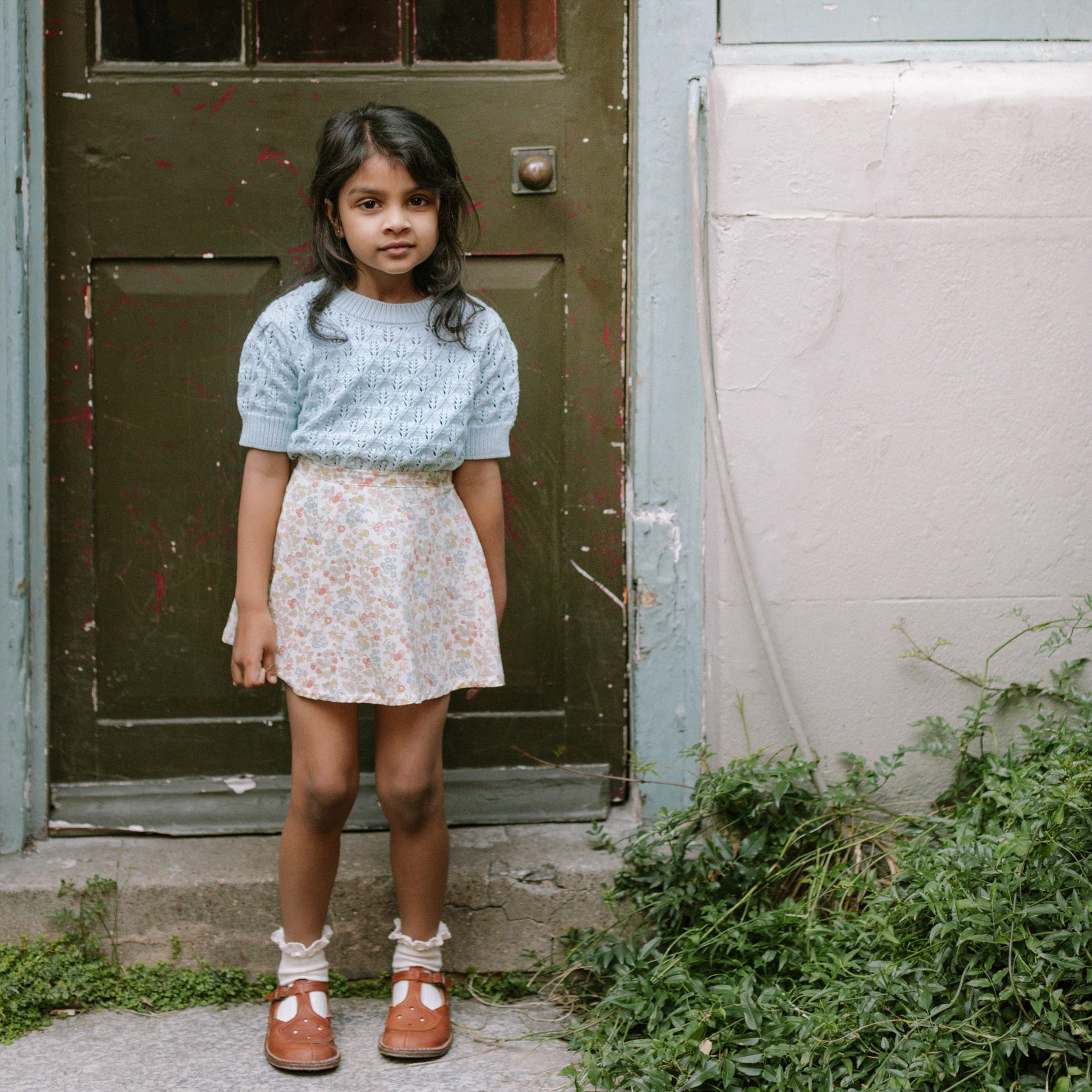Short puff sleeved jumper with gathering on the shoulders and a T-shirt shape. Knit is a small detailed openwork texture and is contrasted with ribbed cuffs, neck and hem. Made from powder blue organic cotton yarn, a perfect shade to match & layer with the collection.